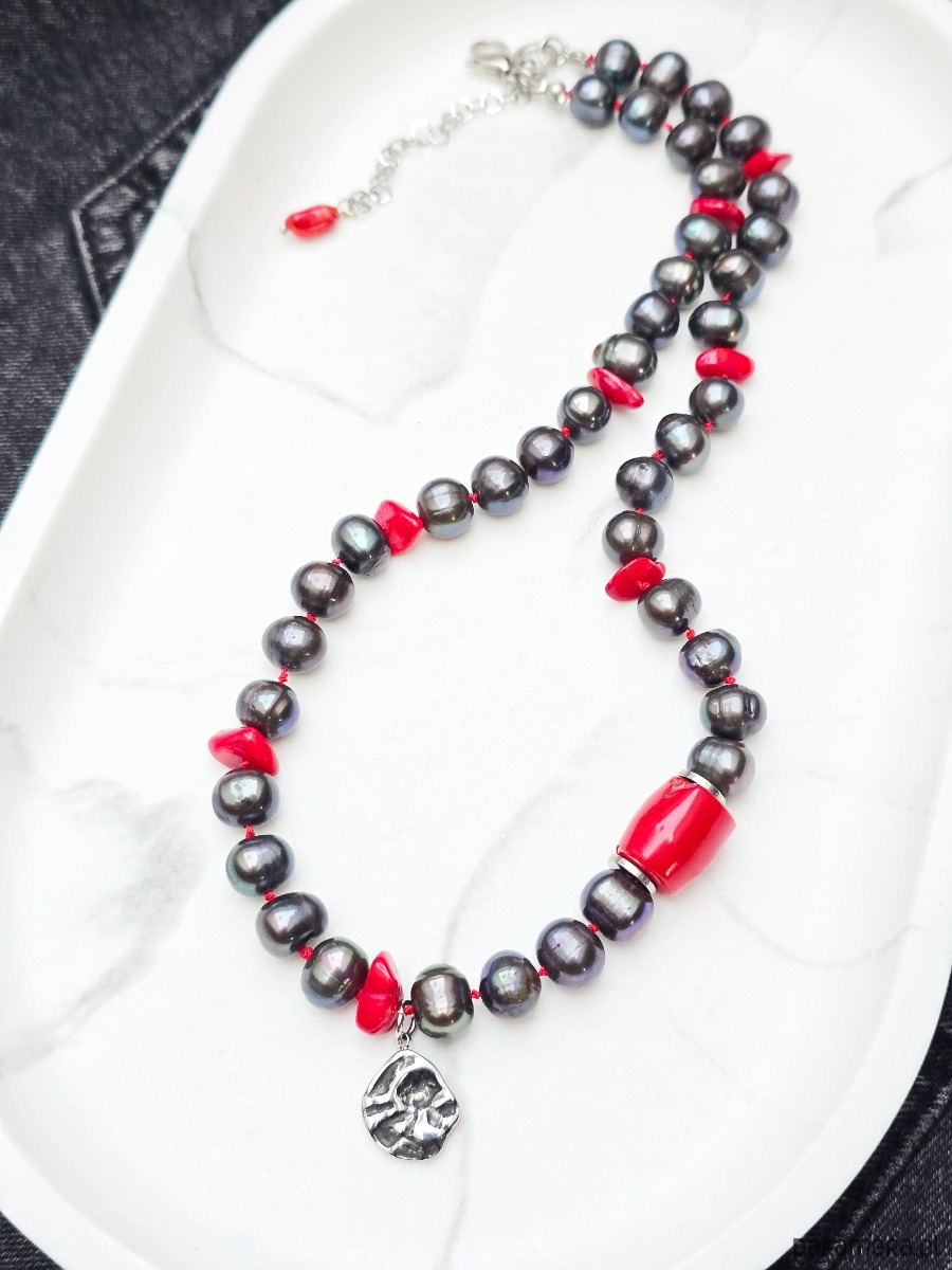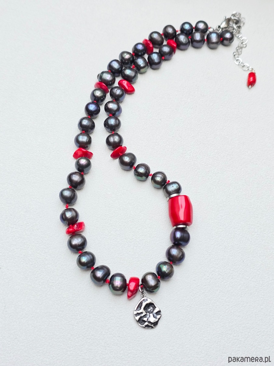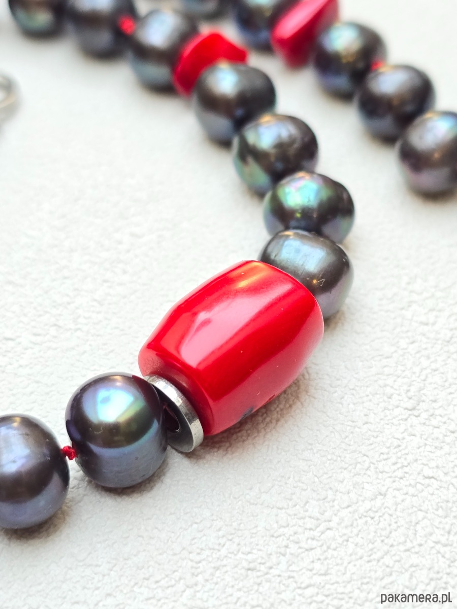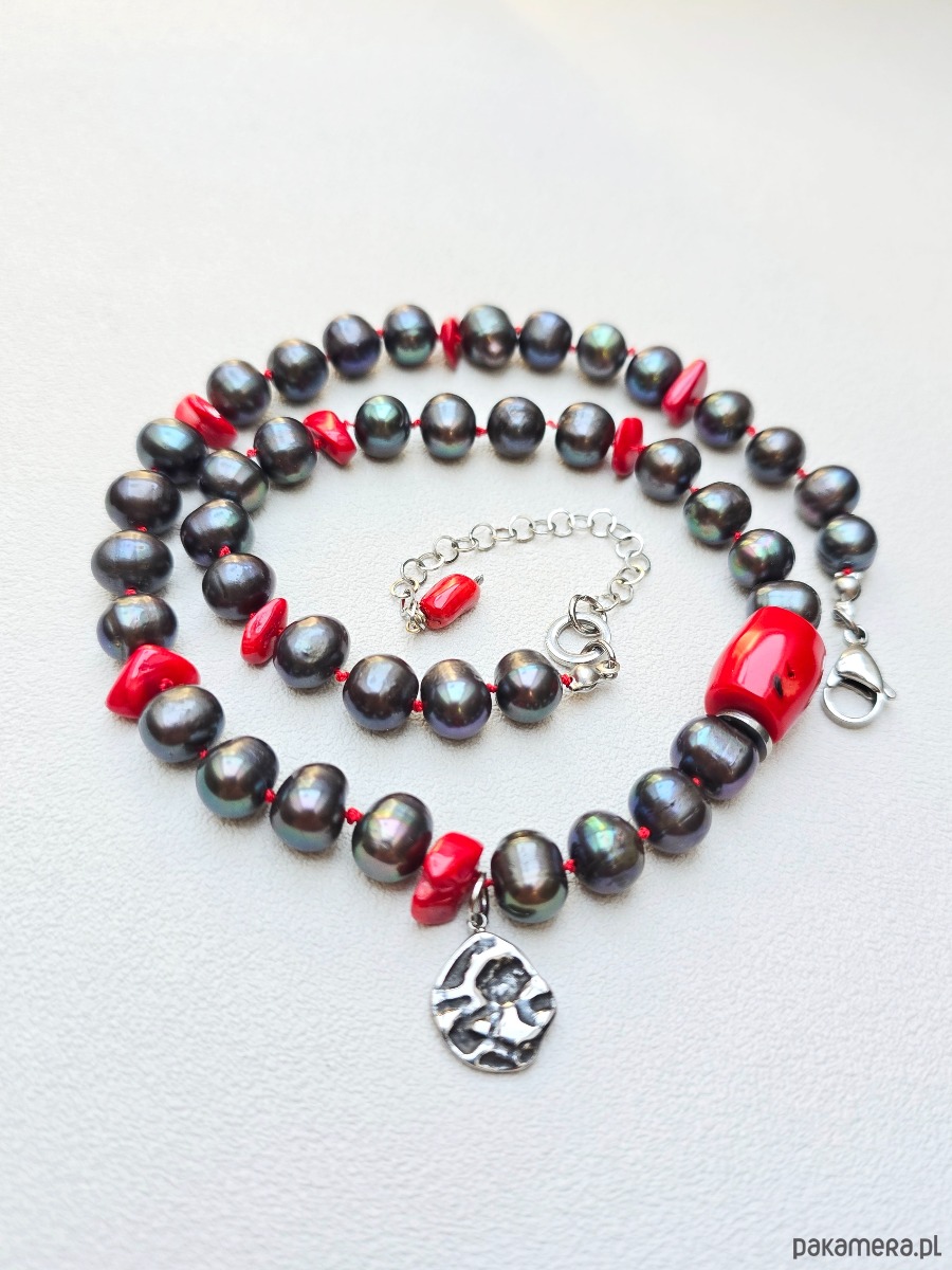 Unikatowy, supełkowany na jedwabnej nici naszyjnik z grafitowych pereł o średnicy ok 9mm. W naszyjnik wkomponowane są nieregularne-małe, oraz duża bryłka korala czerwonego. Wykończony w stali szlachetnej.
