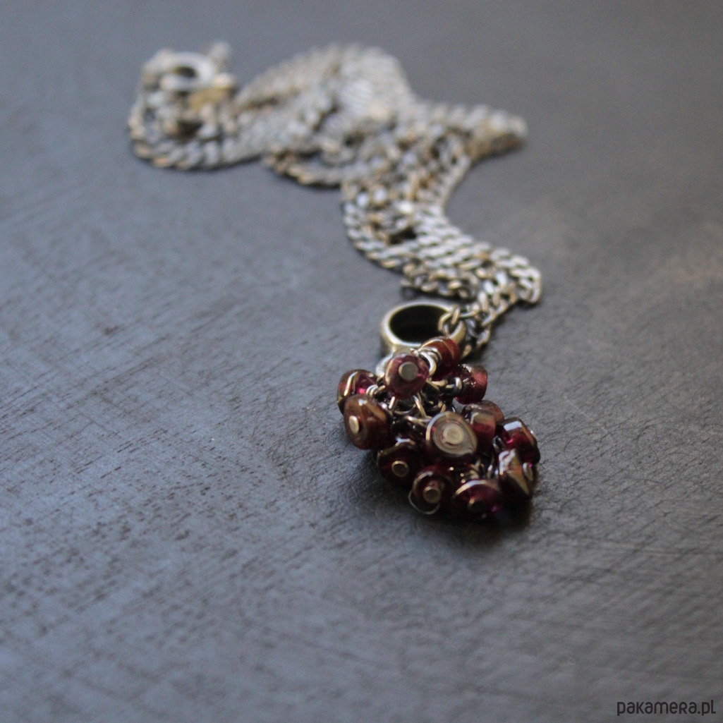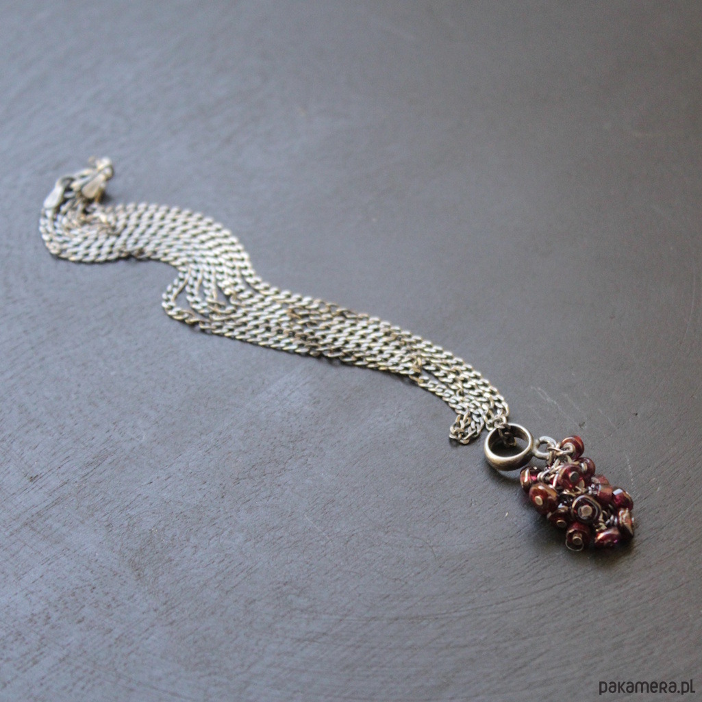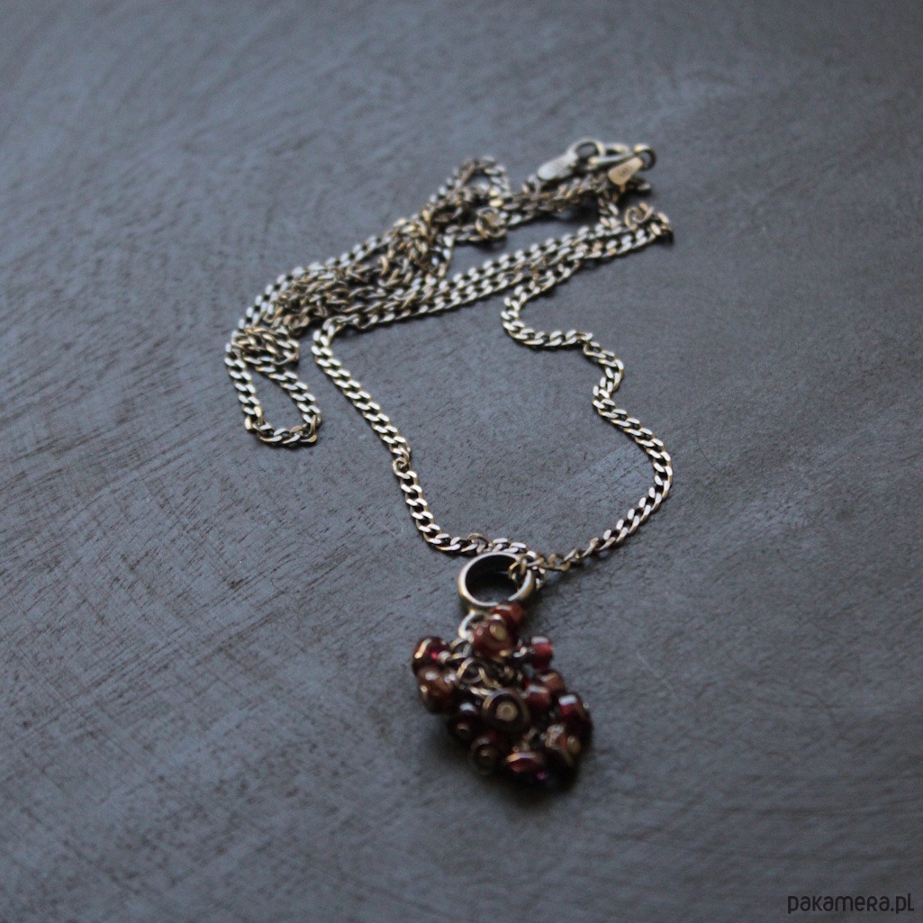 Unikatowy naszyjnik wykonany został z mocno oksydowanego srebra próby 925 oraz plastrów granatu wielkości 0.2 cm.
