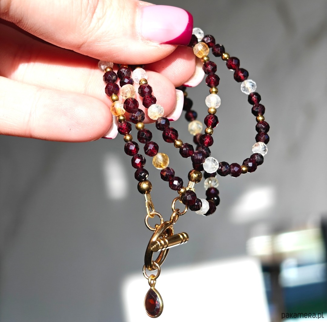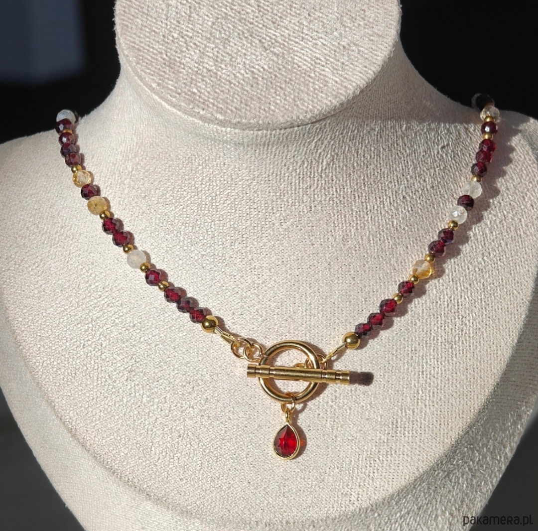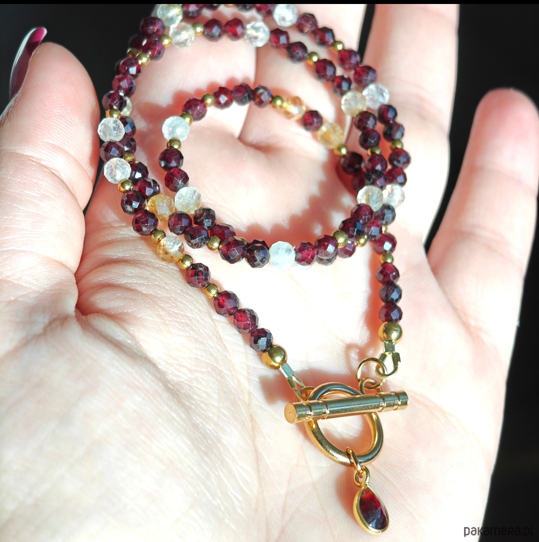 Delikatny naszyjnik z naturalnego granatu oraz cytrynu z zawieszką w kształcie subtelnej łezki, oprawionej w srebro pozłacane. Ciepły blask kamienia pięknie odbija światło, dodając elegancji na co dzień i od święta. Łańcuszek ma długość 44 cm, a zawieszka 1 cm. Granat wnosi energię odwagi, a cytryn – jasność i lekkość. Razem tworzą talizman, który dodaje mocy, ale wciąż pozostaje delikatny.