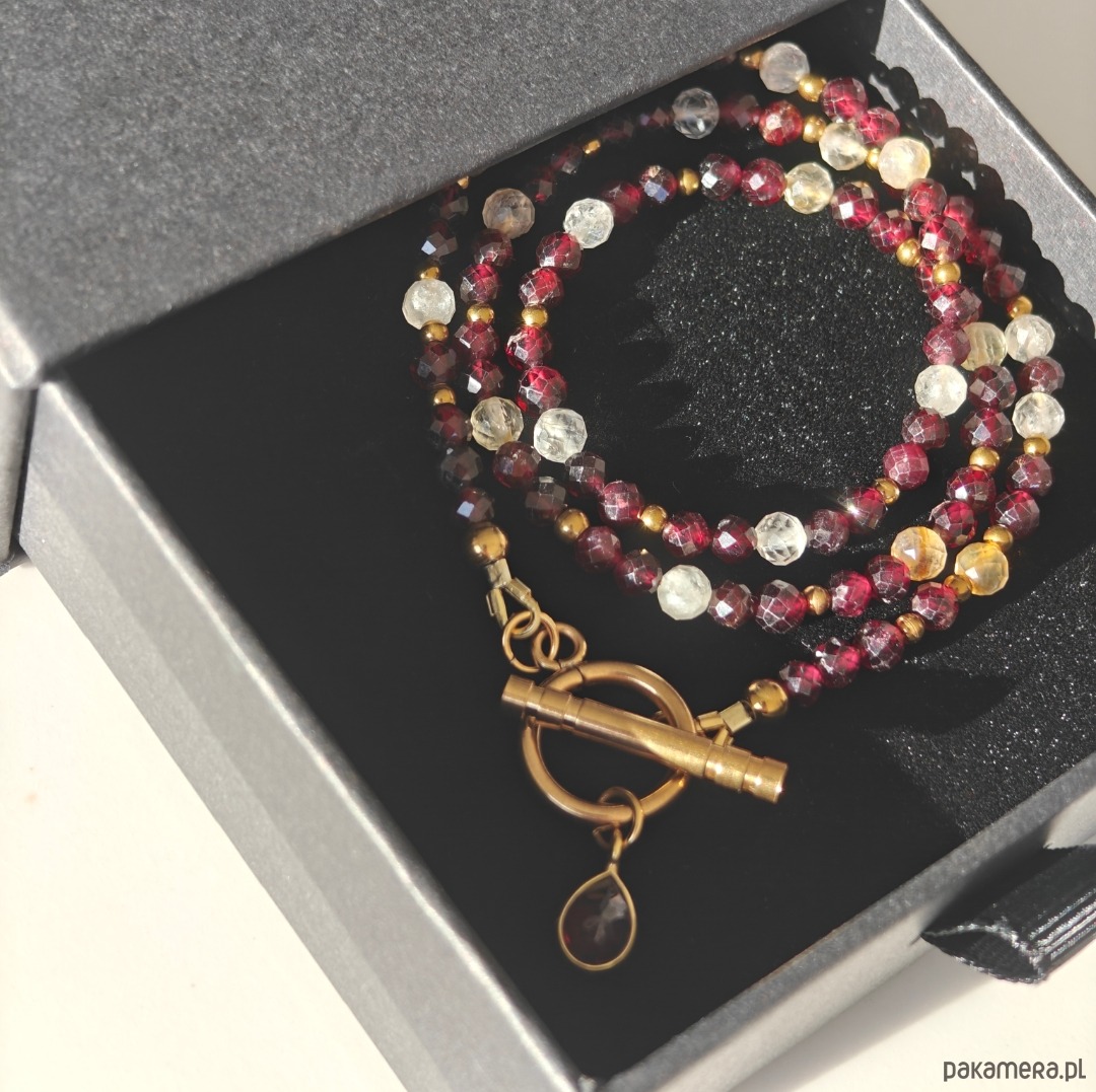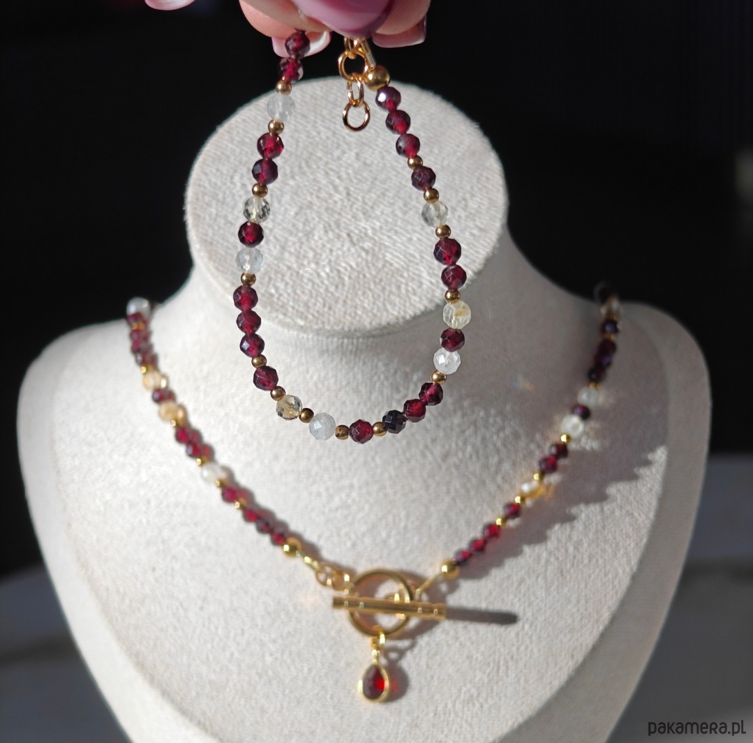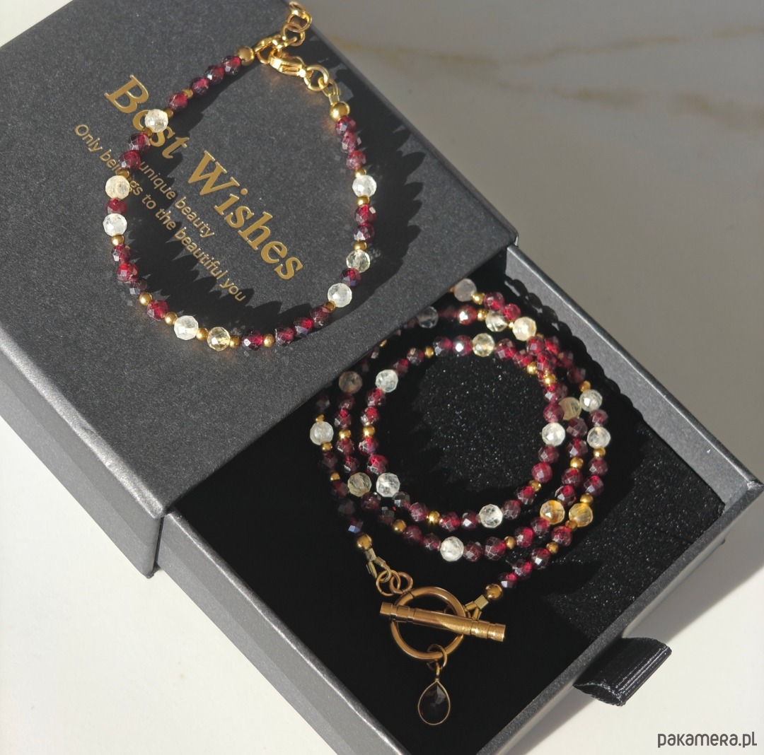 Delikatny naszyjnik z naturalnego granatu oraz cytrynu z zawieszką w kształcie subtelnej łezki, oprawionej w srebro pozłacane. Ciepły blask kamienia pięknie odbija światło, dodając elegancji na co dzień i od święta. Łańcuszek ma długość 44 cm, a zawieszka 1 cm. Granat wnosi energię odwagi, a cytryn – jasność i lekkość. Razem tworzą talizman, który dodaje mocy, ale wciąż pozostaje delikatny.