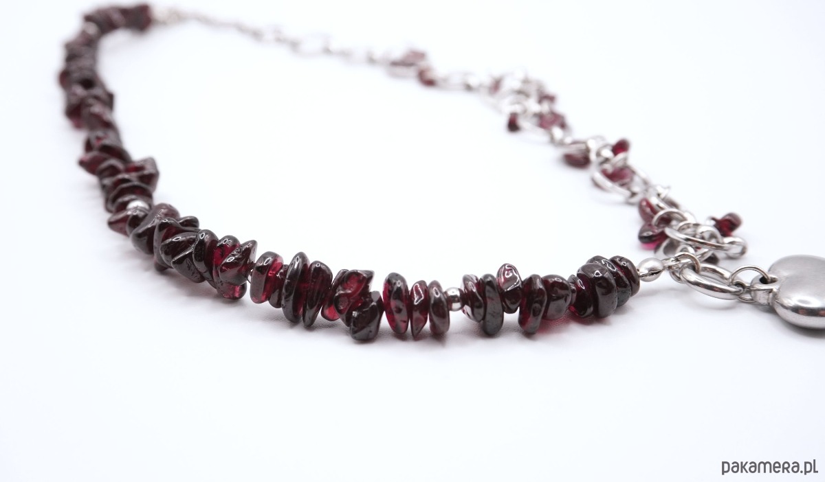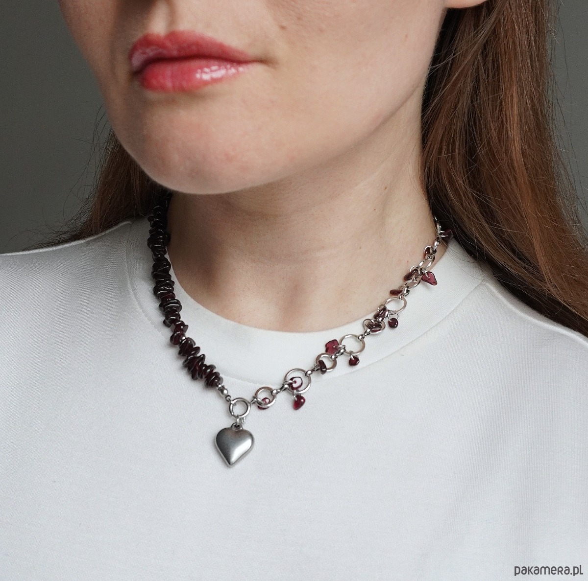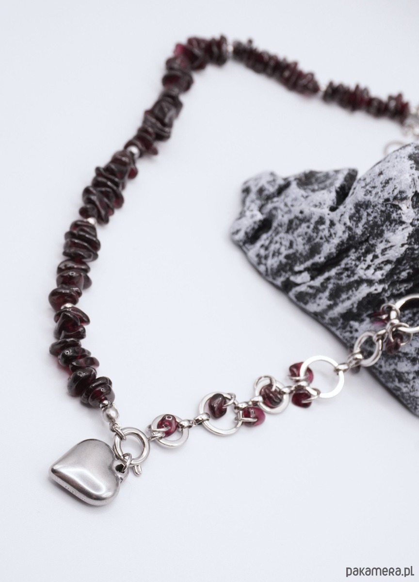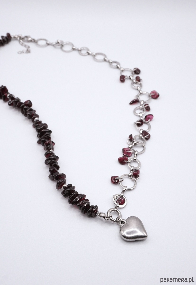 Elegancki naszyjnik z naturalnego granatu — biżuteria z charakterem i głębokim znaczeniem. Nasycone bordo-winne odcienie kamienia pięknie mienią się w ruchu i podkreślają kobiecość stylizacji. Asymetryczny design łączy naturalną fakturę granatowego grysu z nowoczesnym metalowym łańcuszkiem, tworząc stylową równowagę między klasyką a minimalizmem.