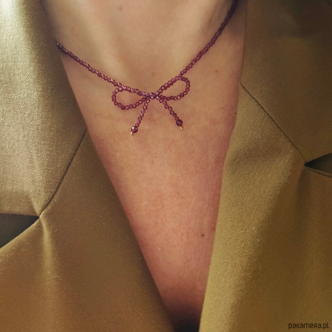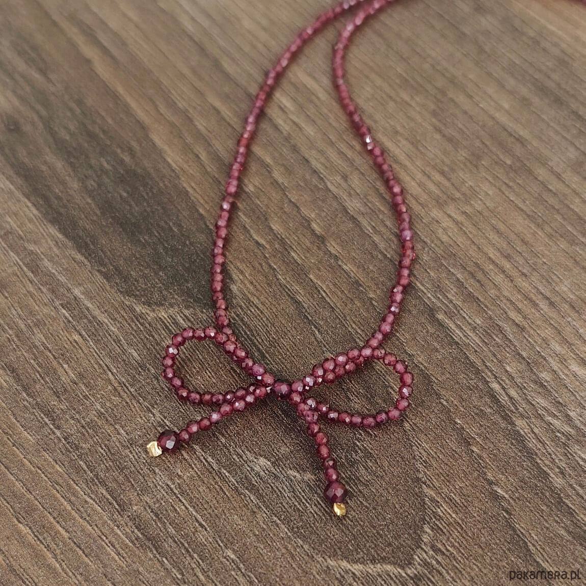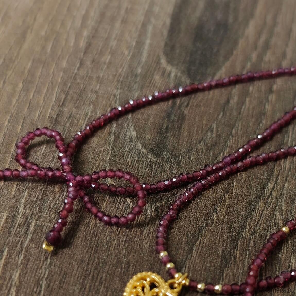Naszyjnik z kamieni granatu oraz z elementów srebra pozłacanego 24 karatowym, żółtym złotem. Na środku naszyjnika znajduje się kokardka zrobiona z kamieni granatu.