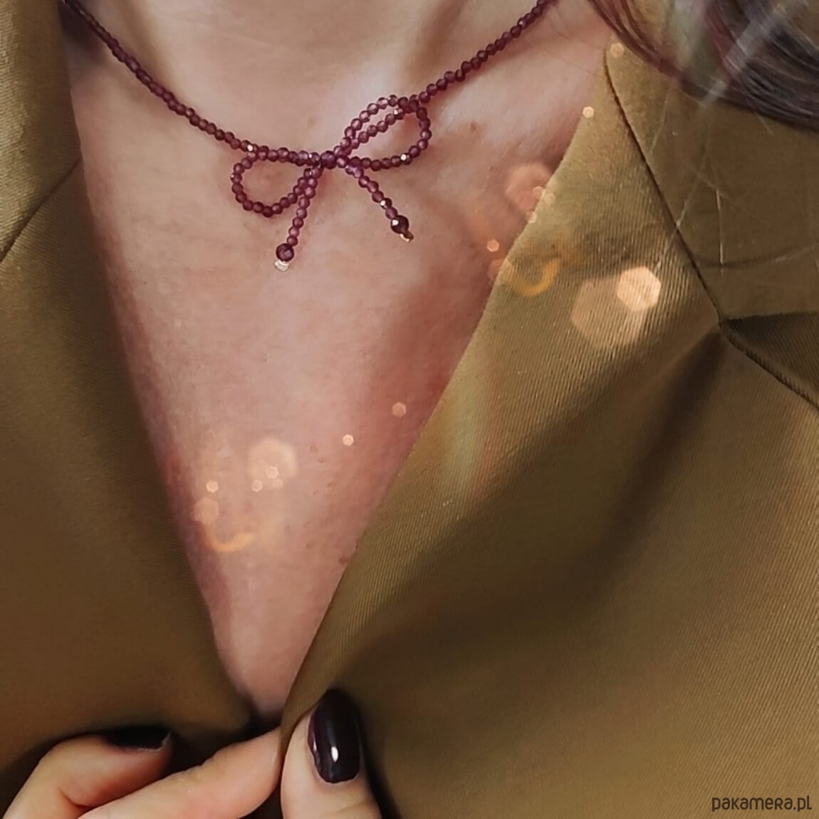 Naszyjnik na szyi prezentuje się niezwykle elegancko i kobieco. Delikatne kamienie granatu są bardzo błyszczące co dodaje naszyjnikowi szyku i elegancji. Ekstrawagancki, niezwykle modowy akcent w postaci starannie wykonanej kokardki nadaje naszyjnikowi dziewczęcego, urokliwego charakteru. Zwracający uwagę naszyjnik to must have stylizacji wyjściowej. Połącz go z innymi modelami biżuterii z kamieniami granatu.