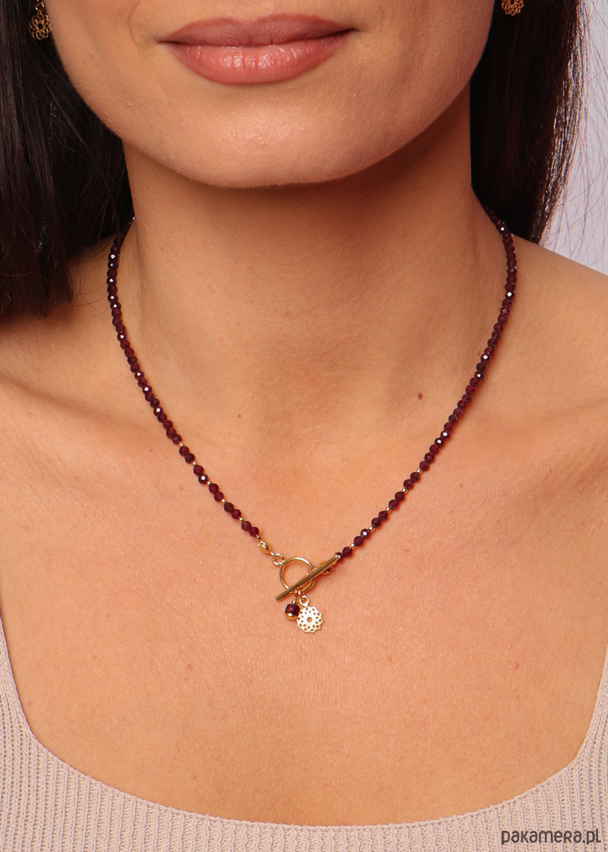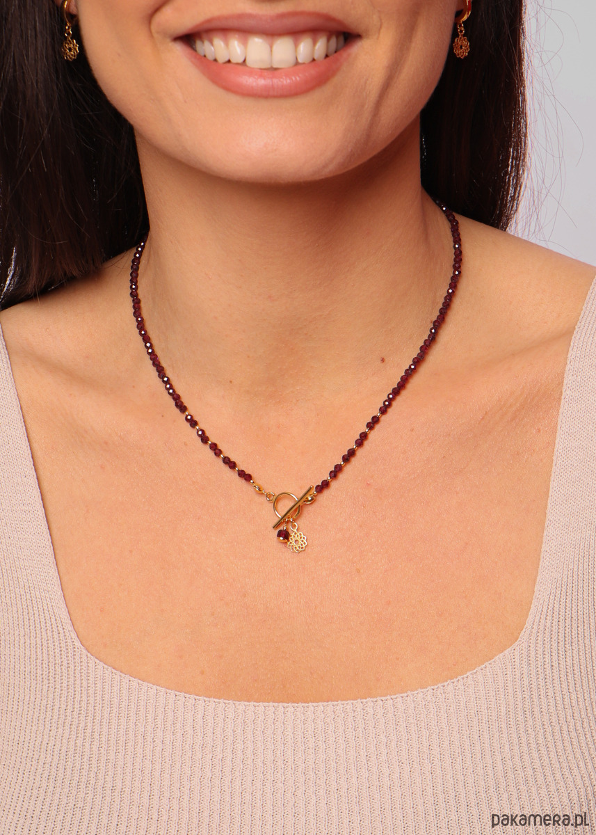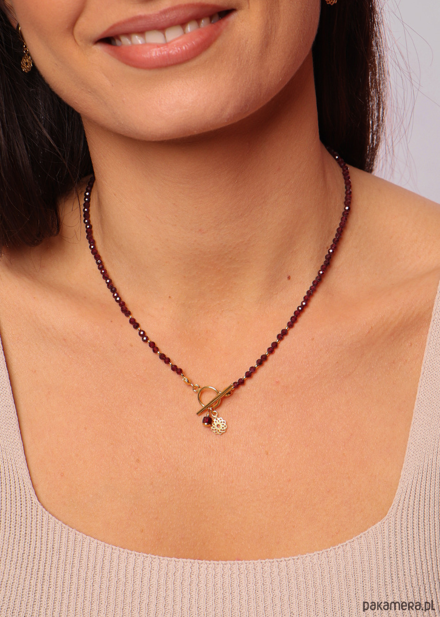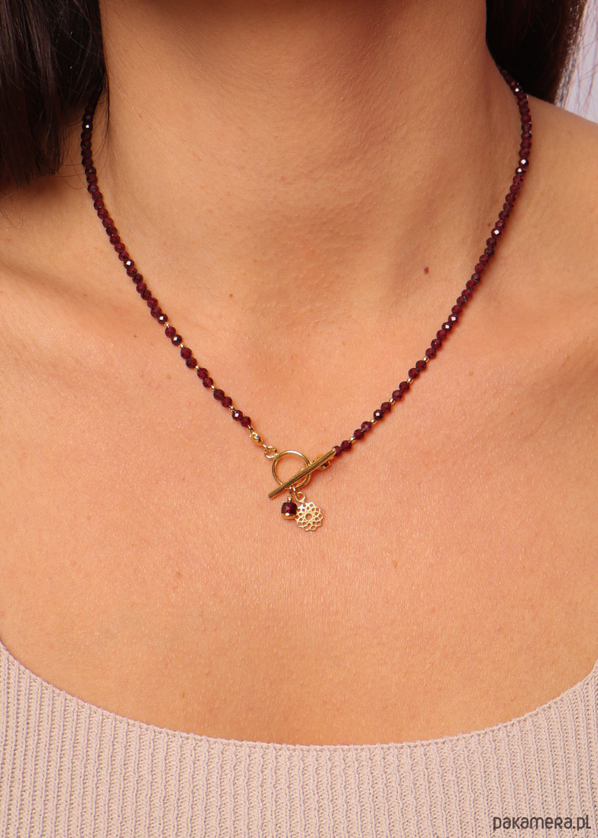Cechy produktuKamień: granat Wielkość kamieni: ok. 3 mmKolor: bordowy Wykończenie: srebro pr. 925, pozłacane 24k złotemMożliwość wyboru zawieszki Idealny na prezentWłaściwość kamieniaGranat to kamień dla nieśmiałych, osób wzbraniających się przed wyjściem z własnej strefy komfortu. Ma dodawać odwagi, pomóc w podejmowaniu ciężkich decyzji, przeprowadzać przez życiowe zmiany. Naszyjnik będzie idealnym pomysłem na prezent. Biżuteria, ręcznie wykonywana z granatu wpisuje się w obecne trendy, dzięki czemu możesz mieć pewność, że zachwyci obdarowaną osobę. Nasz naszyjnik z granatu jest uniwersalnym, eleganckim elementem ubioru, który obłędnie wyglądać będzie w zestawieniu z każdą stylizacją. OpakowanieNaszyjnik zapakowany będzie w minimalistyczne, granatowe pudełeczko ze złotym logo. Wewnątrz pudełeczka znajdziesz białą wkładkę z nazwą kamienia oraz jego wyjątkowymi właściwościami. Dbaj o biżuterię. Unikaj kontaktu z wodą, detergentami i kosmetykami.