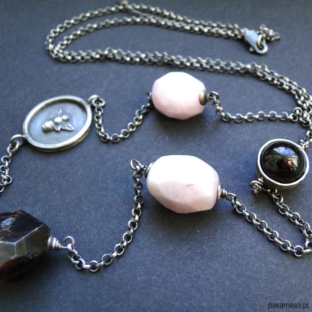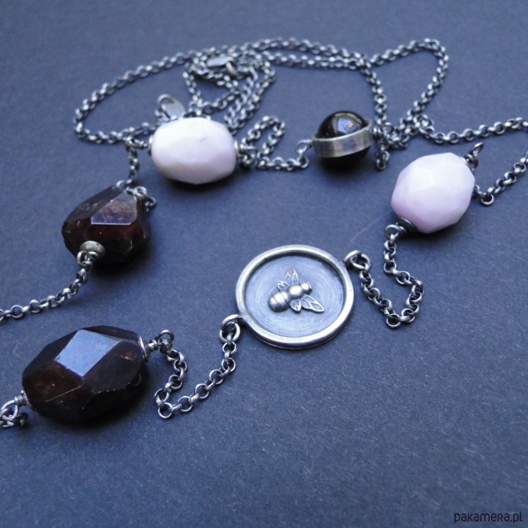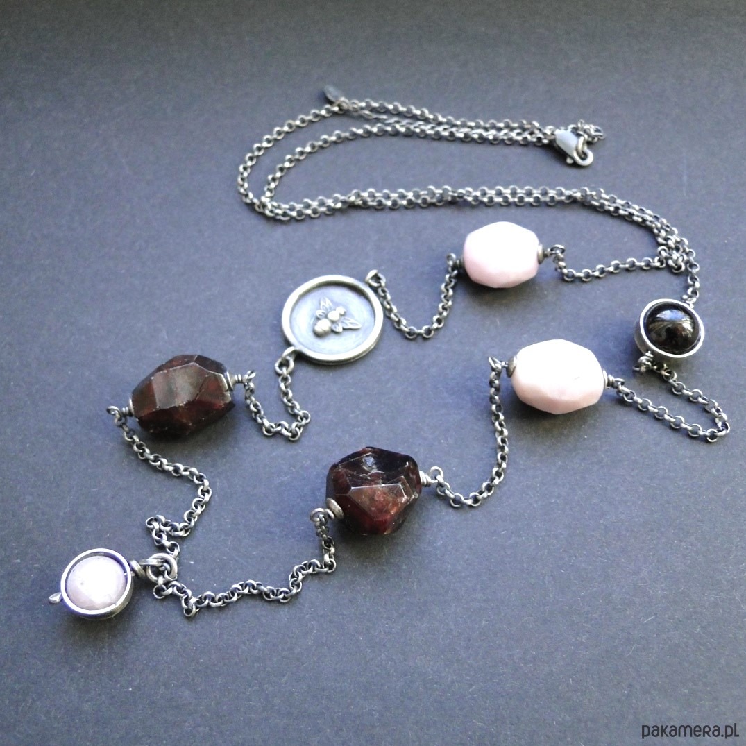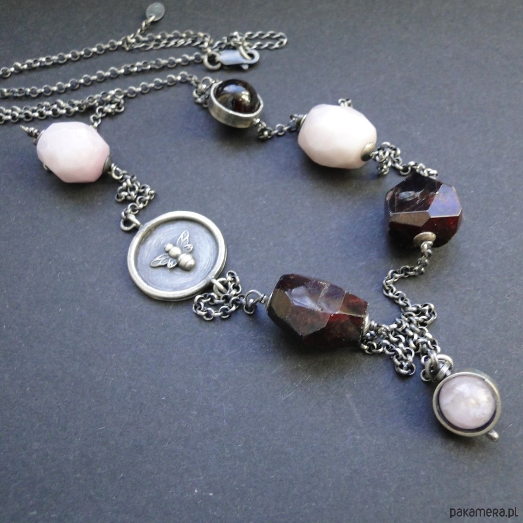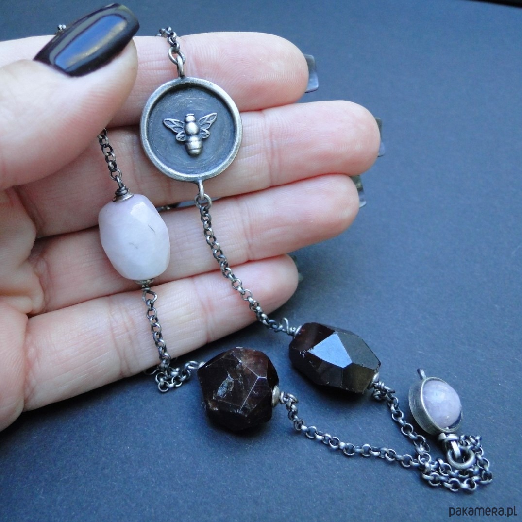 Surowy naszyjnik w modnej kolorystyce z przewagą bordo. Srebro 925,oksydowane i szorowane. Kamienie: bordowy granat i różowy kunzyt wielkości od 9 mm do 16 mm. Okrągłe kamienie w ręcznie wykonanych ramach. Urocza przekładka z pszczołą wykonana przeze mnie także ze srebra. Masywny łańcuch. Obwód całkowity - 86 cm plus przedłużka 7 cm. Ta krótka kolekcja z kunzytem obejmuje też kolczyki (jedyna para).