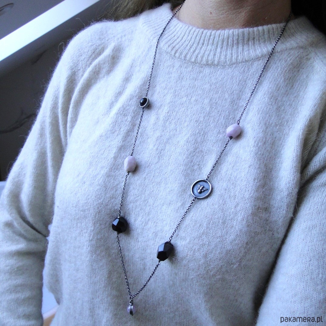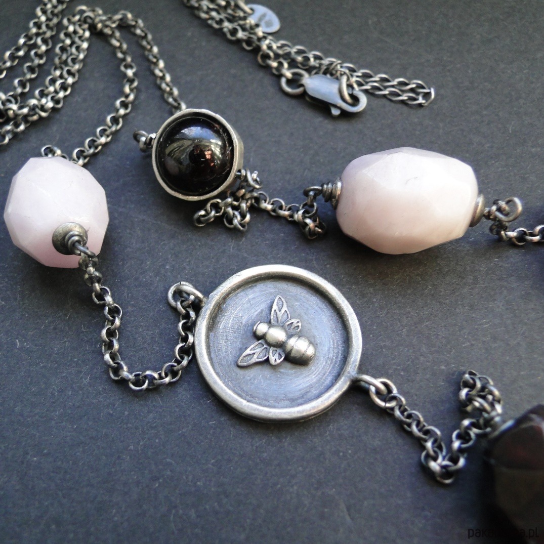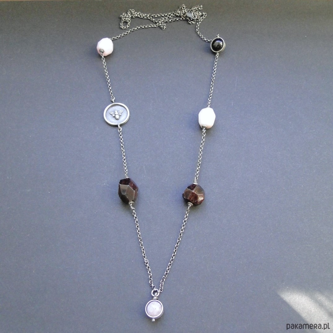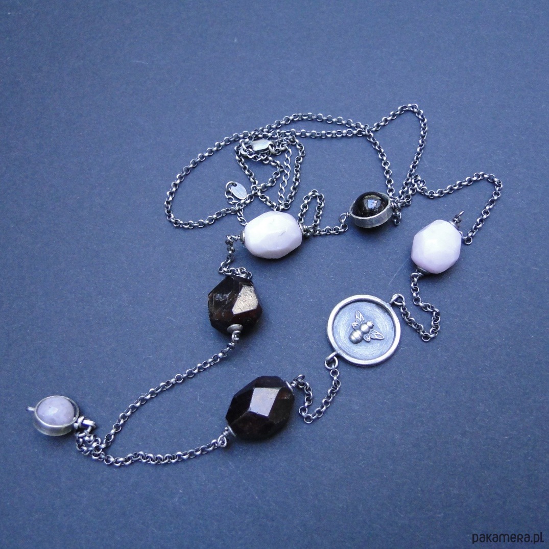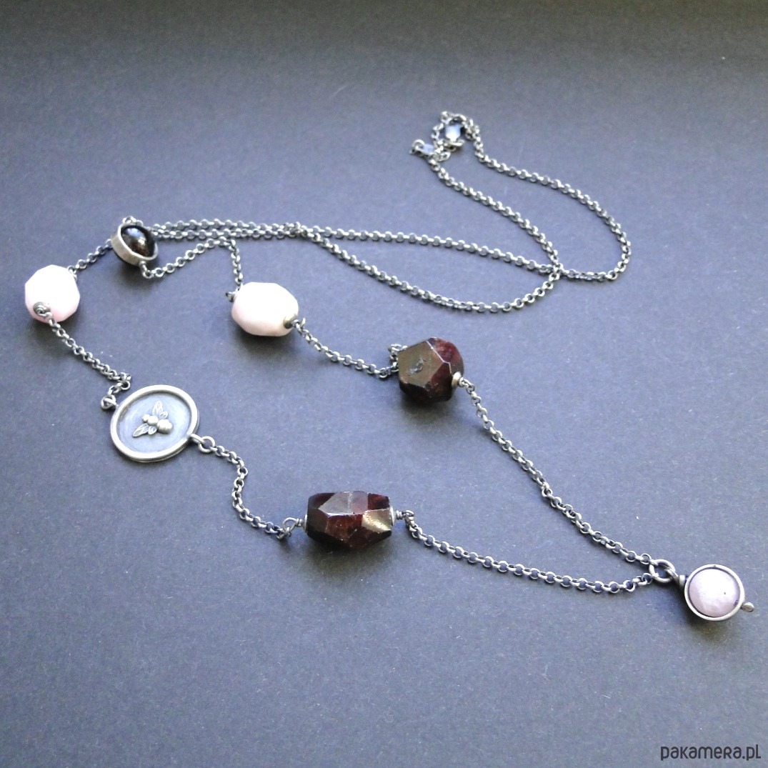 Surowy naszyjnik w modnej kolorystyce z przewagą bordo. Srebro 925,oksydowane i szorowane. Kamienie: bordowy granat i różowy kunzyt wielkości od 9 mm do 16 mm. Okrągłe kamienie w ręcznie wykonanych ramach. Urocza przekładka z pszczołą wykonana przeze mnie także ze srebra. Masywny łańcuch. Obwód całkowity - 86 cm plus przedłużka 7 cm. Ta krótka kolekcja z kunzytem obejmuje też kolczyki (jedyna para).