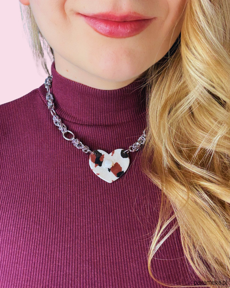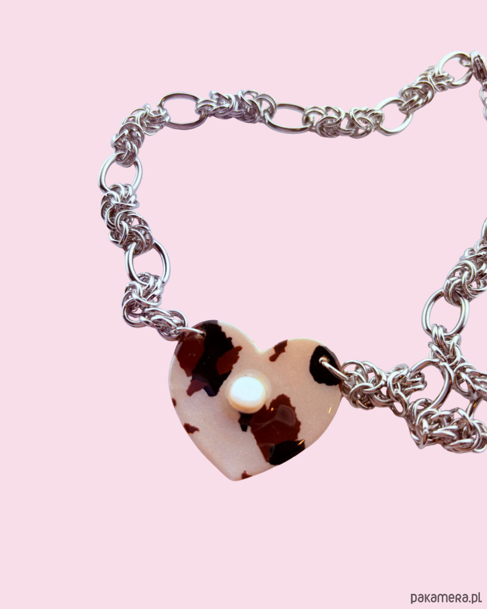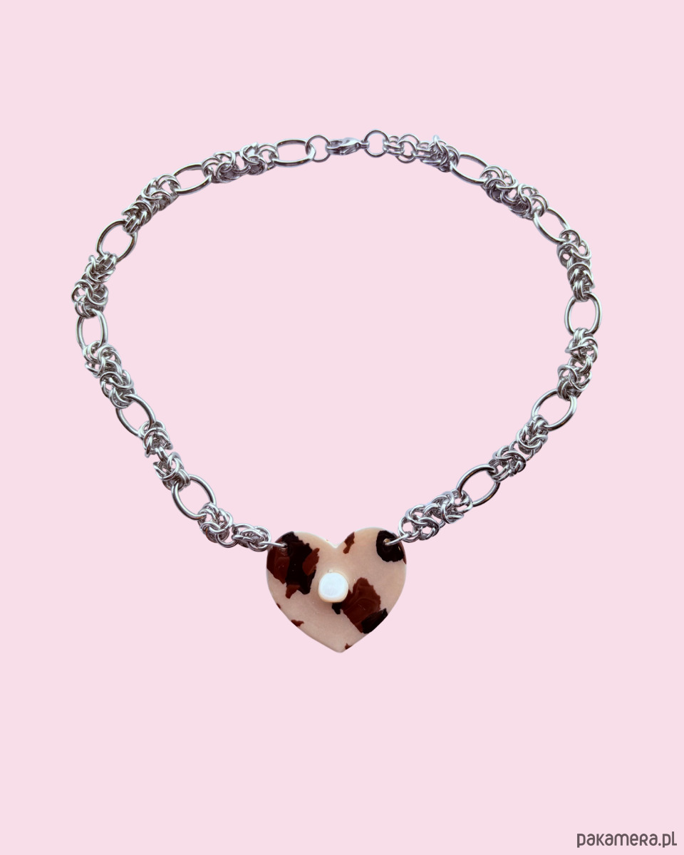 Naszyjnik gruby łańcuch z zawieszką serduszkową w krowie łaty