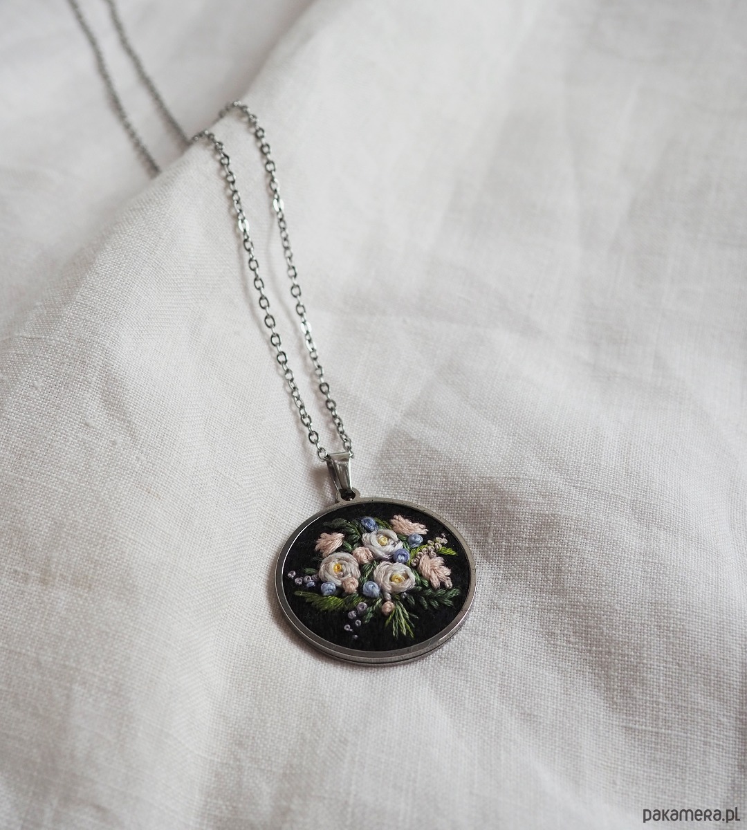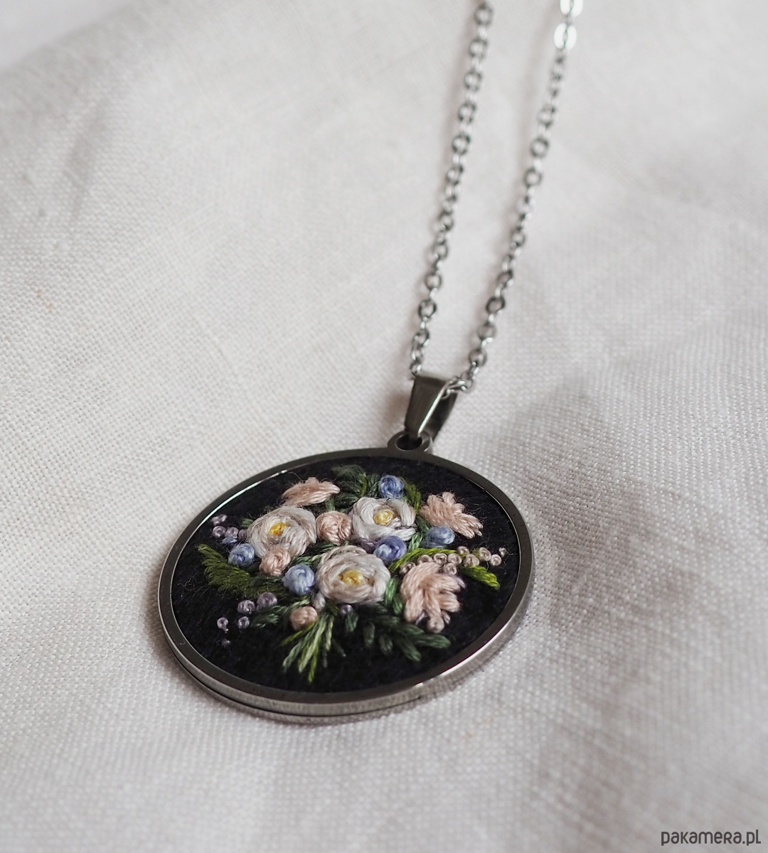 Naszyjnik z bukietem kwiatów w kolorach kremowej bieli, moreli i błękitu ręcznie haftowany na filcu polskimi nićmi z Łodzi. Baza ze stali szlachetnej o średnicy 33 mm przetrwa dłużej niż metalowe, które stosowałam do tej pory. W komplecie znajduje się łańcuszek ze stali chirurgicznej o długości ok. 60 cm. Na życzenie mogę zamienić łańcuszek na krótszy, np. 50cm.
