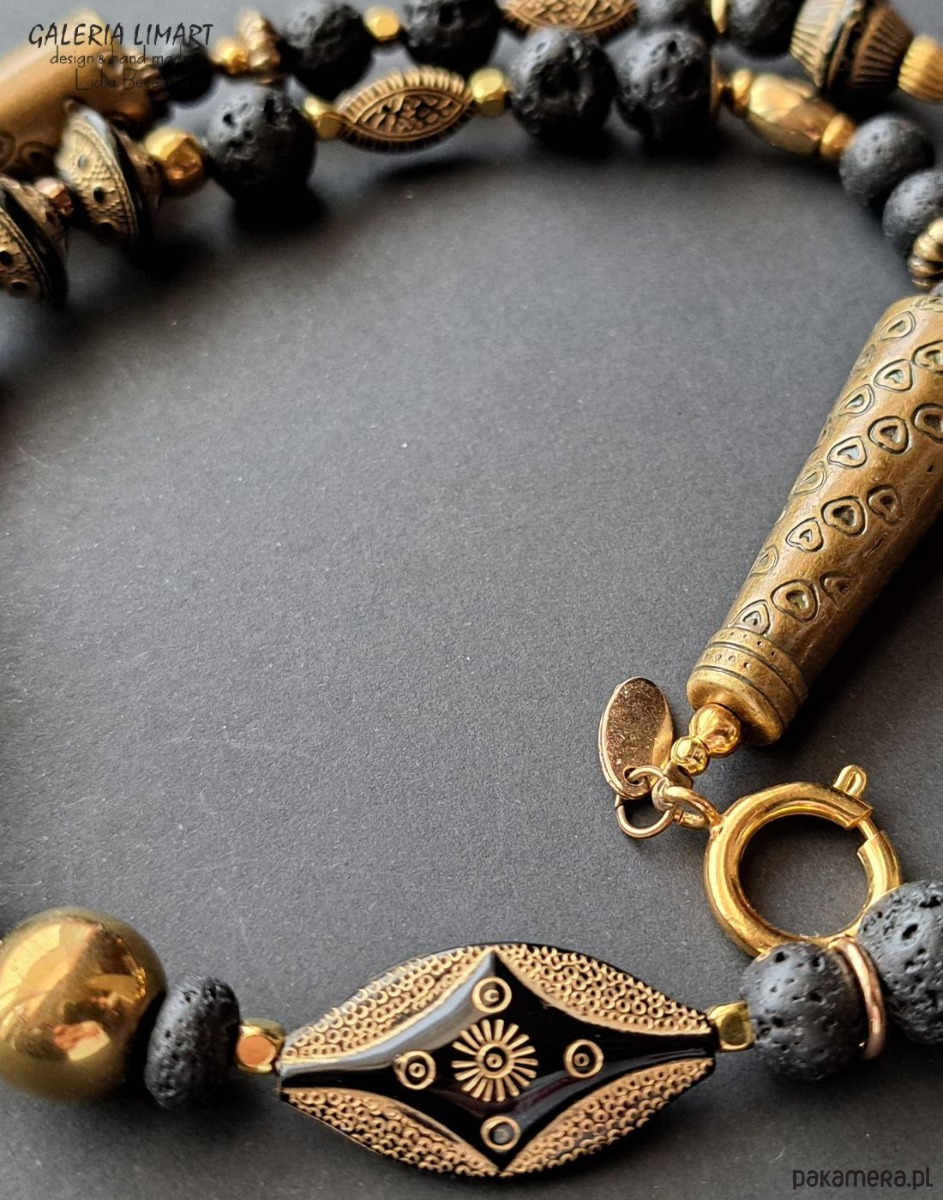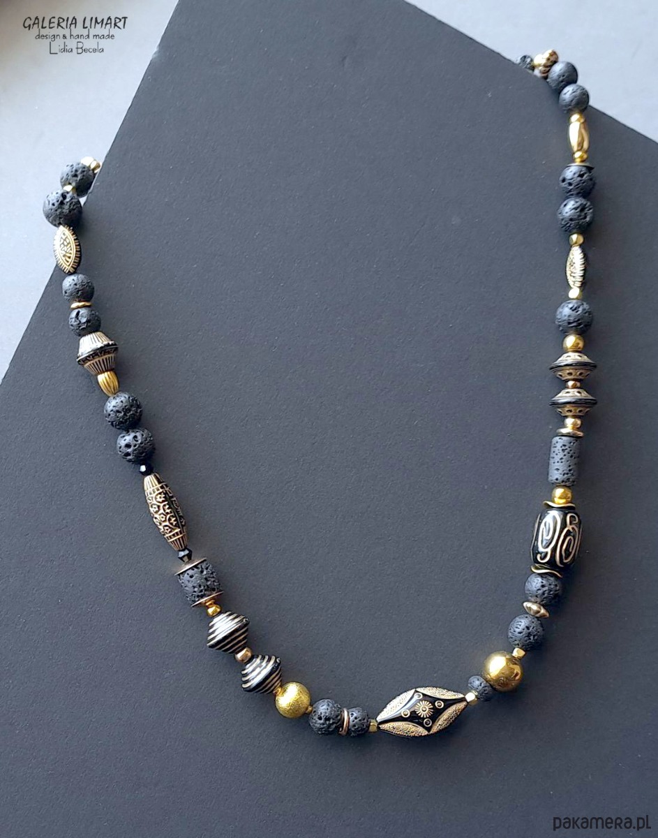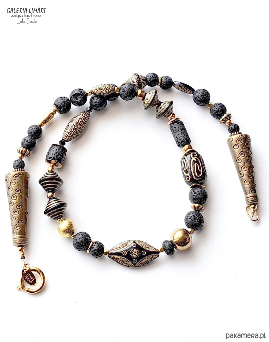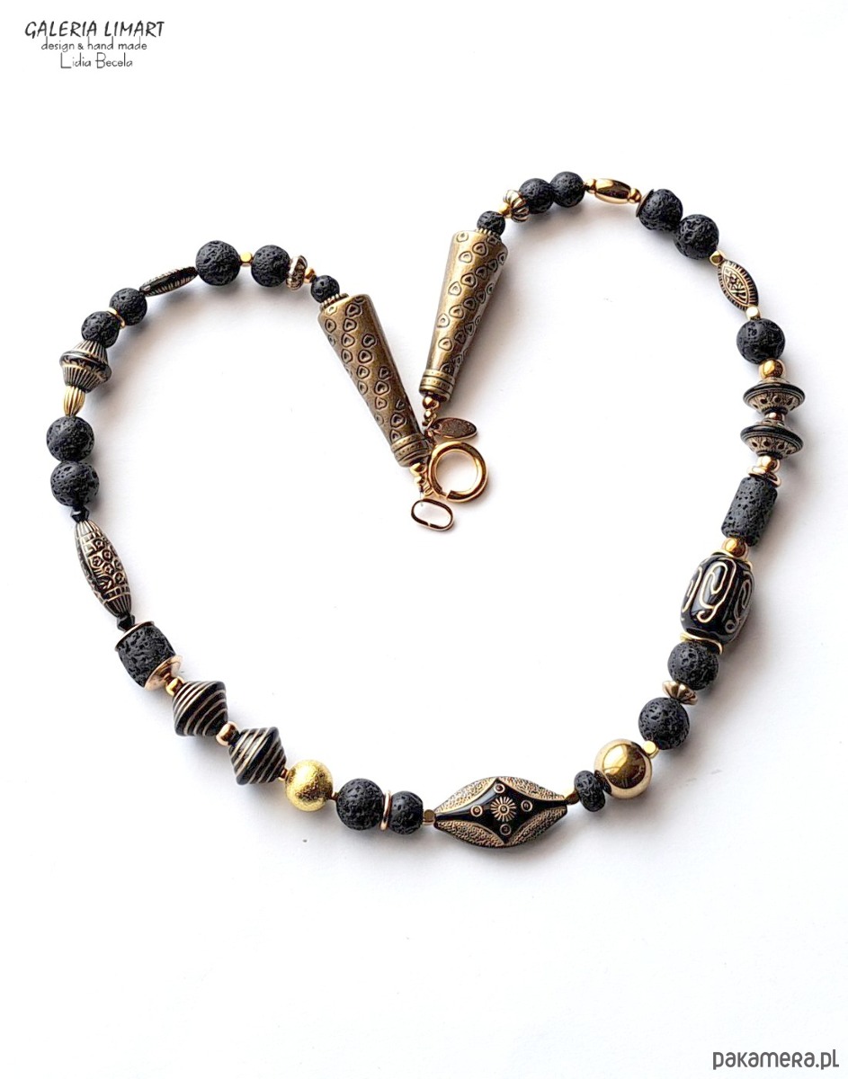 Moja oryginalna i jedyna w swoim rodzaju kompozycja naszyjnika w duchu biżuterii etnicznej inspirowanej biżuterią afrykańską. Połączenie lawy wulkanicznej, efektownych i oryginalnych korali z czarnego japońskiego akrylu ozdobionego złotymi etnicznymi wzorami z mosiężnymi przekładkami dało w efekcie niebanalny naszyjnik w duchu biżuterii egzotycznej. Długość ok. 45 cm.