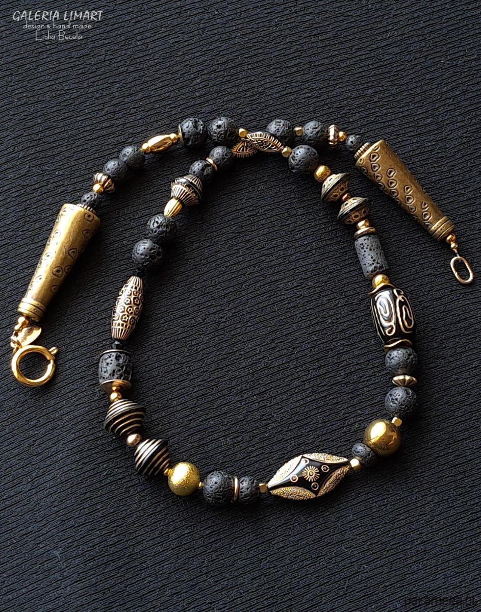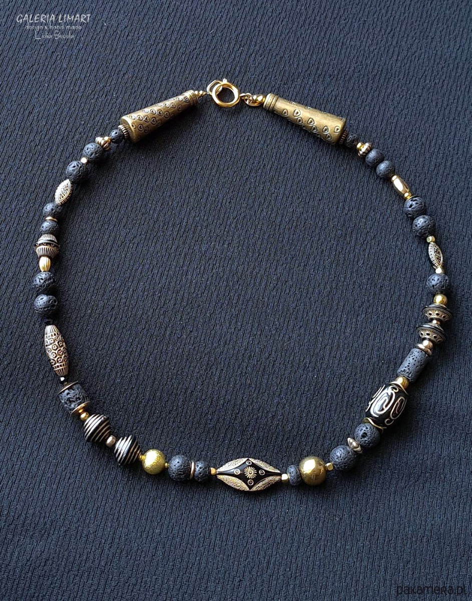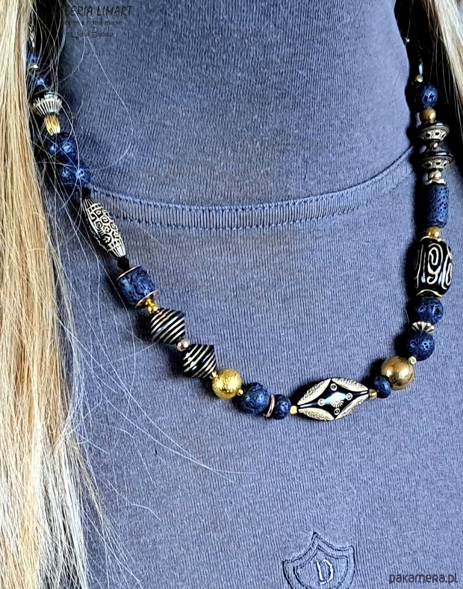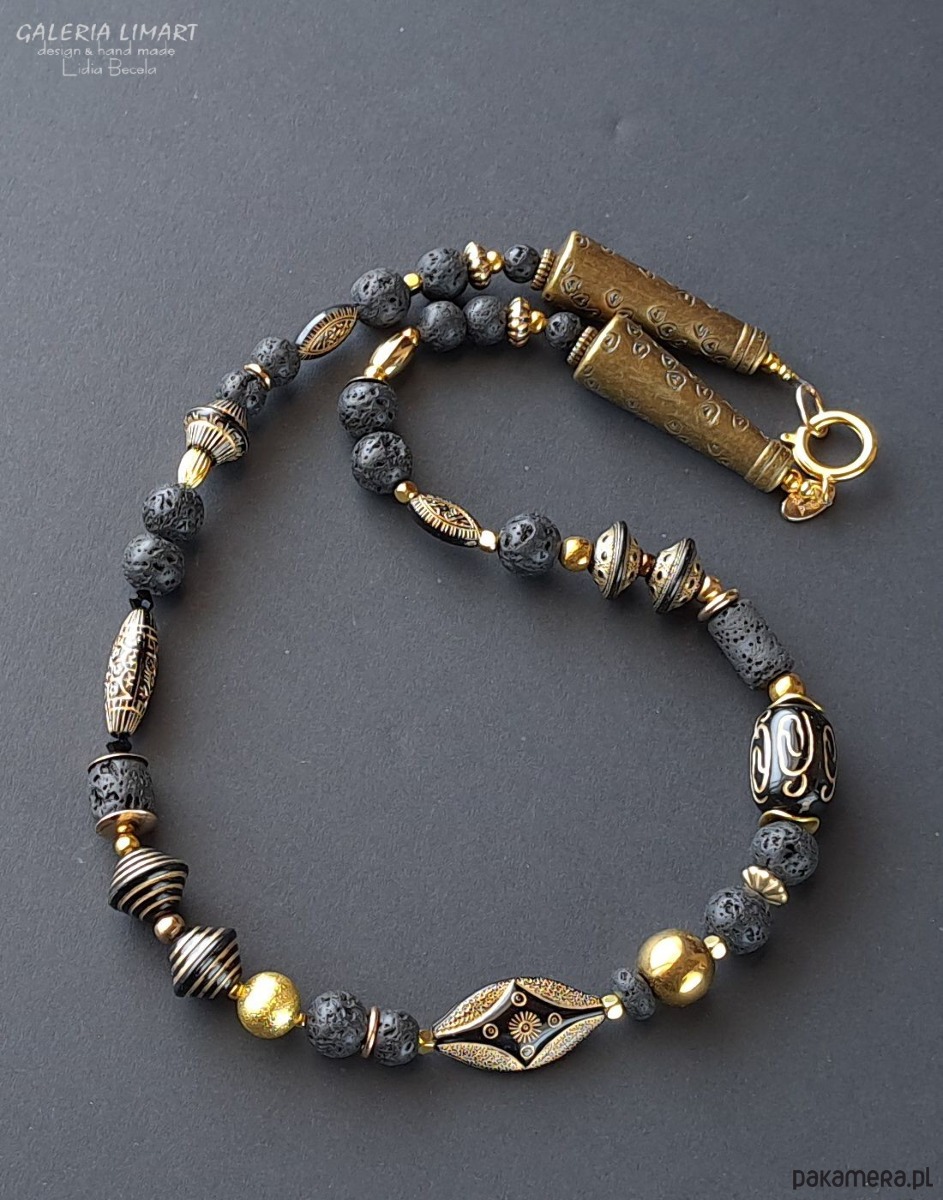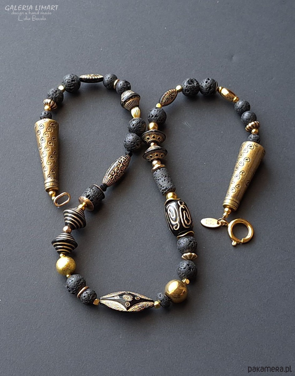 Moja oryginalna i jedyna w swoim rodzaju kompozycja naszyjnika w duchu biżuterii etnicznej inspirowanej biżuterią afrykańską. Połączenie lawy wulkanicznej, efektownych i oryginalnych korali z czarnego japońskiego akrylu ozdobionego złotymi etnicznymi wzorami z mosiężnymi przekładkami dało w efekcie niebanalny naszyjnik w duchu biżuterii egzotycznej. Długość ok. 45 cm.