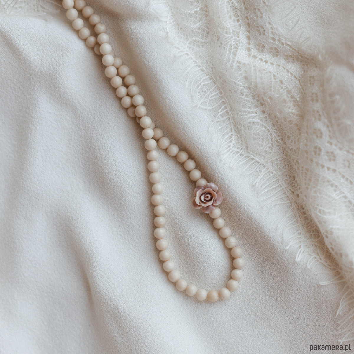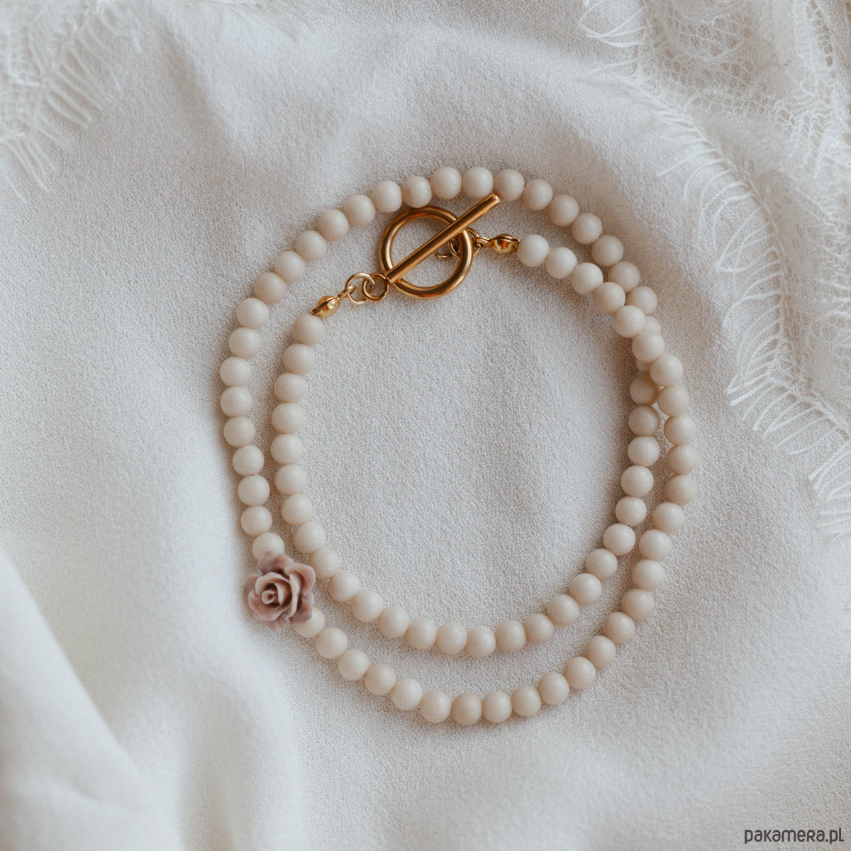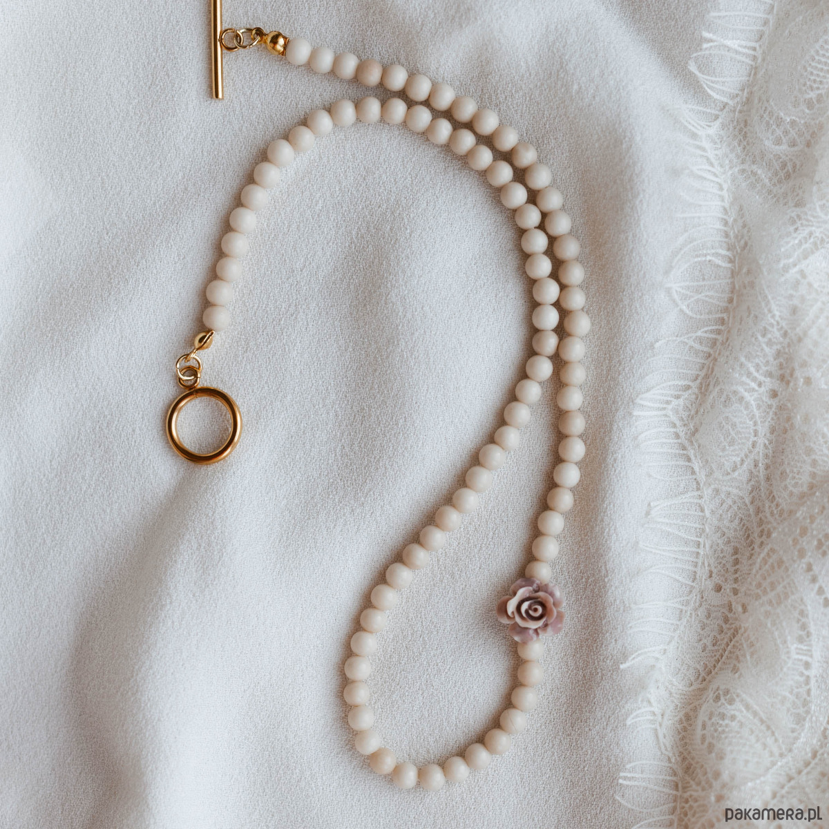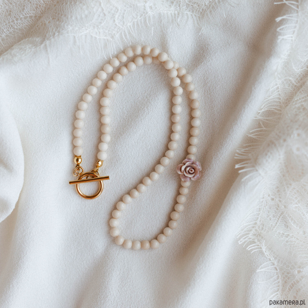 Delikatny naszyjnik z kamieni naturalnych wykonany z białego jaspisu (4 mm), ozdobiony subtelnym akcentem róży w kolorze pudrowego różu. To kobieca i romantyczna propozycja dla miłośniczek minimalistycznej biżuterii.