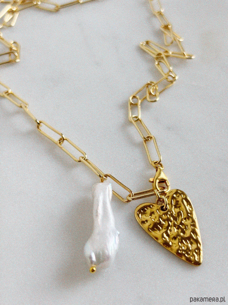 Naszyjnik wykonany jest łańcuszka,zapięcia i zawieszki rodowanego 14K złotem oraz perły naturalnej w podłużnym kształcie.