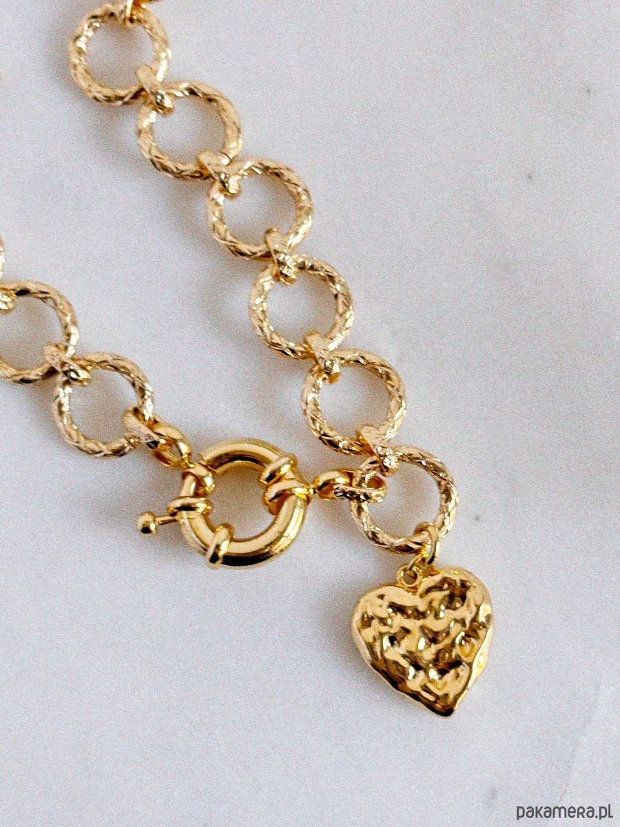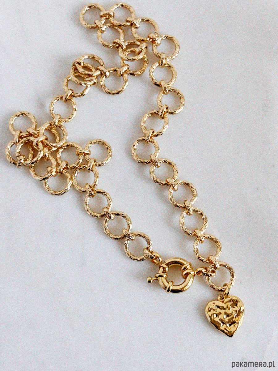Naszyjnik wykonany jest z łańcuszka, zapięcia oraz zawieszki pokrytych 14K złotem.
