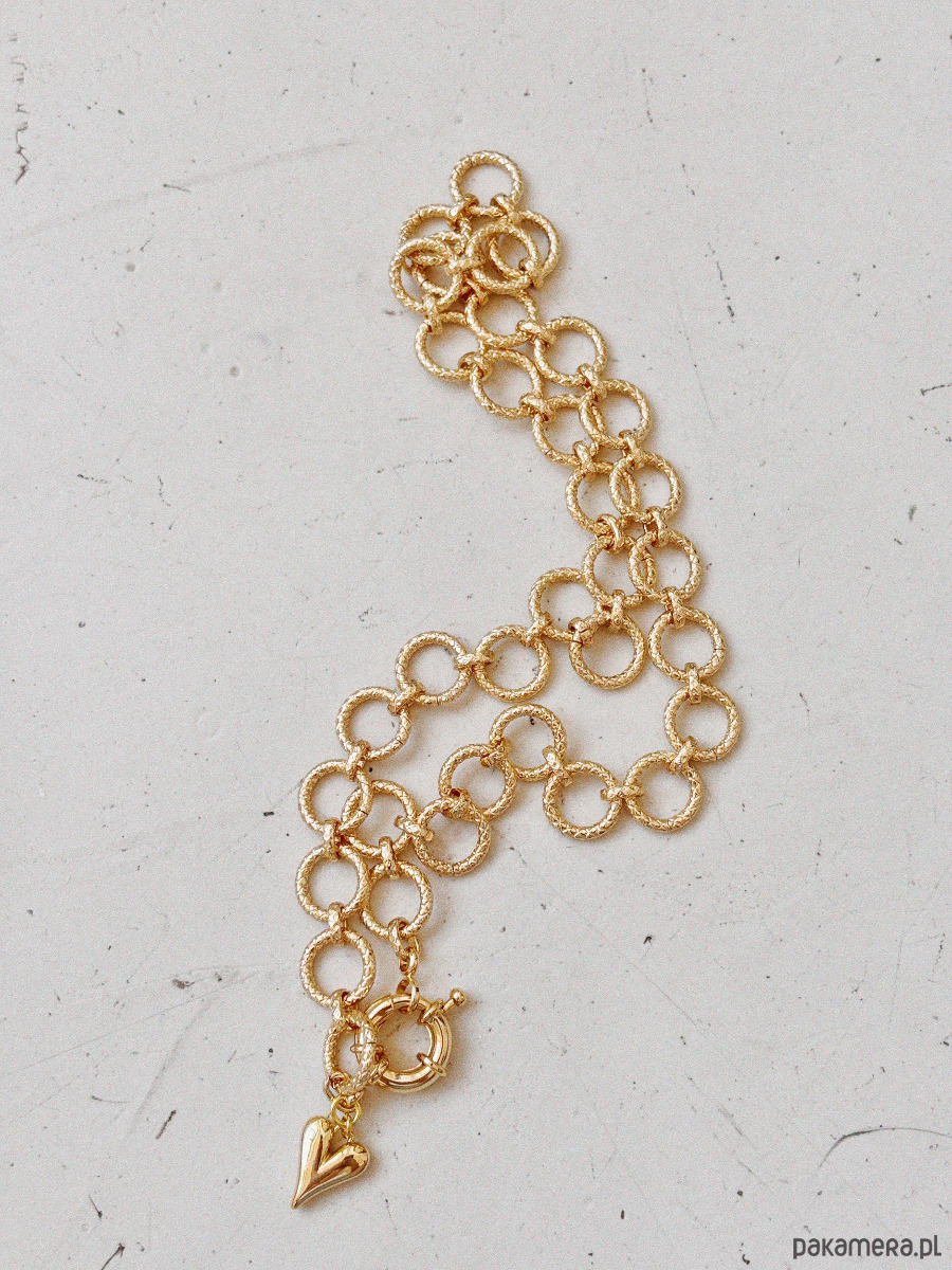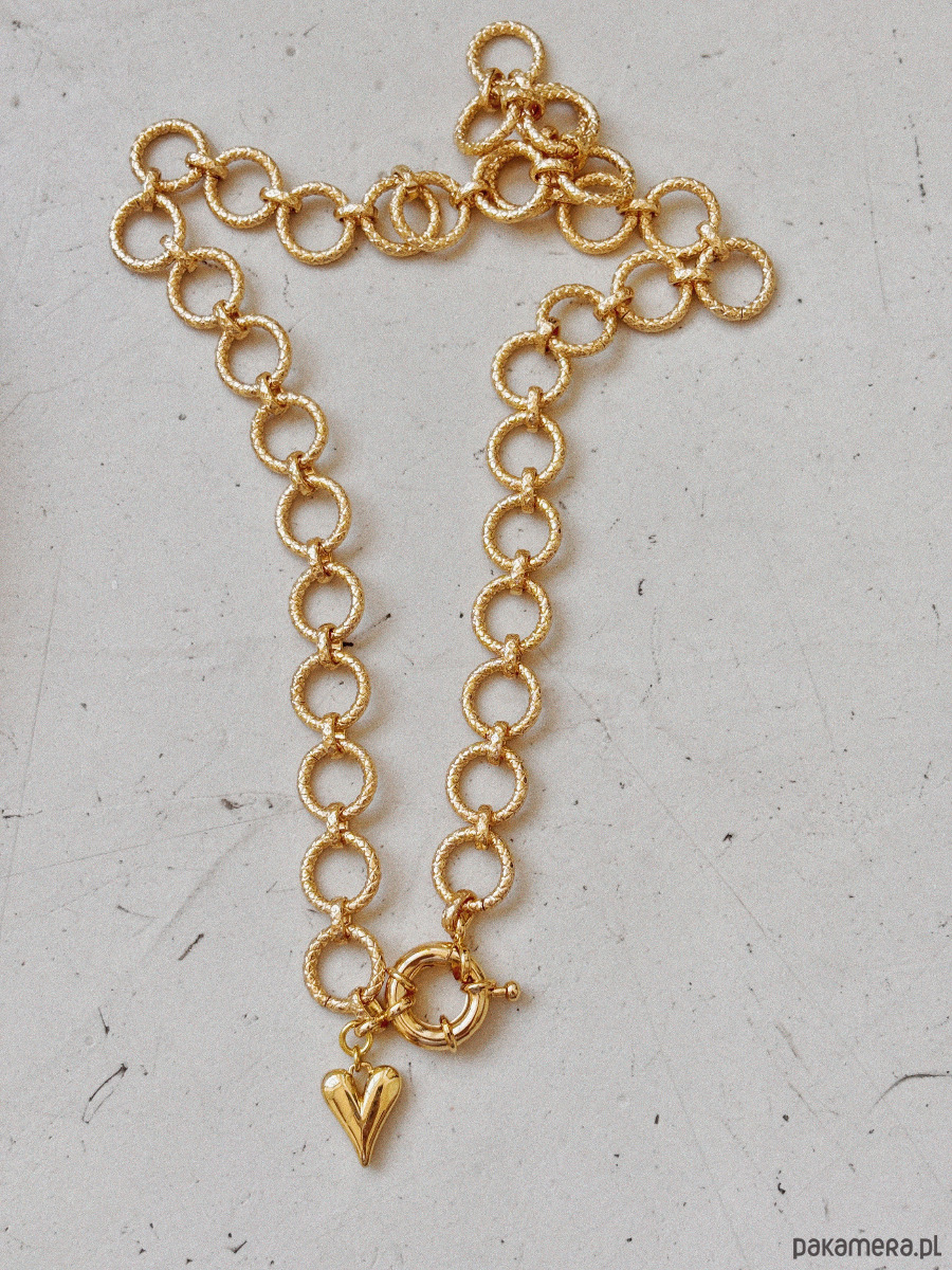 Naszyjnik wykonany jest z łańcuszka, zapięcia oraz zawieszki pokrytych 14K złotem.