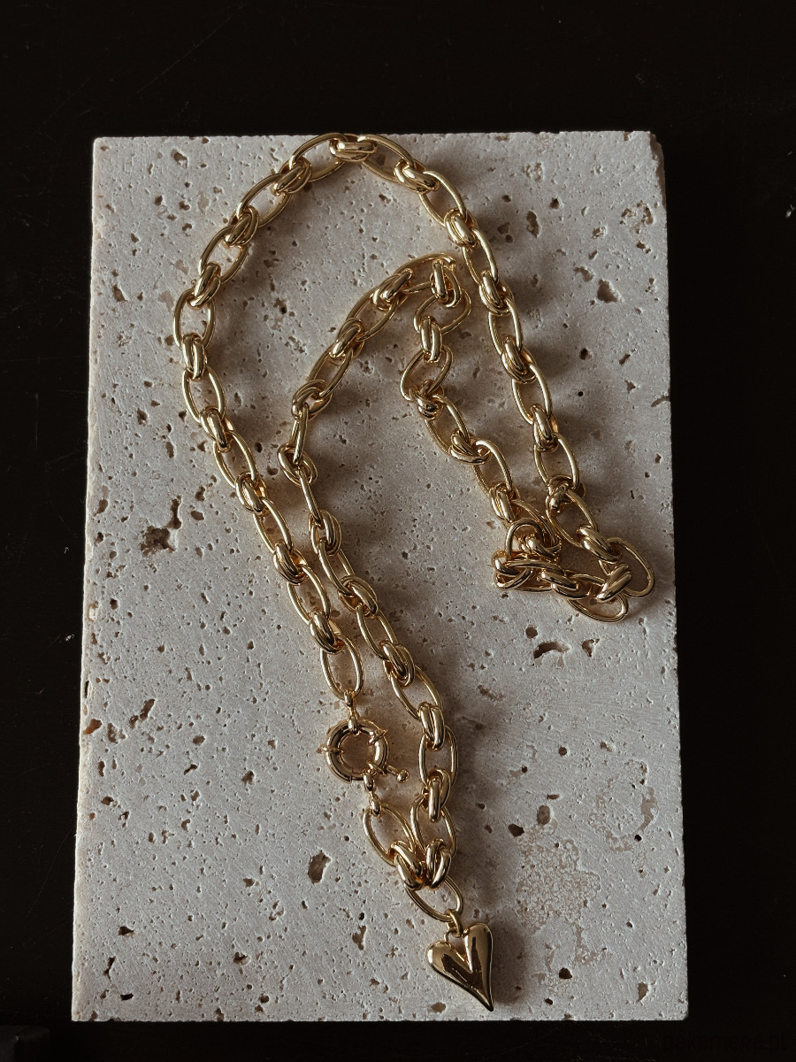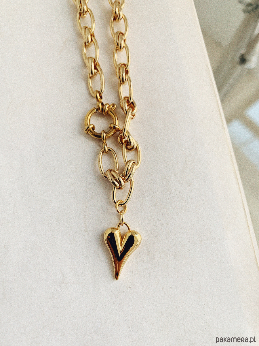 Naszyjnik wykonany jest łańcuszka pokrytego 14K złotem, zapięcia w kształcie serca pozłacanego 18K złotem oraz zawieszki ze st. ch.