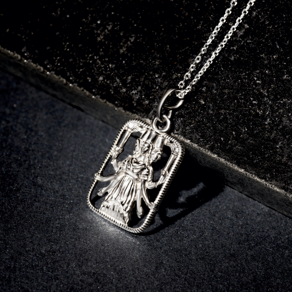 Srebrny naszyjnik HEKATE składa się z eleganckiej, ażurowej zawieszki oraz wybranego łańcuszka. Możesz go nosić jako samodzielną ozdobę, albo w zestawieniu z innymi naszyjnikami i łańcuszkami DRACA.