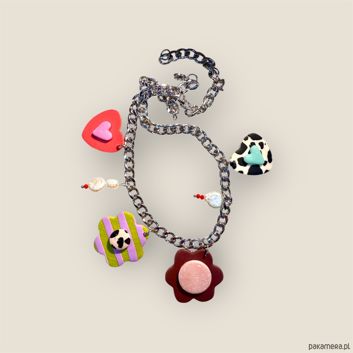 Śliczny naszyjnik wykonany ze stali chirurgicznej, pereł słodkowodnych i zawieszek z glinki polimerowej, stworzony w pojedynczym egzemplarzu.