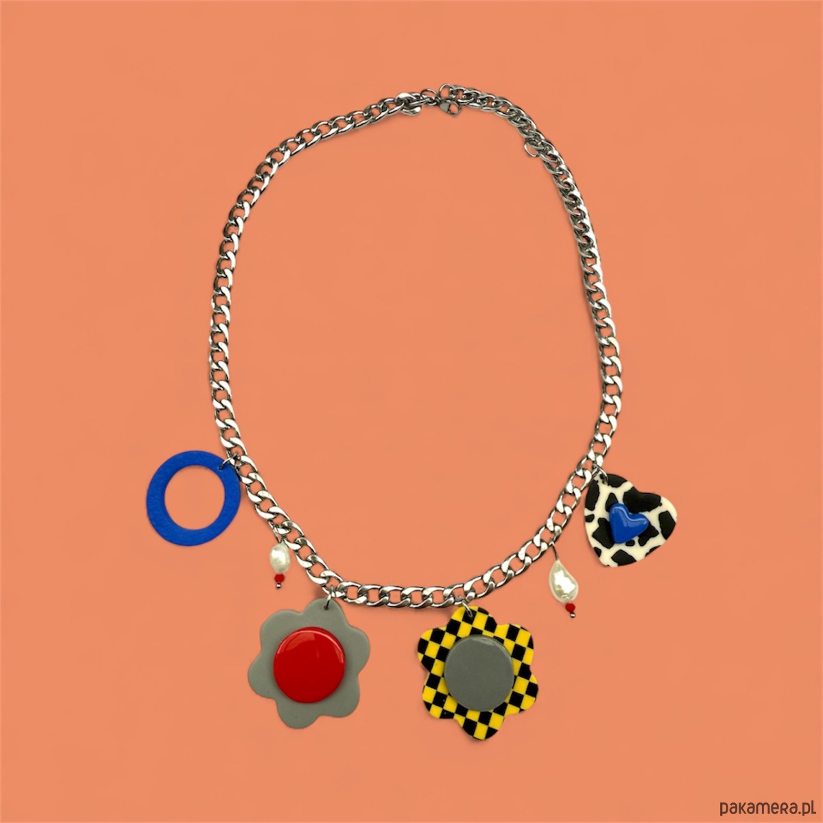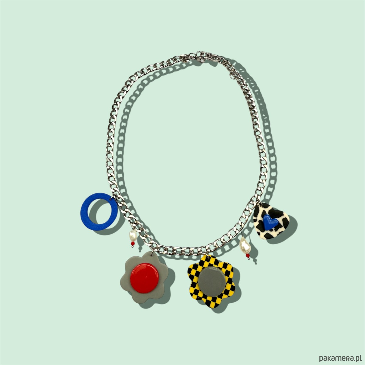 Śliczny naszyjnik wykonany ze stali chirurgicznej, pereł słodkowodnych i zawieszek z glinki polimerowej, stworzony w pojedynczym egzemplarzu.