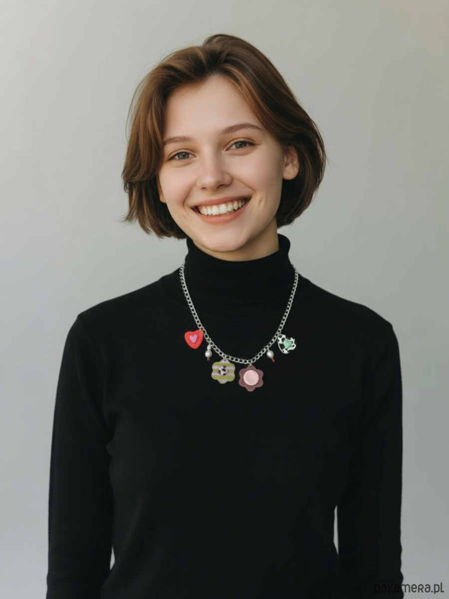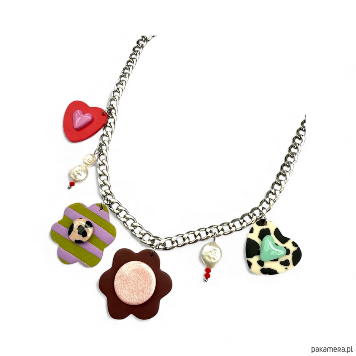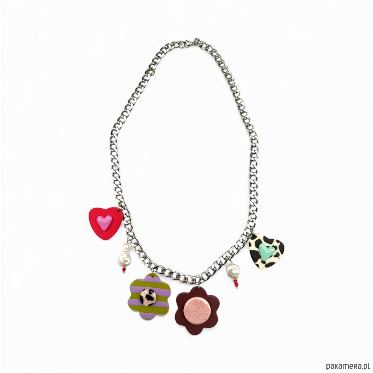 Śliczny naszyjnik wykonany ze stali chirurgicznej, pereł słodkowodnych i zawieszek z glinki polimerowej, stworzony w pojedynczym egzemplarzu.
