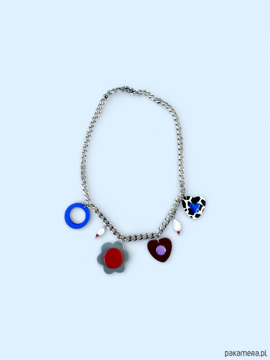 Śliczny naszyjnik wykonany ze stali chirurgicznej, pereł słodkowodnych i zawieszek z glinki polimerowej, stworzony w pojedynczym egzemplarzu.