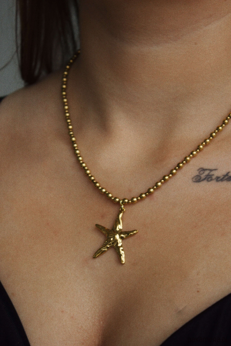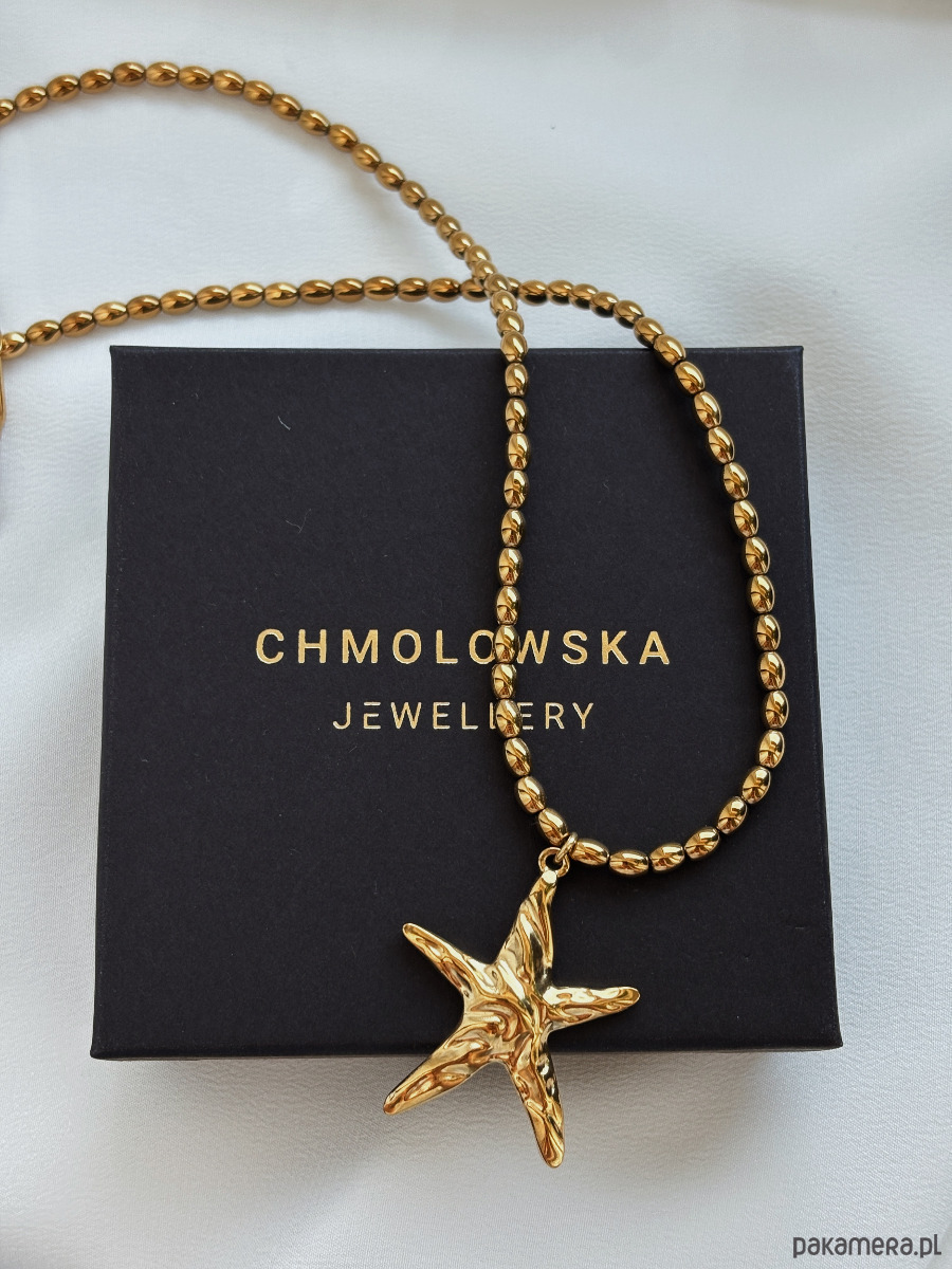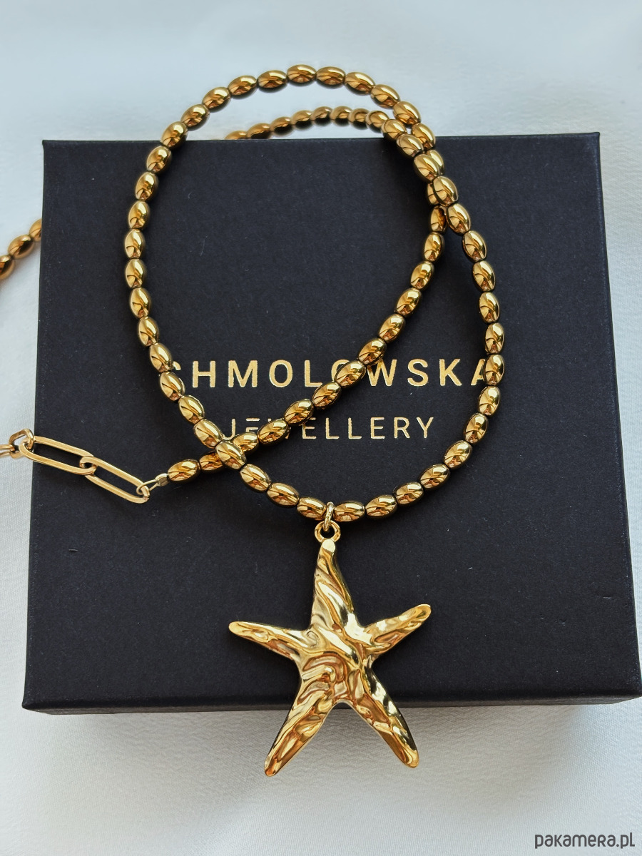 Naszyjnik wykonany jest na lince jubilerskiej z użyciem hematytu, zawieszki w kształcie rozgwiazdy oraz zapięcia i łańcuszka ze stali ch.