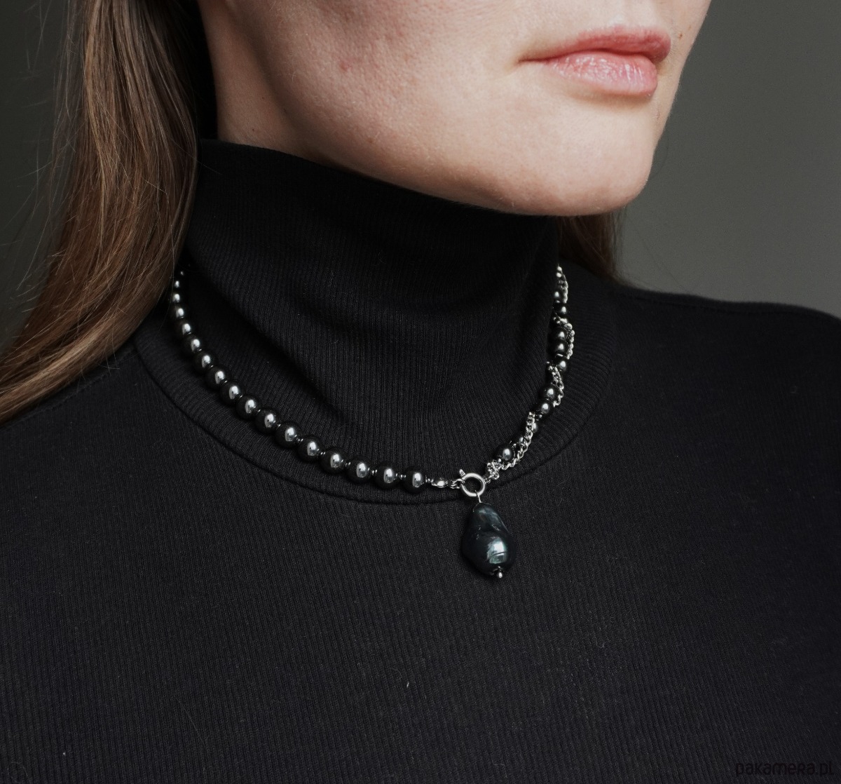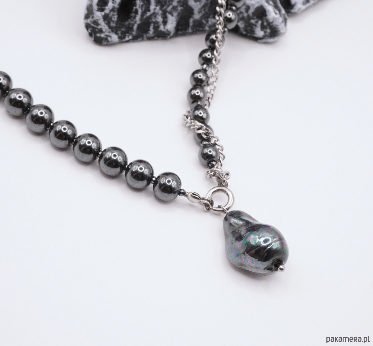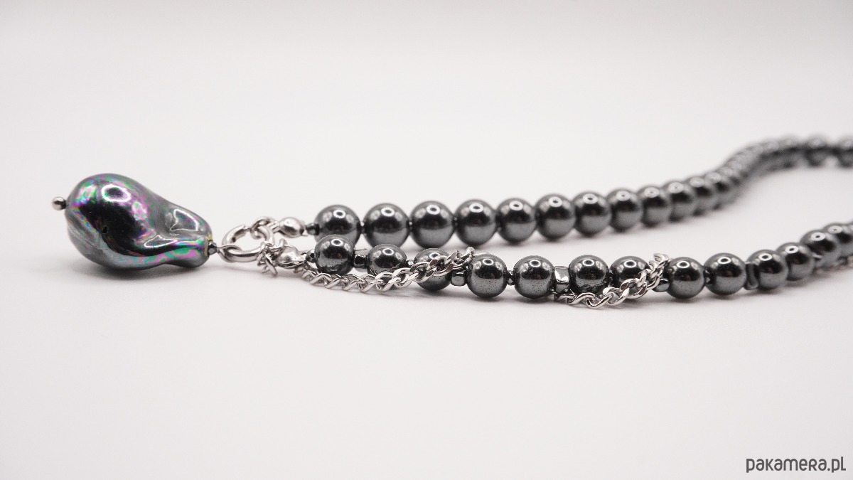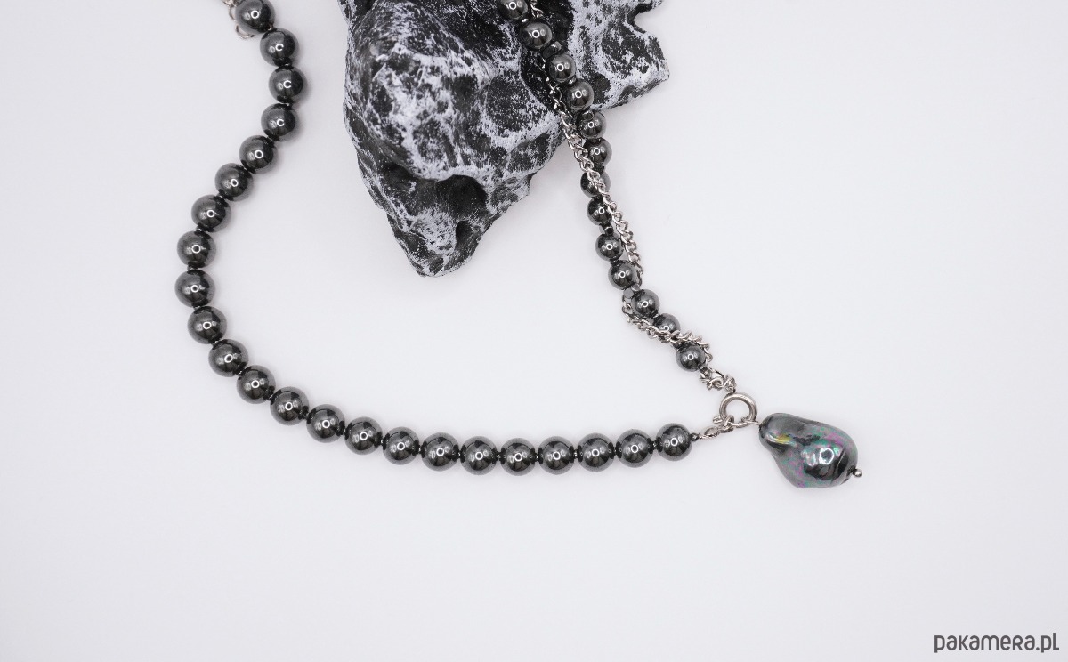 Kontrast chłodnego, grafitowego hematytu z organiczną formą perły tworzy nowoczesny, a jednocześnie stonowany i luksusowy wygląd. Metalowe elementy wykończeniowe harmonijnie dopełniają całość, podkreślając minimalistyczną estetykę naszyjnika.