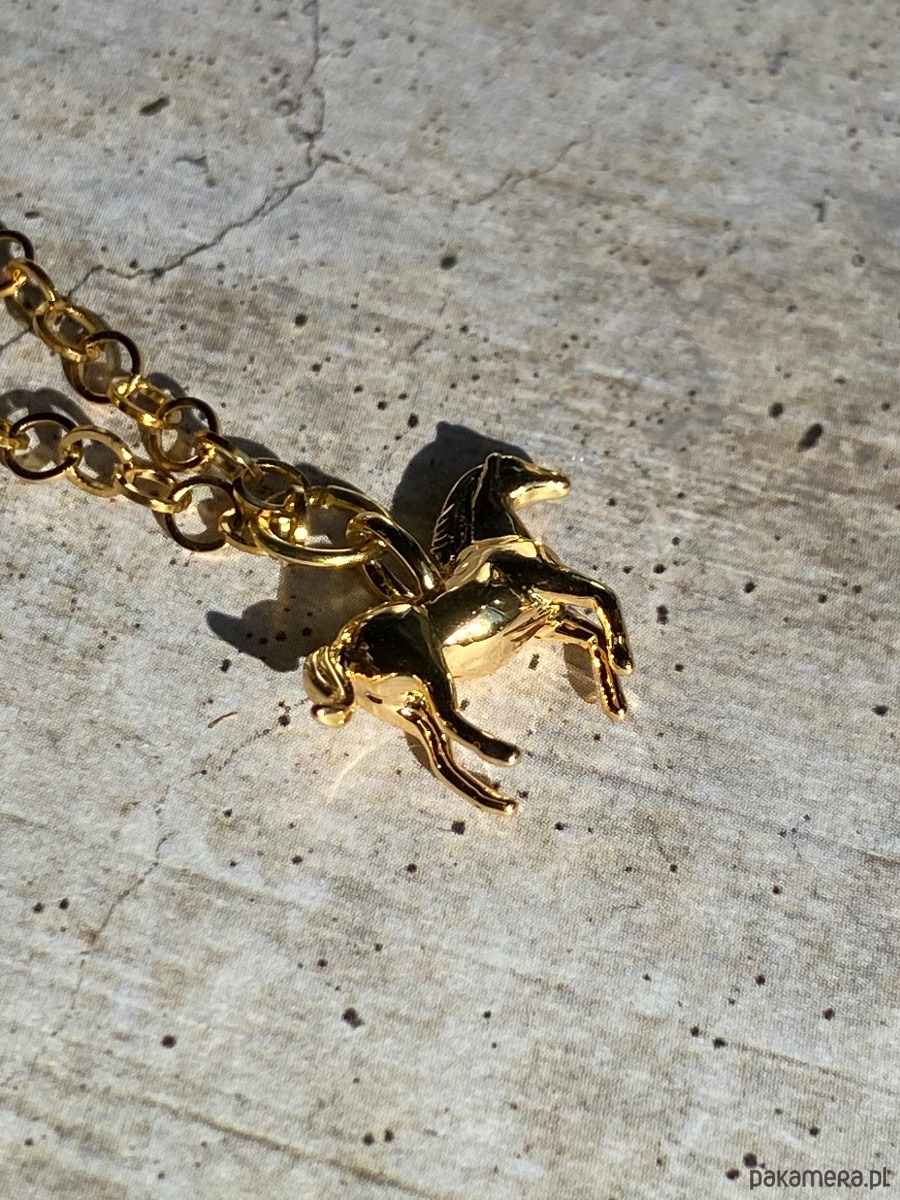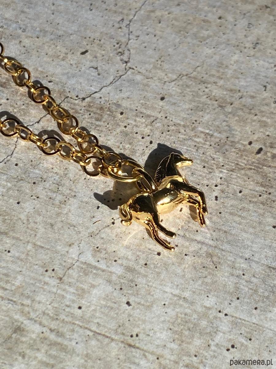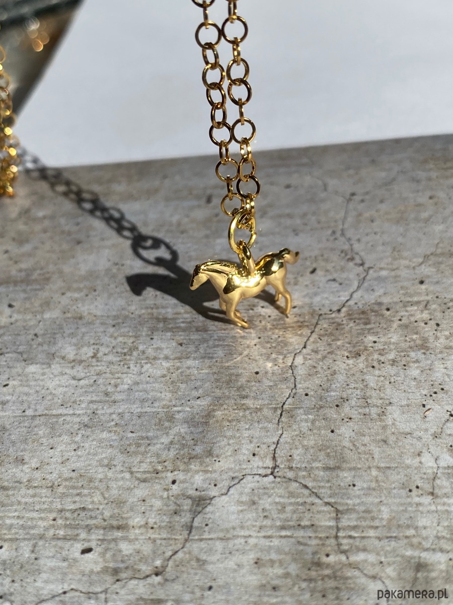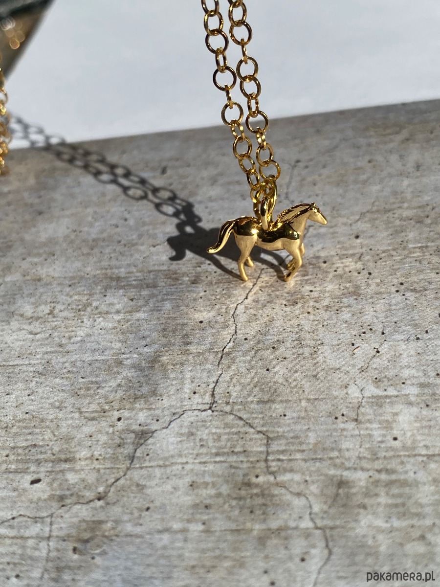 Delikatny pozłacany konik 18k, na cieniutkim złotym łańcuszku rolo ze stali.