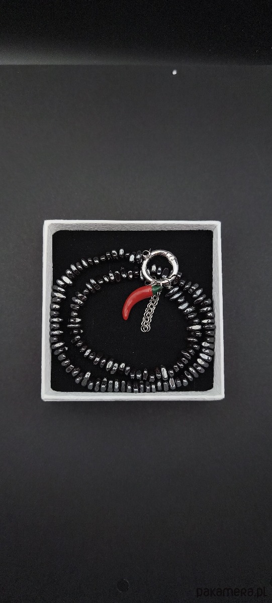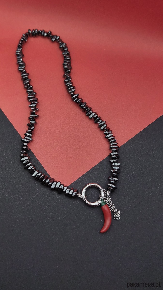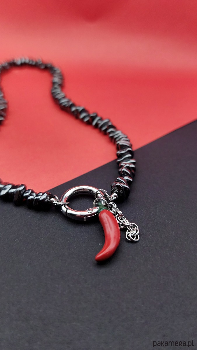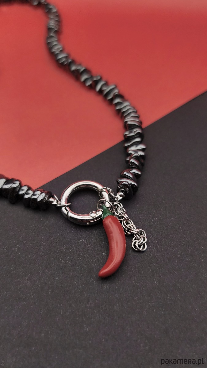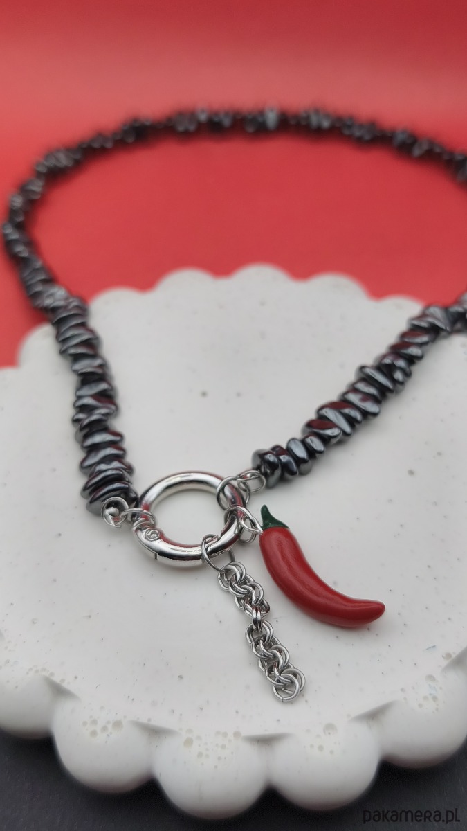 Naszyjnik HOT to połączenie chłodnego hematytu w kolorze ciemnego srebra oraz zawieszki z gliny polimerowej - paparyczki chilli.