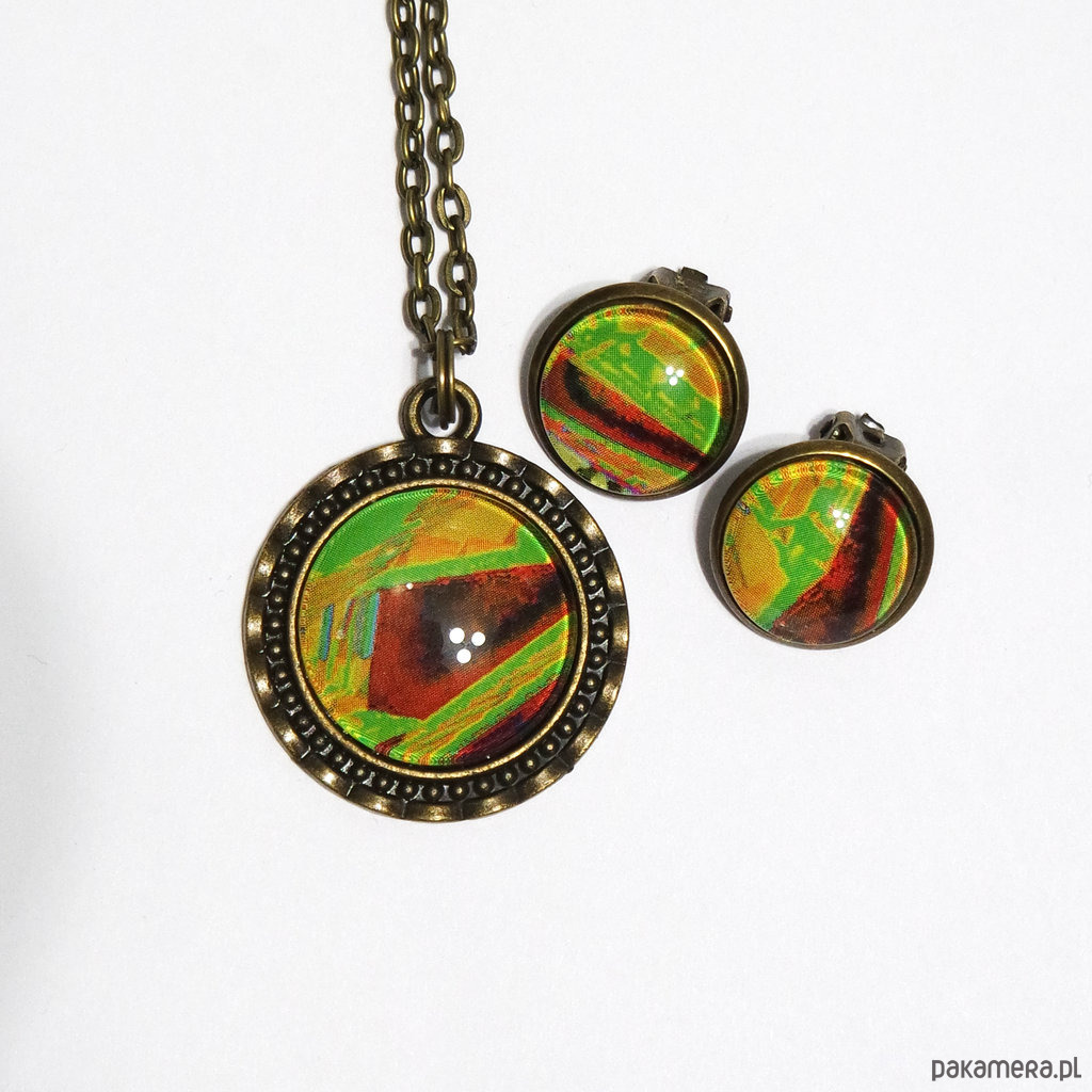 Naszyjnik i klipsy - komplet - Kolorowa abstrakcja 2, brąz