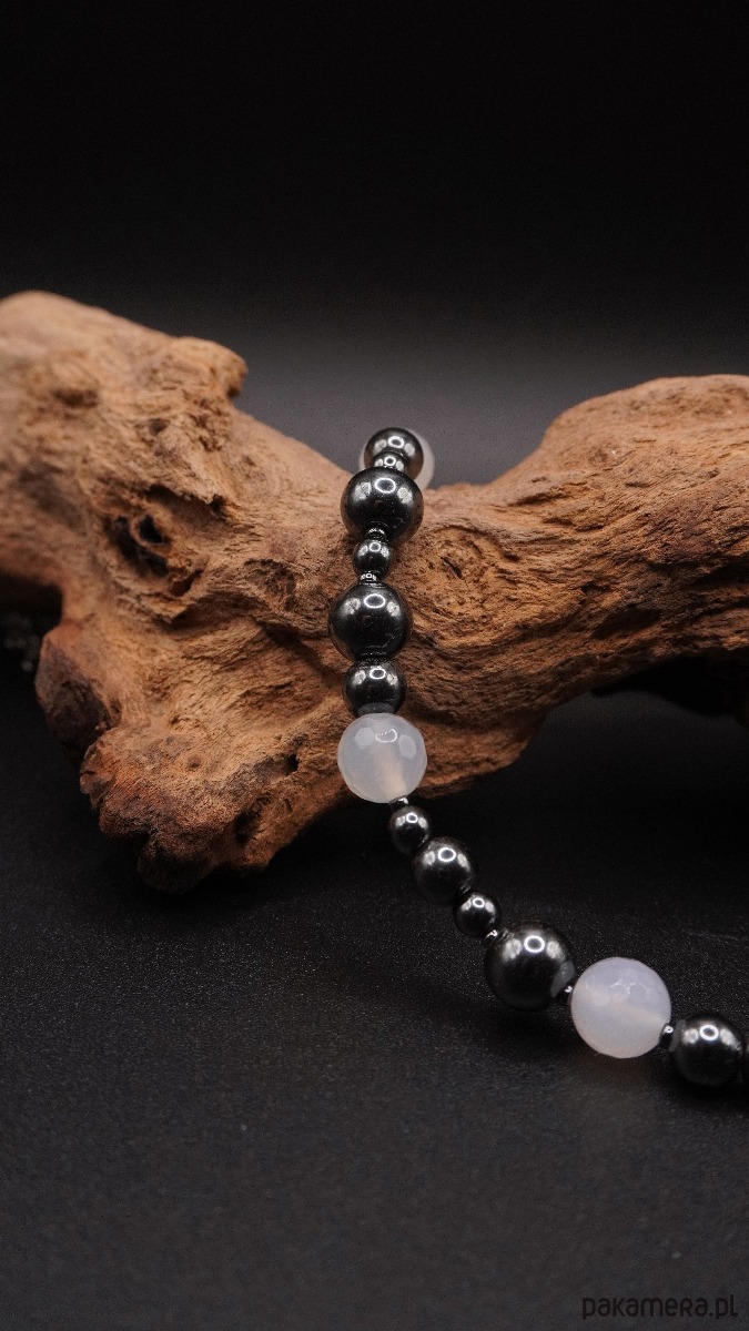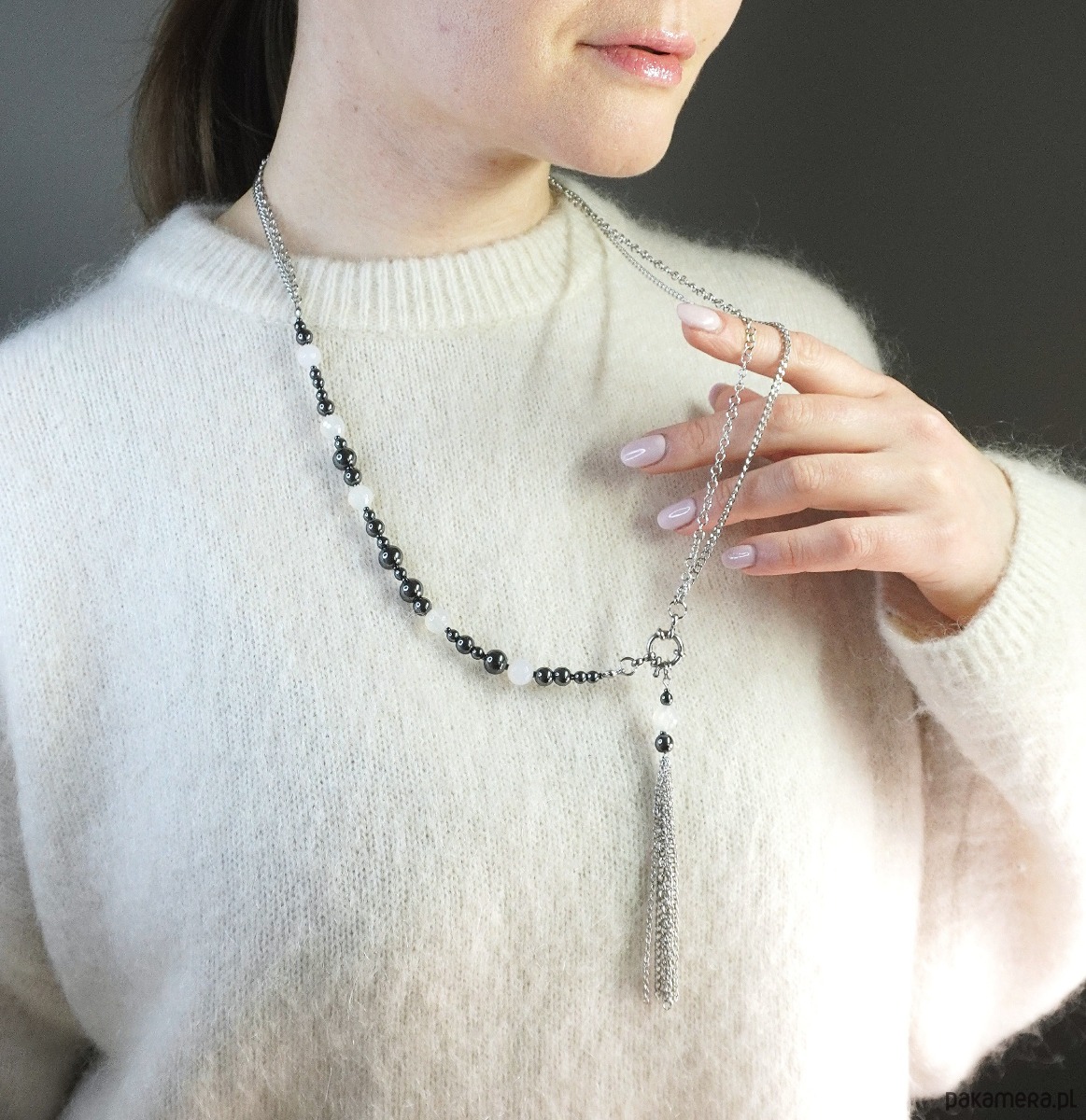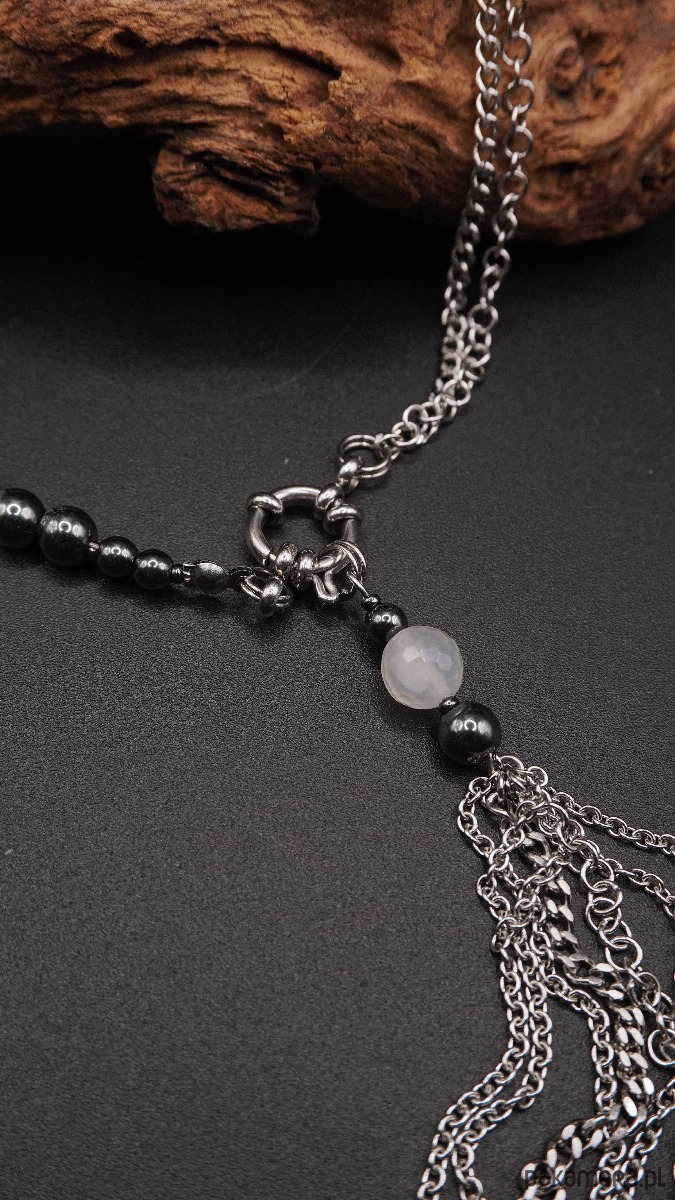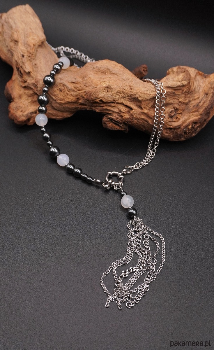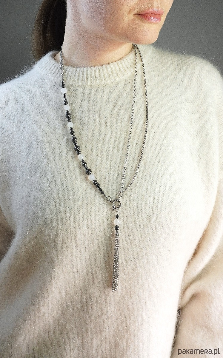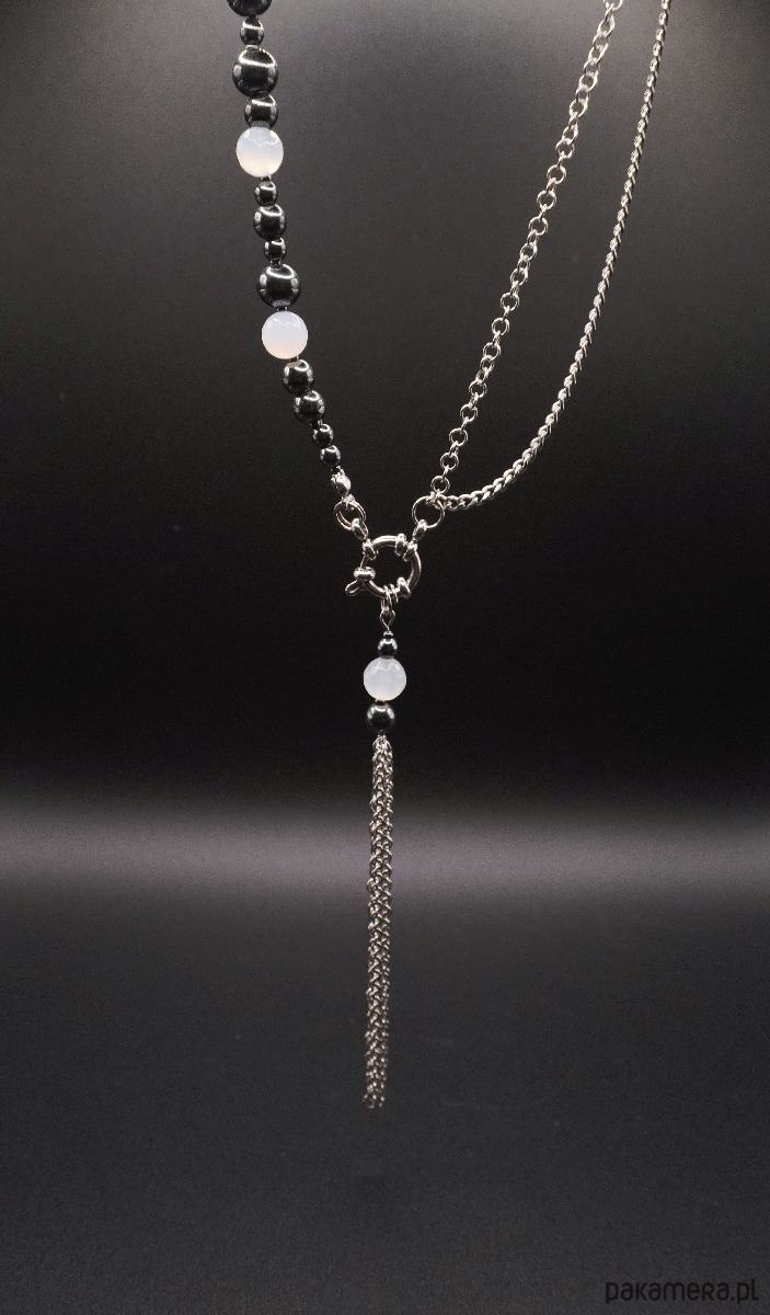 Główną rolę grają tu polerowane koraliki ciemnego hematytu o metalicznym blasku, zestawione z mlecznymi, półtransparentnymi kulkami białego agatu. Asymetryczna kompozycja przechodzi w surowy srebrzysty łańcuch, a całość wieńczy efektowny element dekoracyjny: ozdobne zapięcie typu toggle oraz kaskada łańcuszków tworząca nowoczesny chwost (tassel).