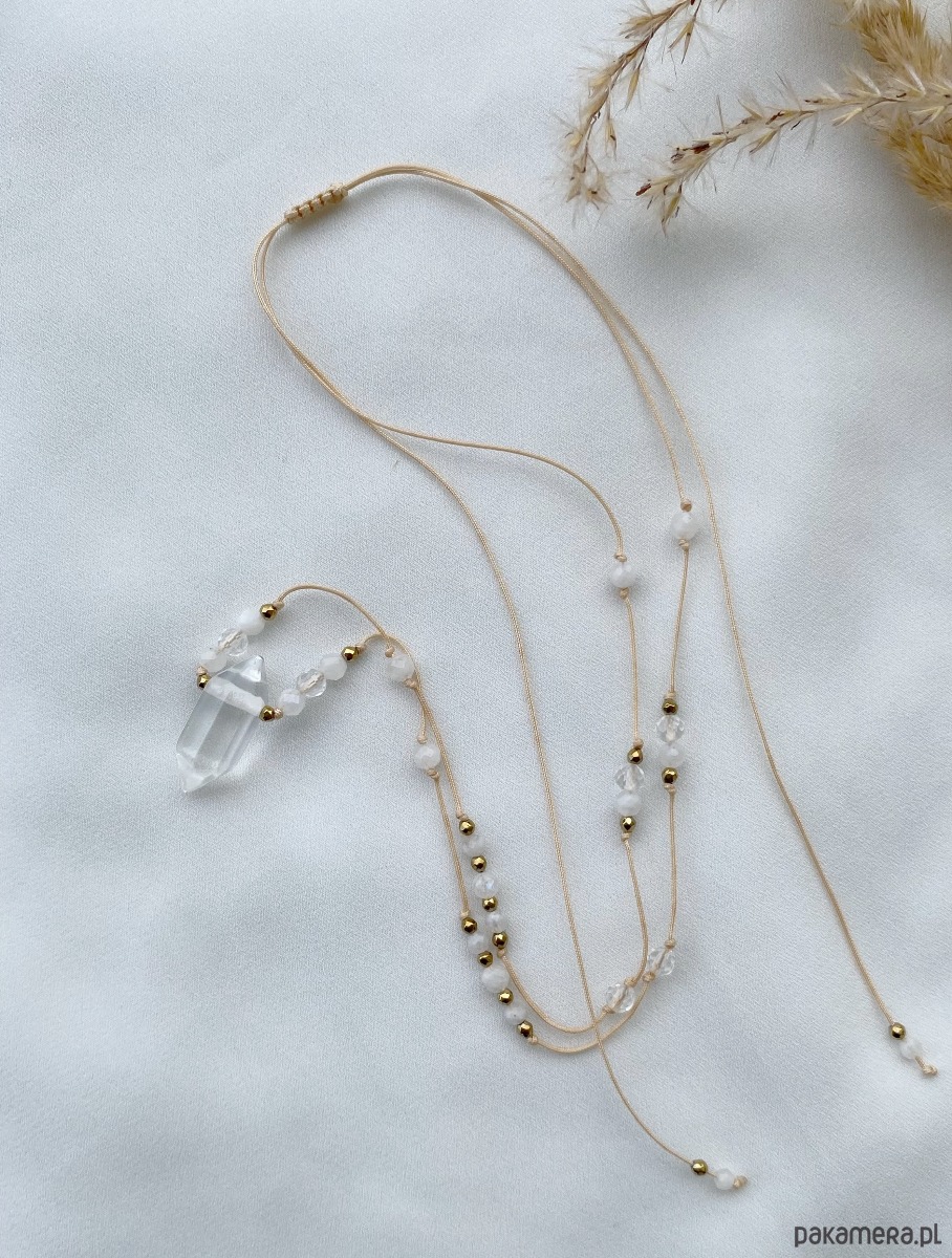 Naszyjnik regulowany z Kamieniem Księżycowym oraz Kryształem Górskim na beżowym sznurku.