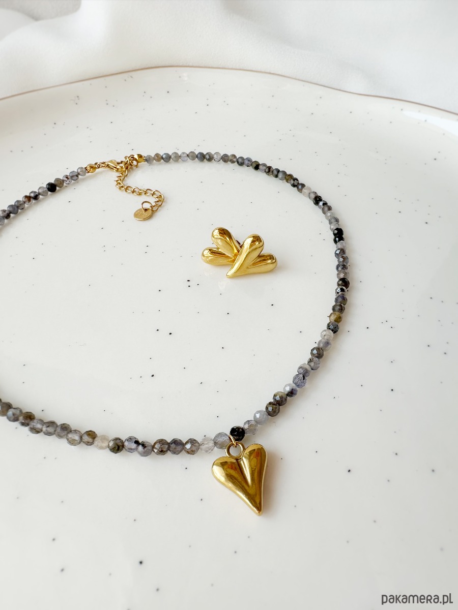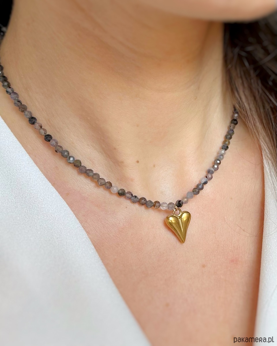 Naszyjnik w odcieniach szarosci z naturalnego iolitu z pięknym złotym sercem ze stali 🩶