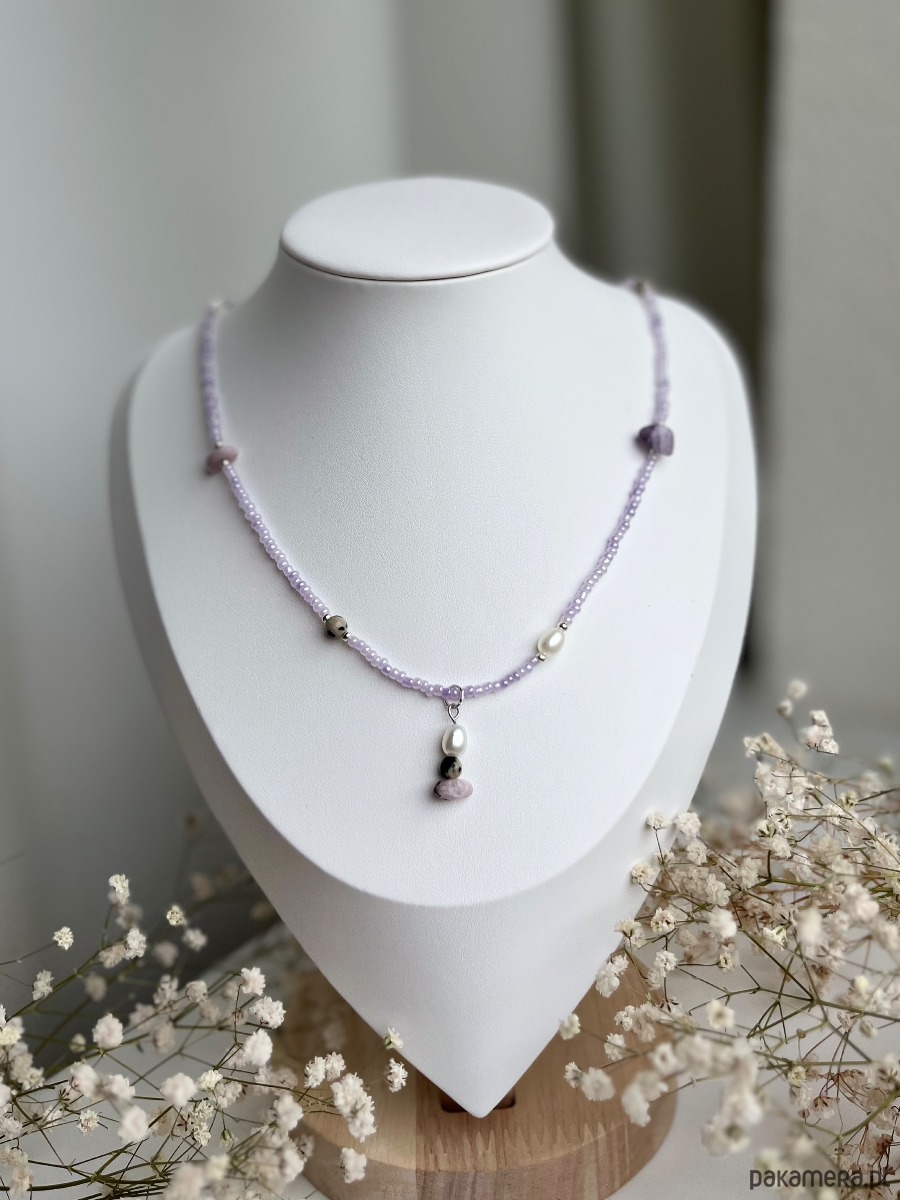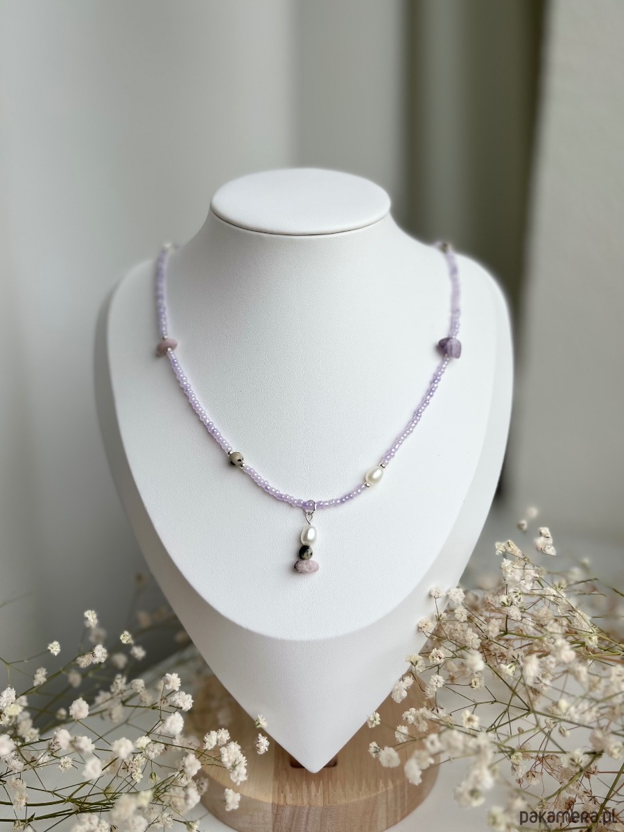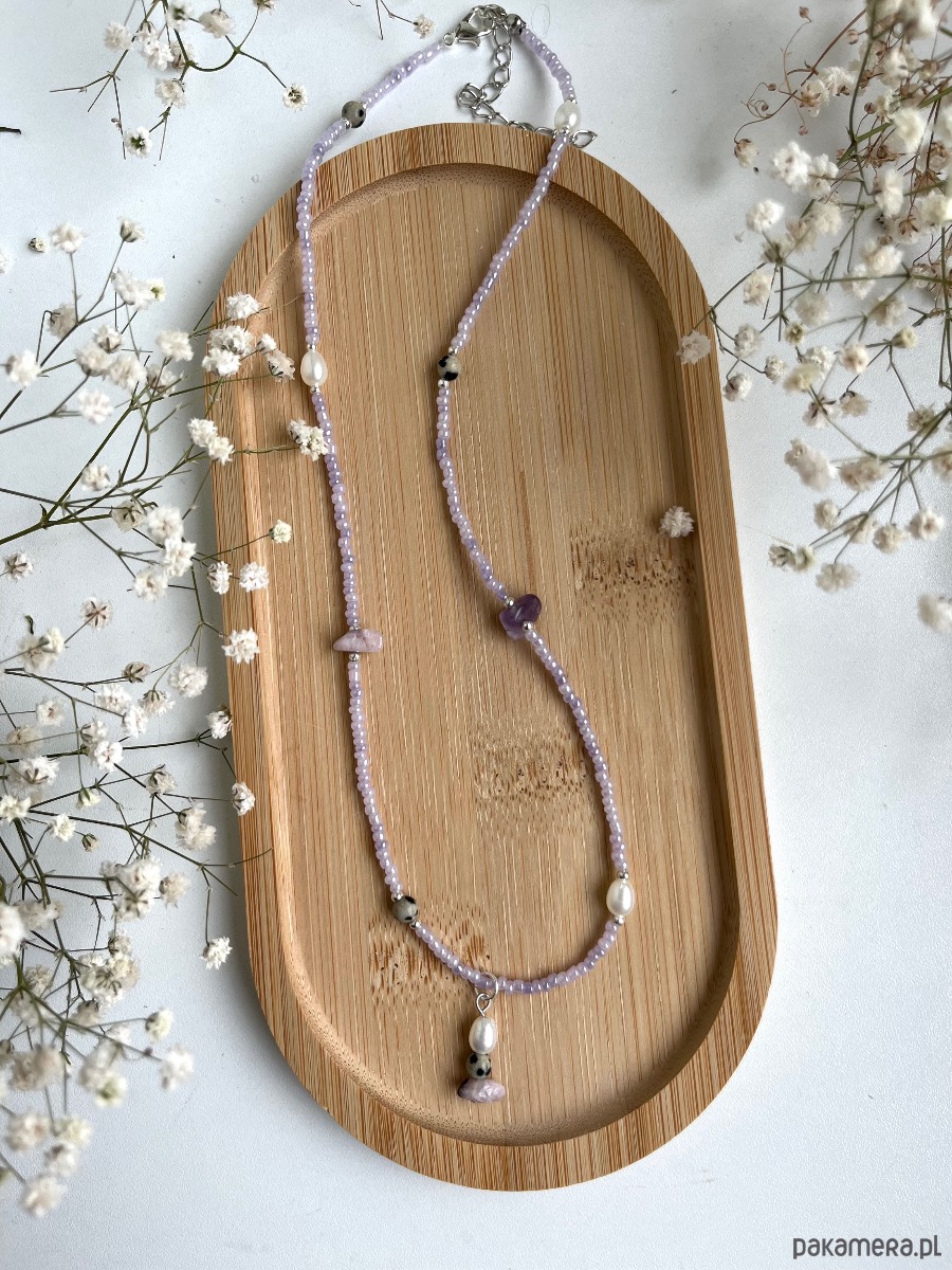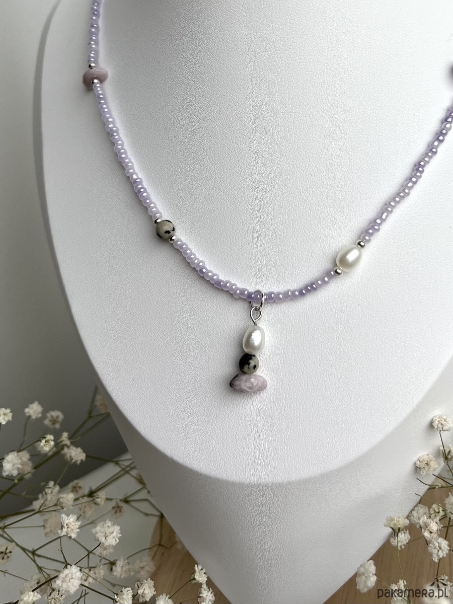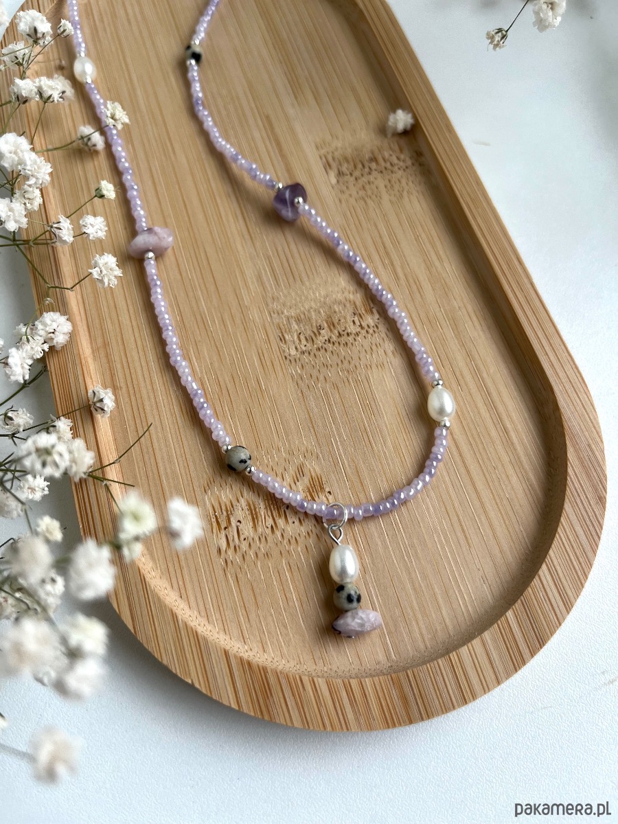 Naszyjnik ręcznie wykonany ze szklanych koralików, sztucznych pereł oraz kamieni naturalnych - jaspisu dalmatyńskiego oraz ametystu.