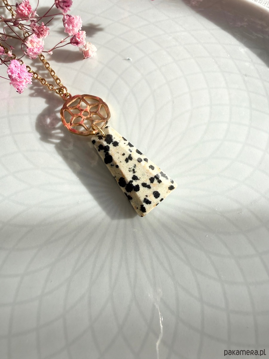 Minimalistyczny naszyjnik z naturalnym jaspisem dalmatyńczykiem. Kamień ten kojarzony jest z harmonią, lekkością i radością. Traktowany jak amulet, symbolizuje równowagę oraz dystans do codziennych spraw. Jego jasna barwa z charakterystycznymi plamkami sprawia, że biżuteria jest subtelna, a jednocześnie niepowtarzalna.