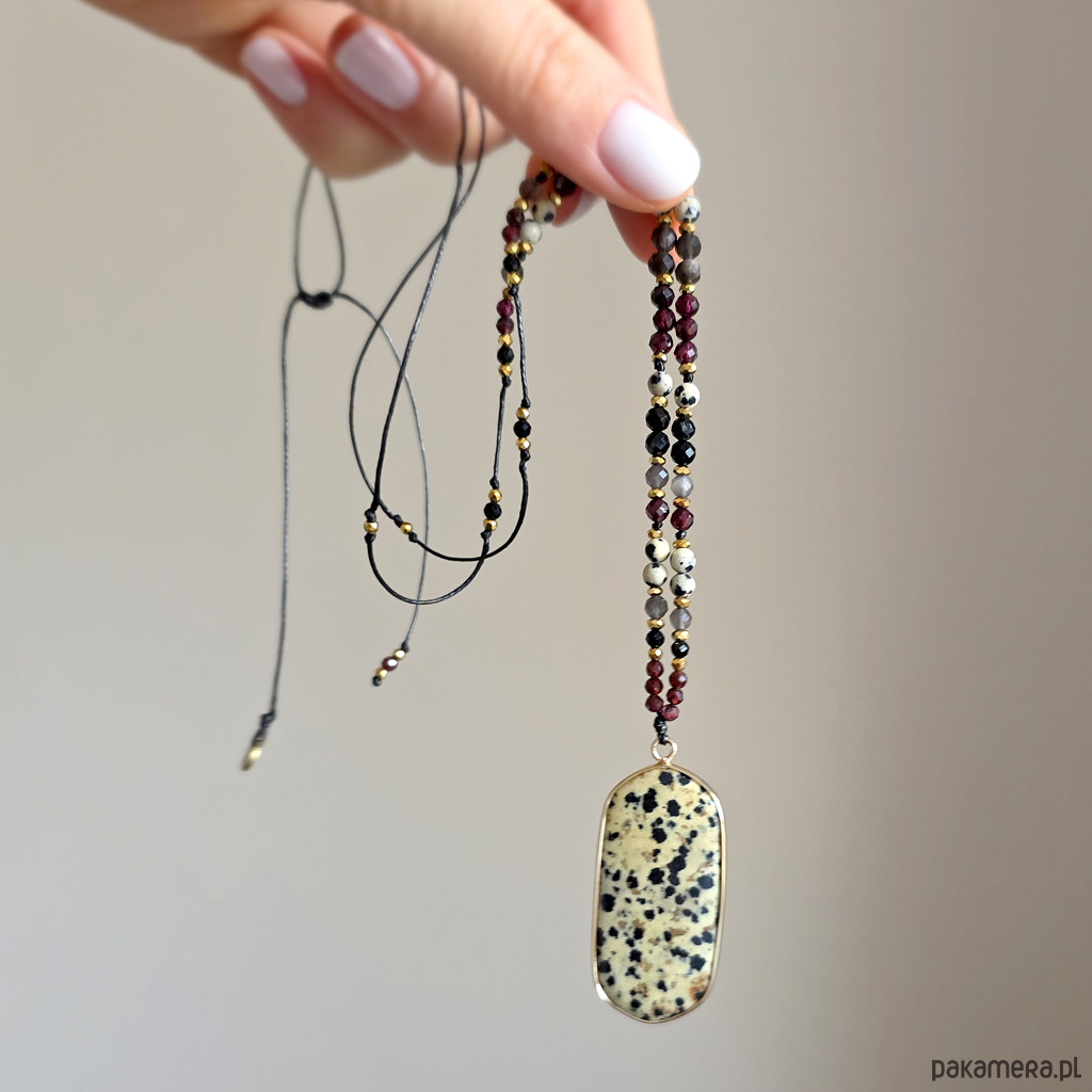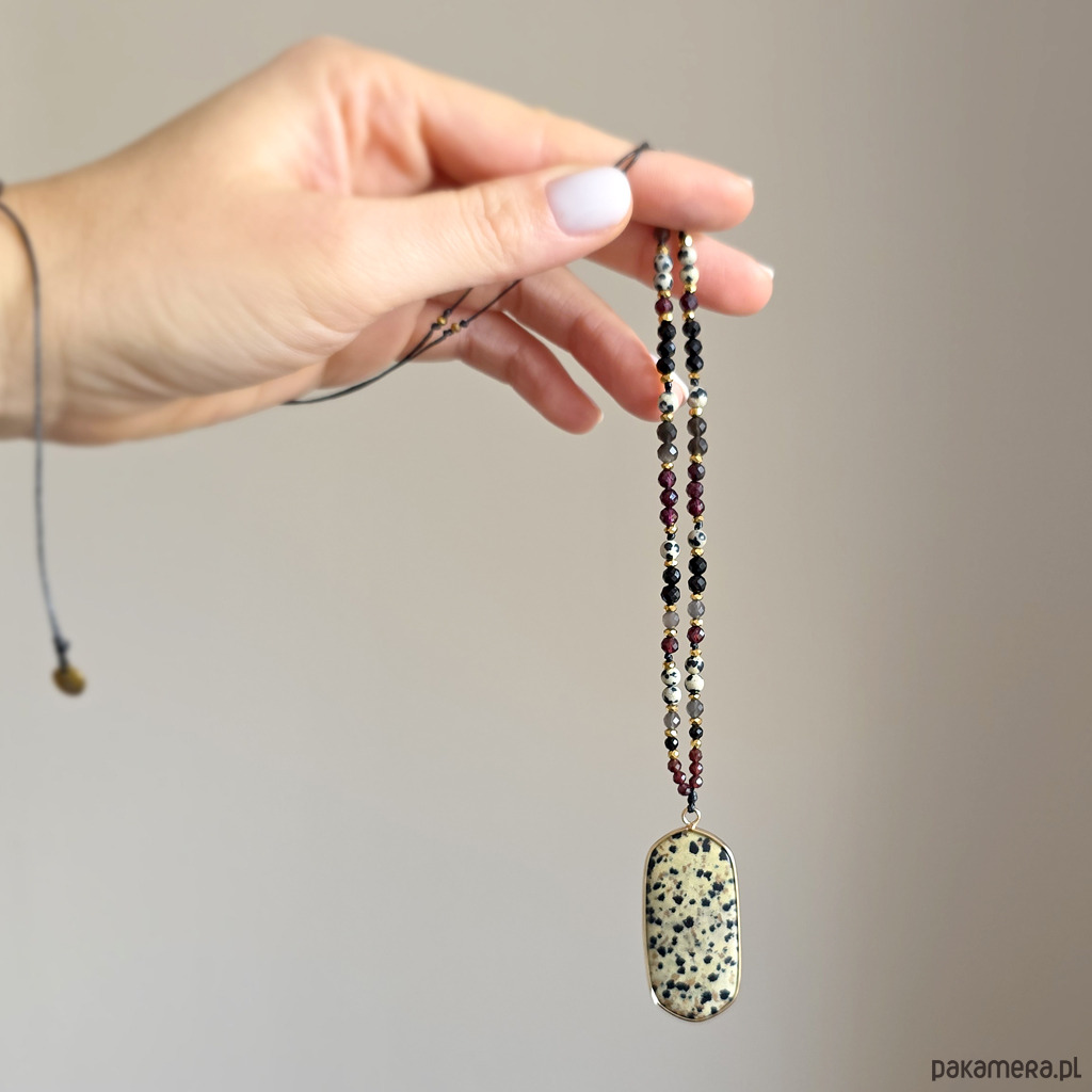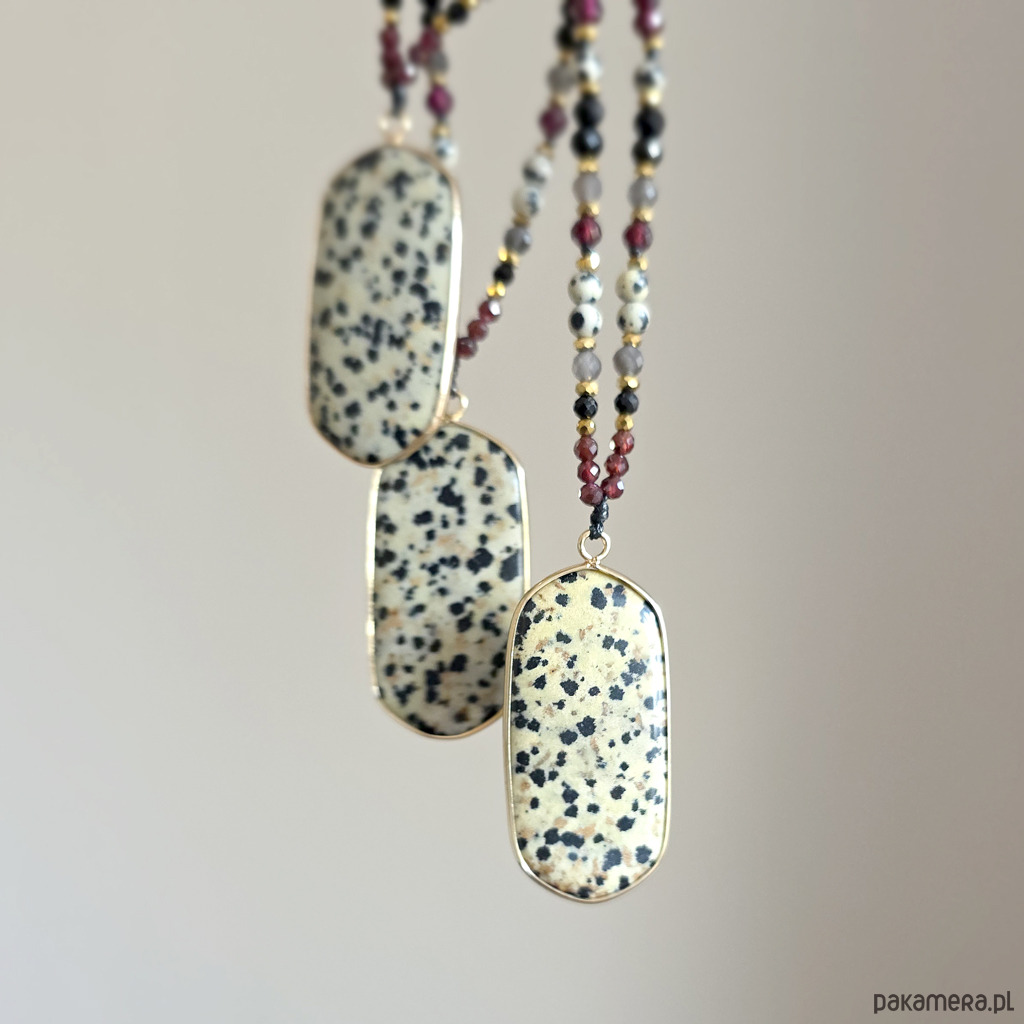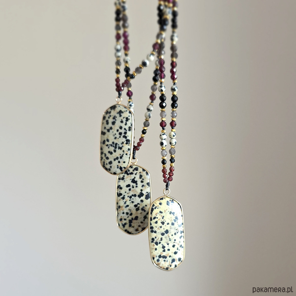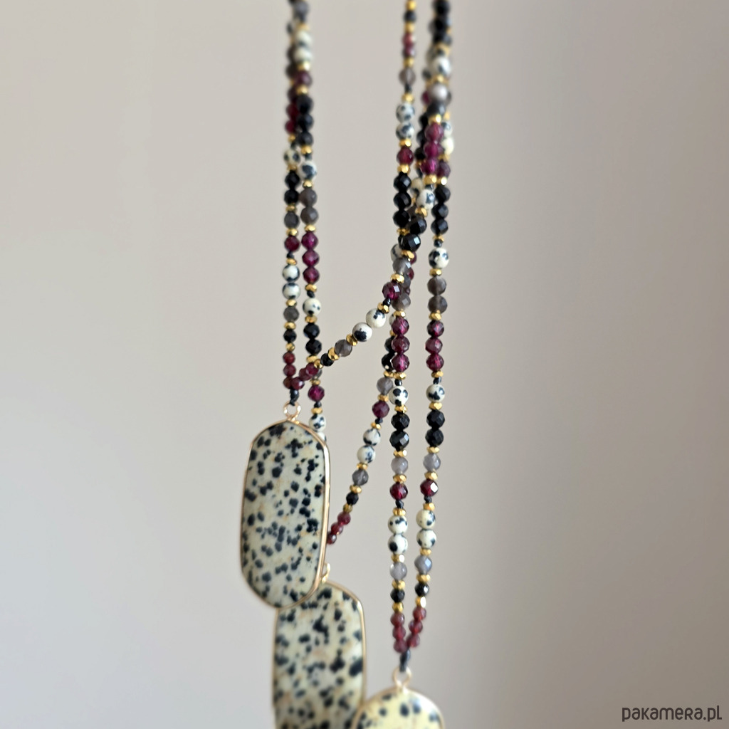 Naszyjnik jaspis dalmatyńczyk, czarny turmalin, granat i hematyt