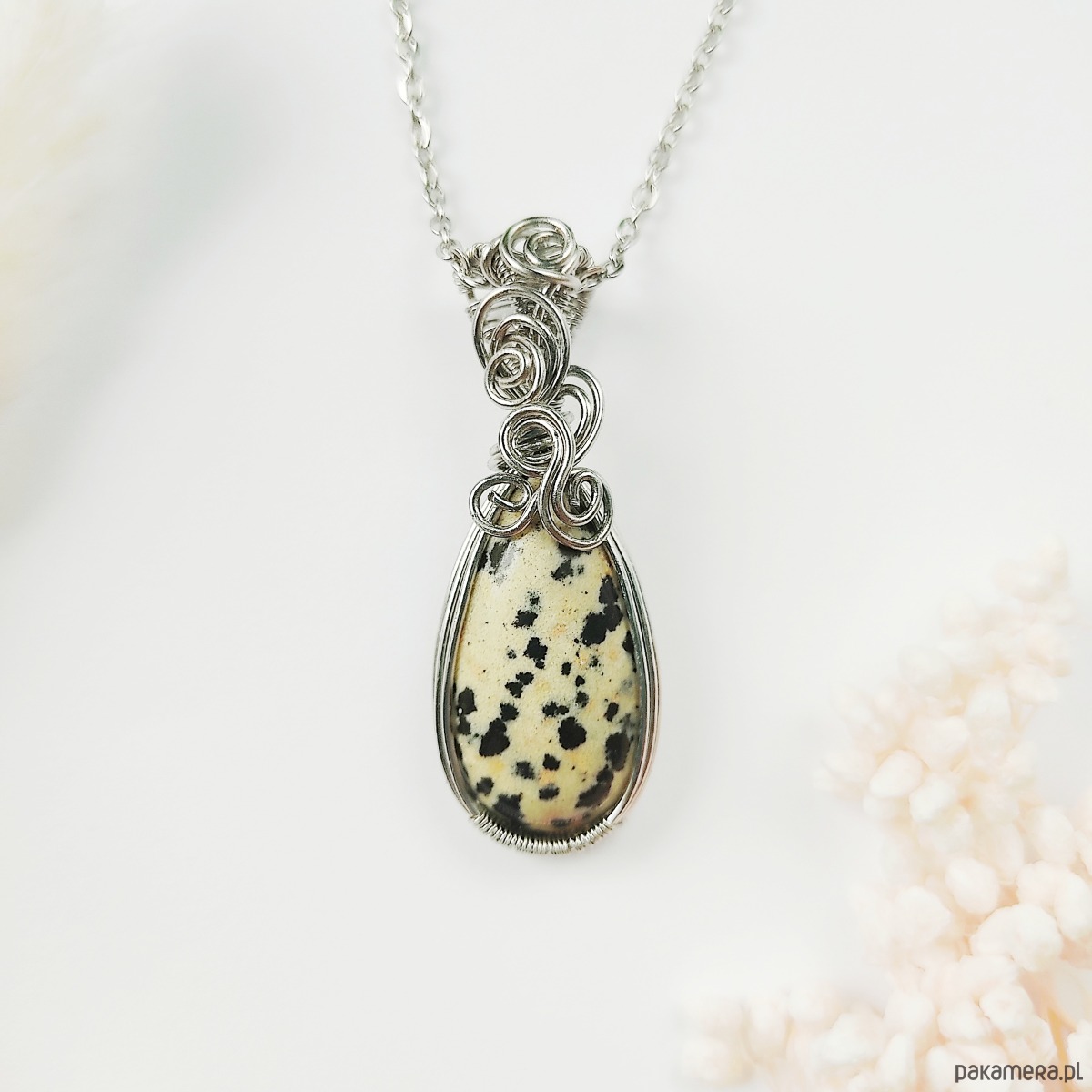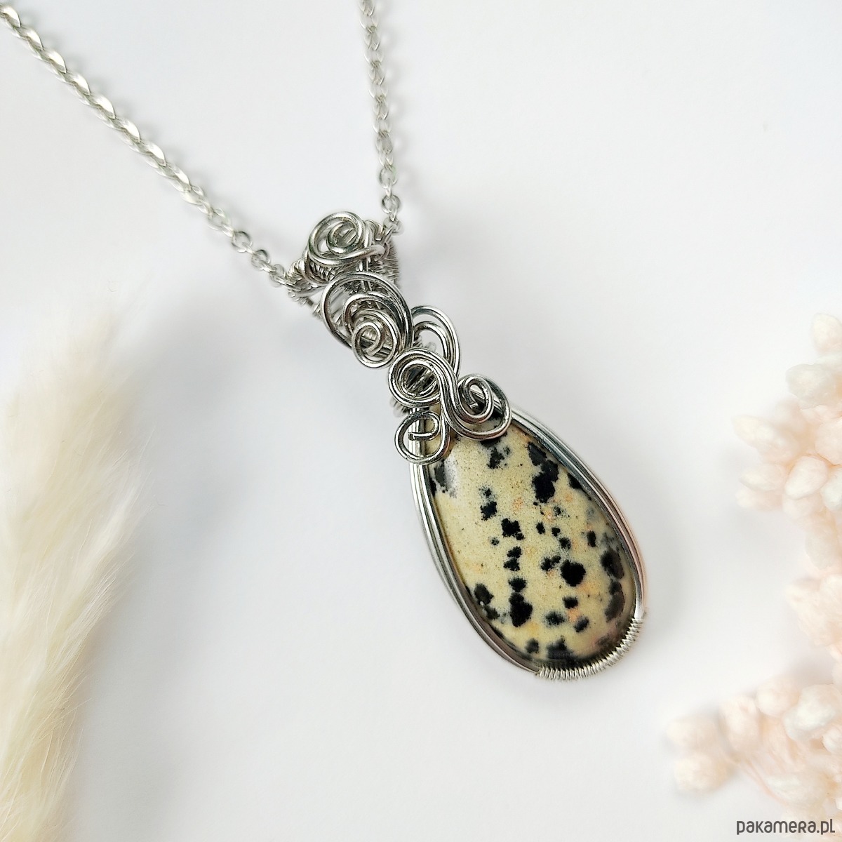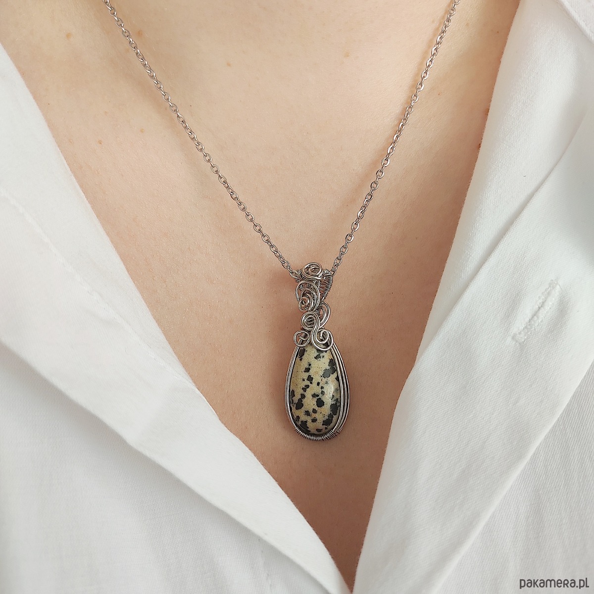 Naszyjnik Jaspis Dalmatyński ręcznie robiony. Wykonany techniką wire wrapping z drutów ze stali chirurgicznej.