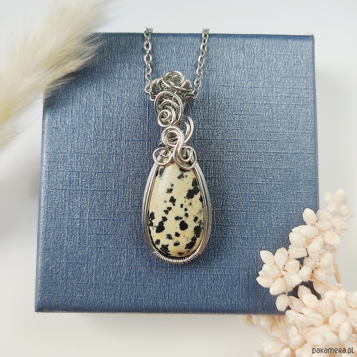 Naszyjnik Jaspis Dalmatyński zapakowany w ozdobne pudełko lub woreczek na biżuterię.