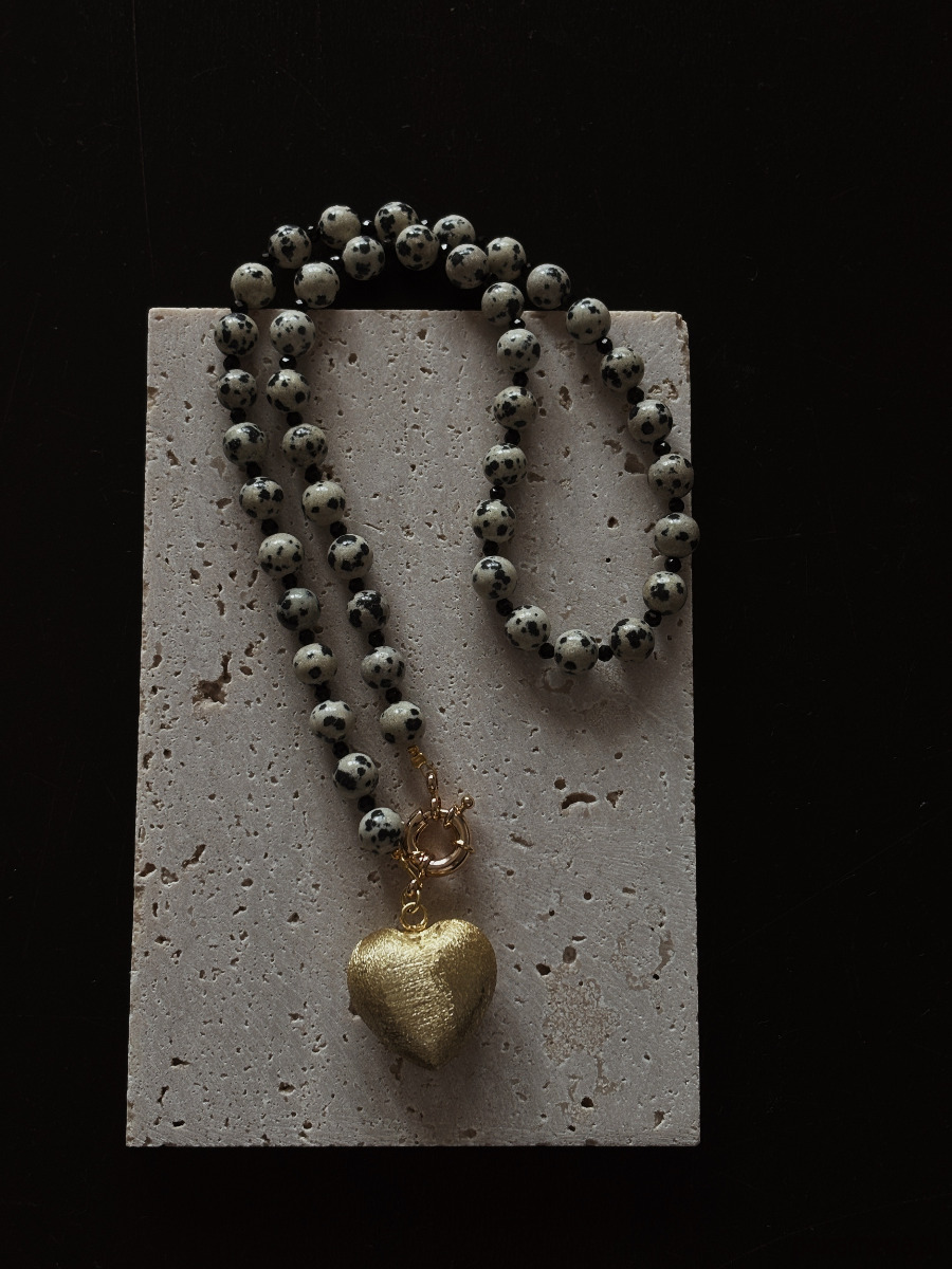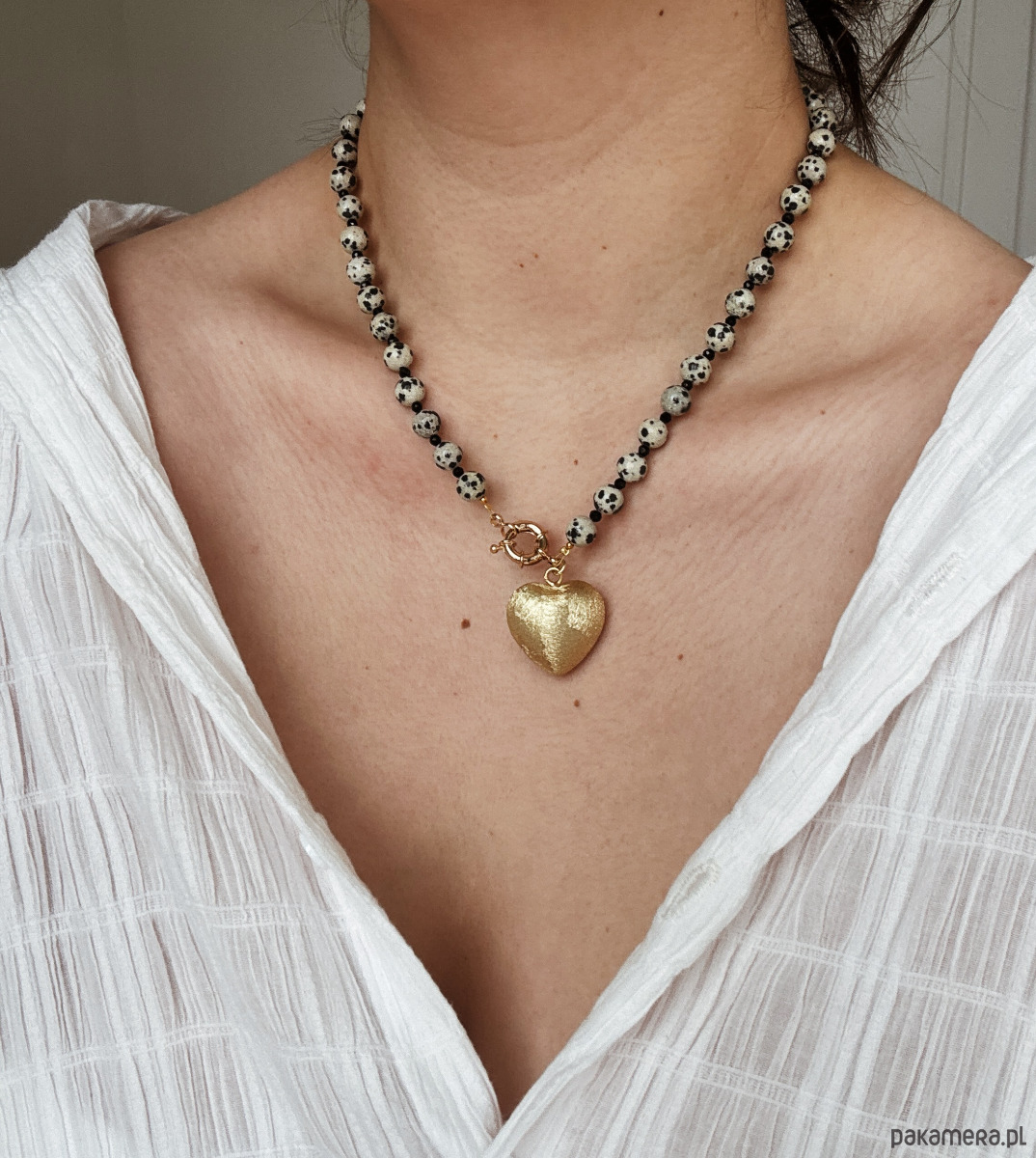 Naszyjnik wykonany jest jaspisu dalmatyńskiego, przeplatamy onyksem fasetowanym i ozdobnym zapięciem. Wisienką na torcie jest duże serce- zawieszka z delikatną strukturą porysowania ( jest lekkie).