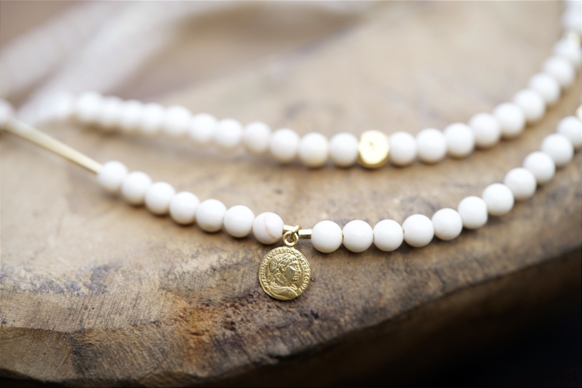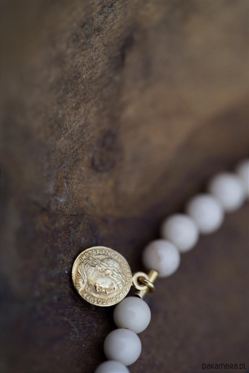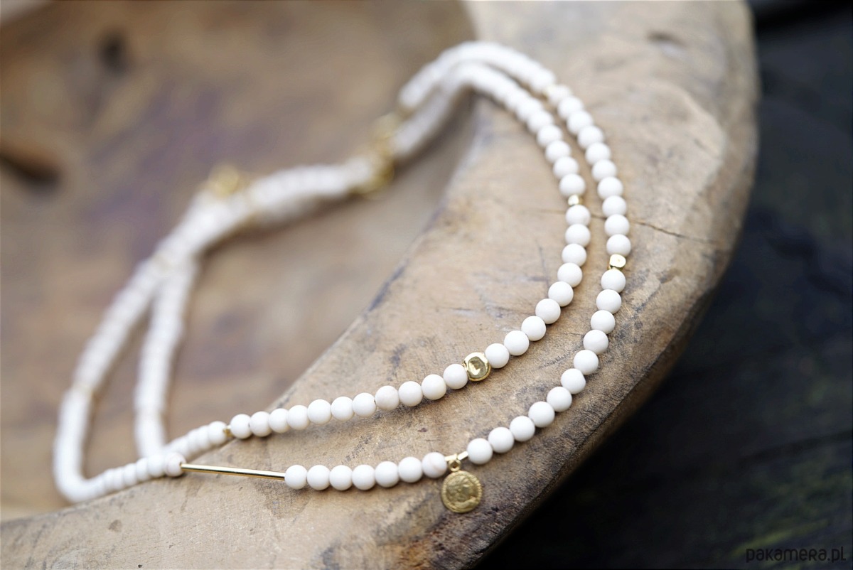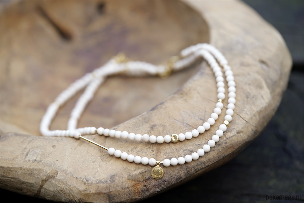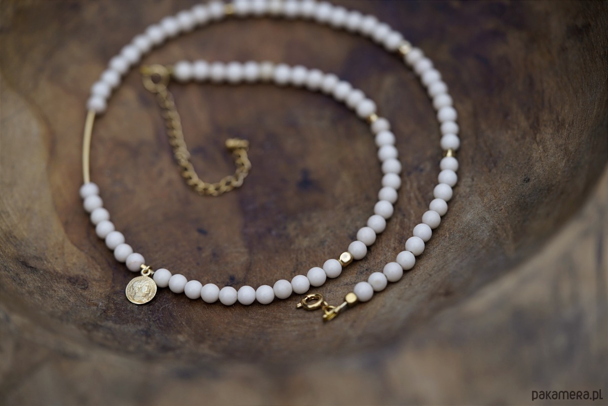 Naszyjnik z jaspisu w odcieniach kremu z elementami ze srebra próby 925 pozłacanego 24 k złotem.