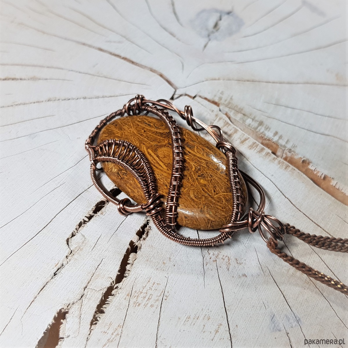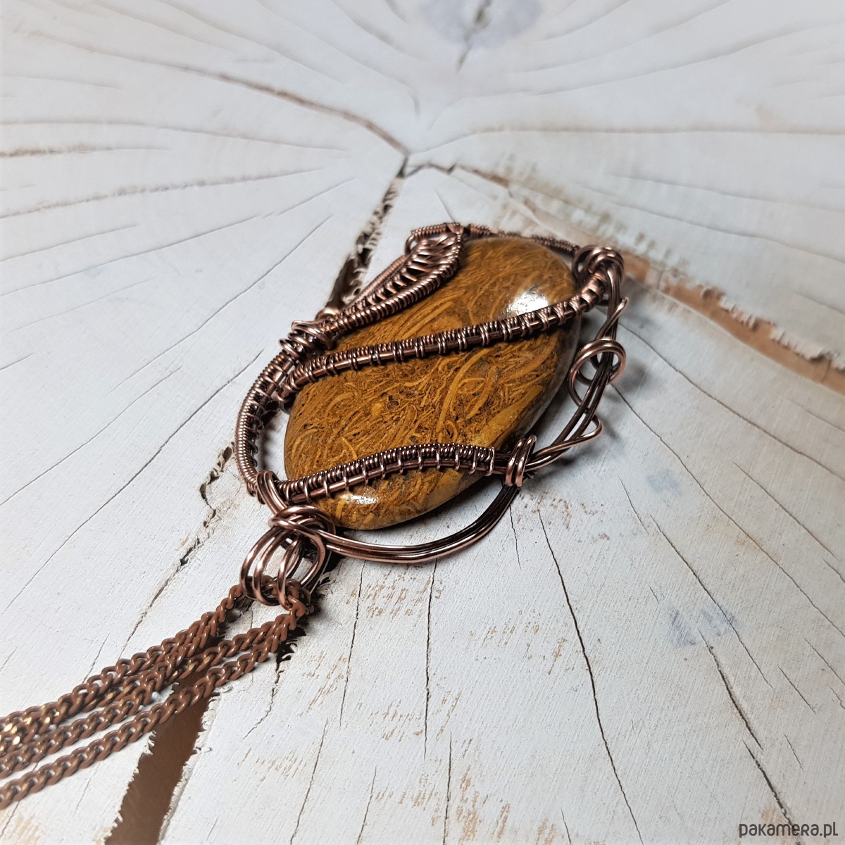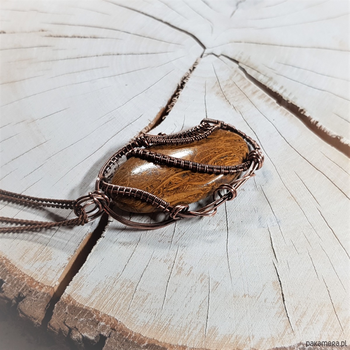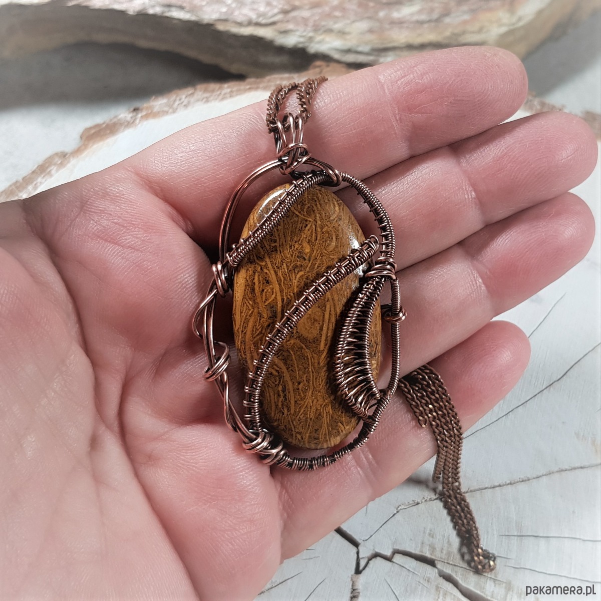 Zawieszka na łańcuszku z naturalnego jaspisu Mariam w kolorze miodowo brązowym. Naszyjnik zrobiony ręcznie z miedzi pracochłonną metodą wire-wrappingu, następnie oksydowany i wypolerowany w celu uzyskania efektu szlachetnego postarzenia. Wymiary naszyjnika 61x36, zawieszony na łańcuszku standardowej długości około 50cm.