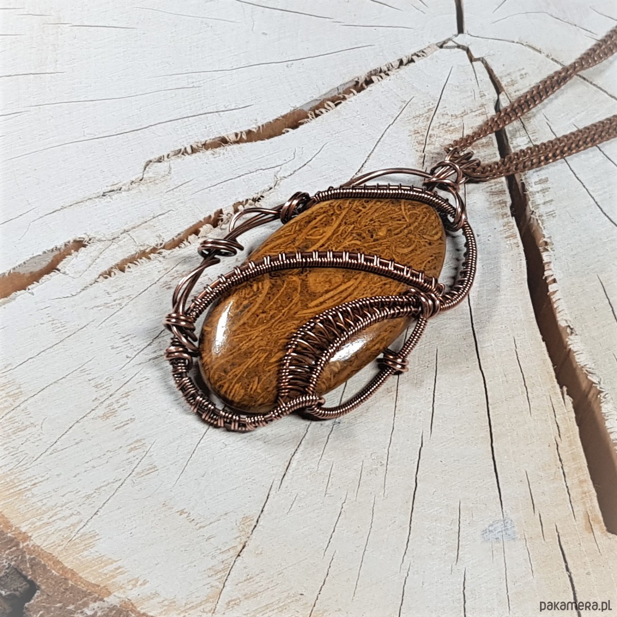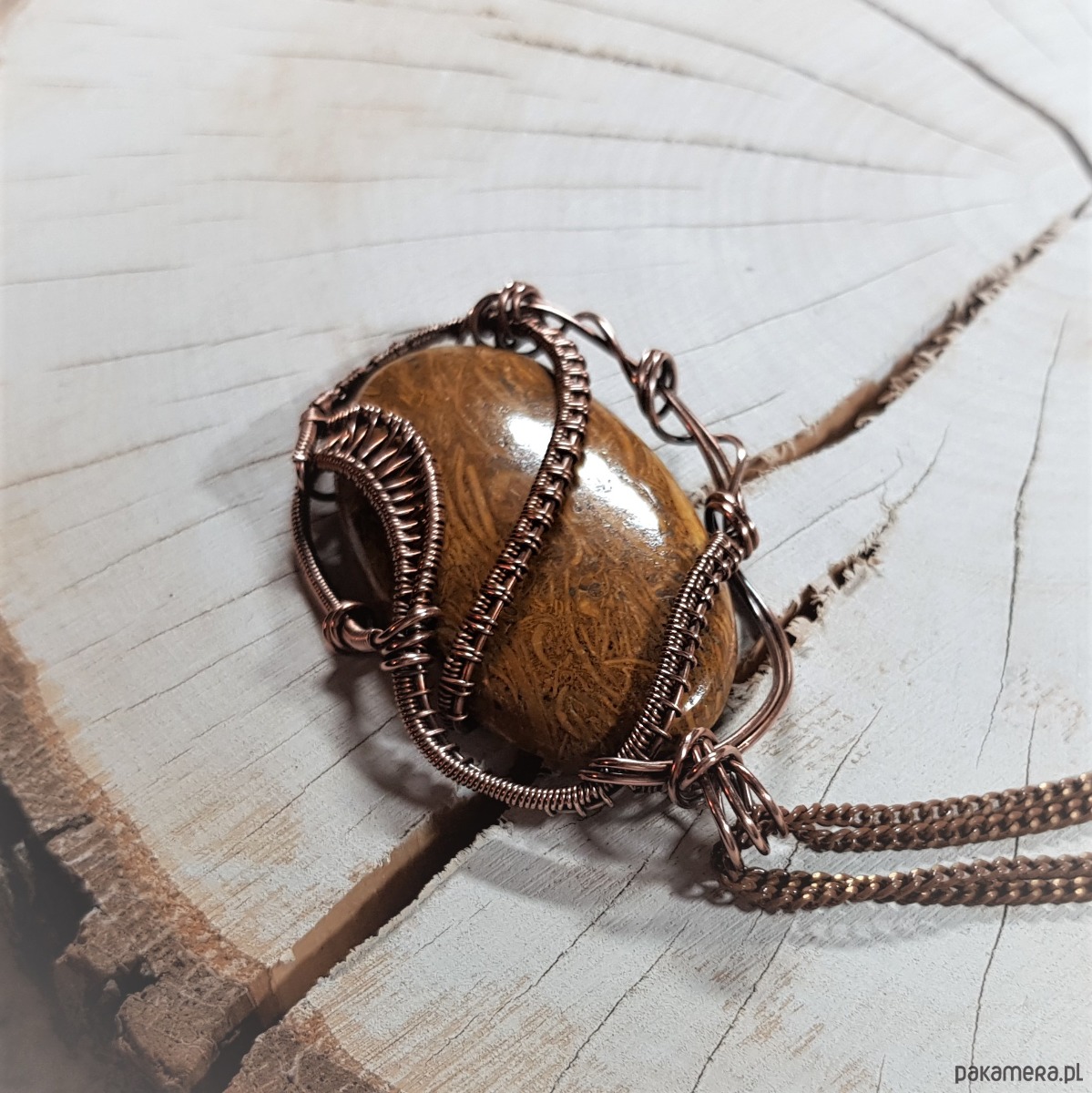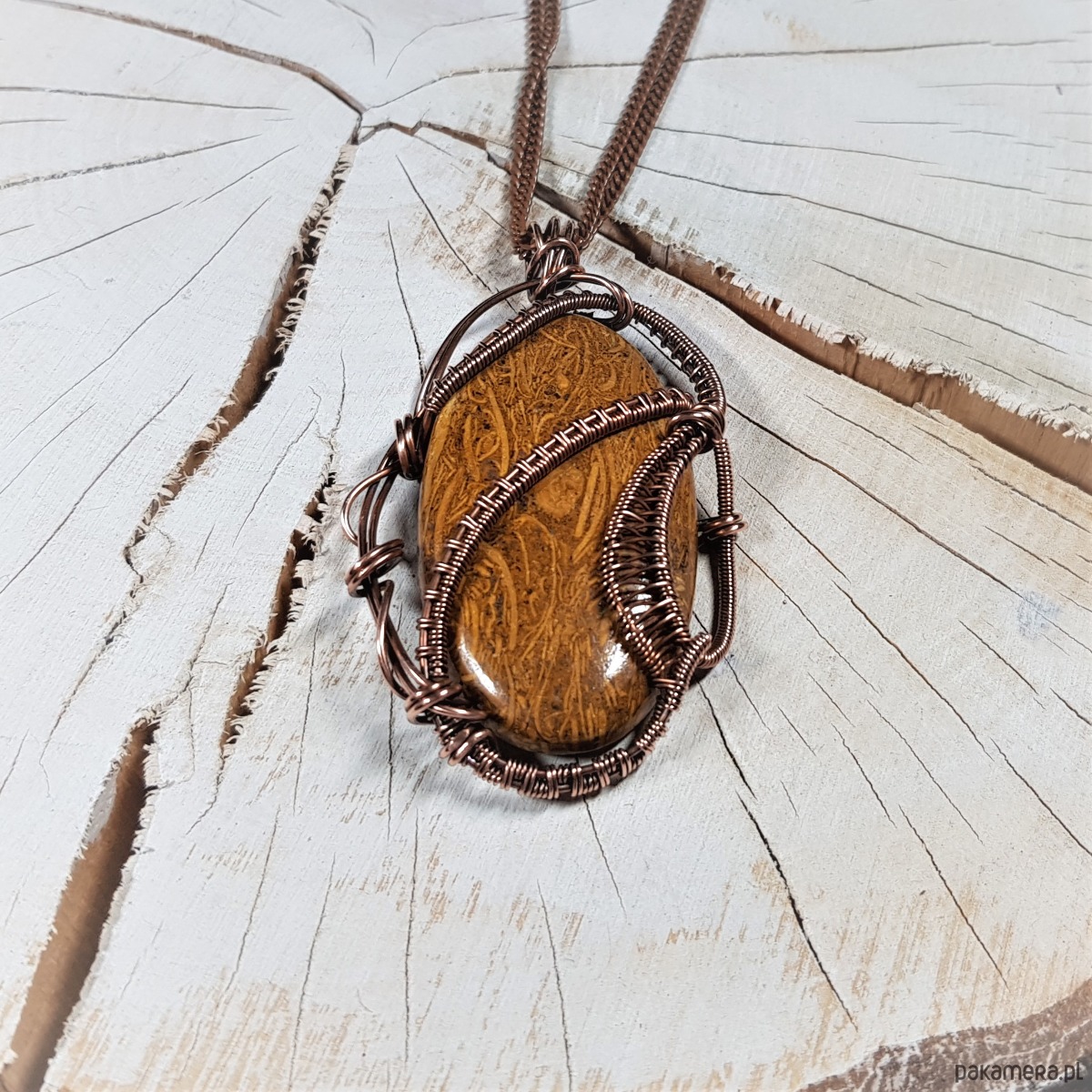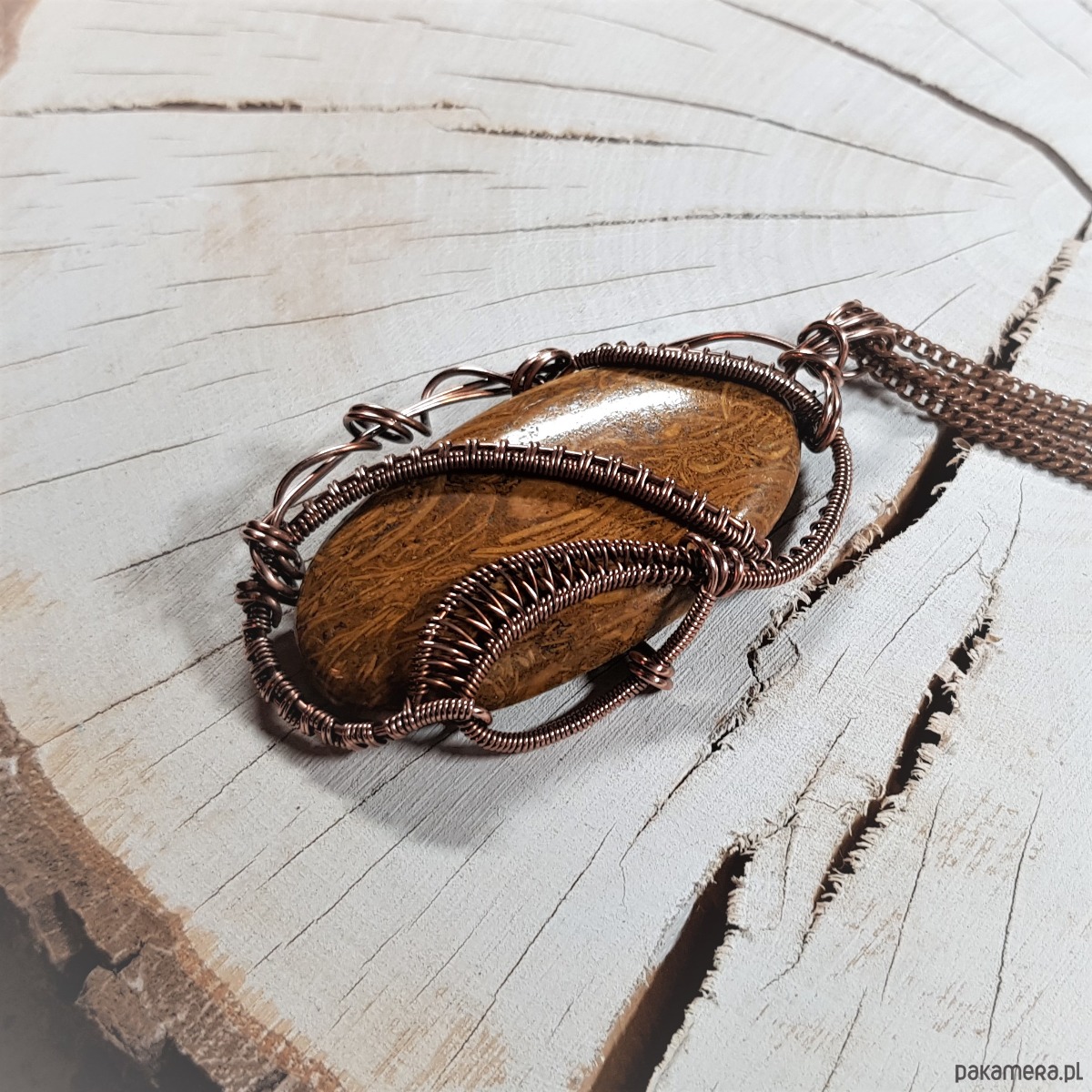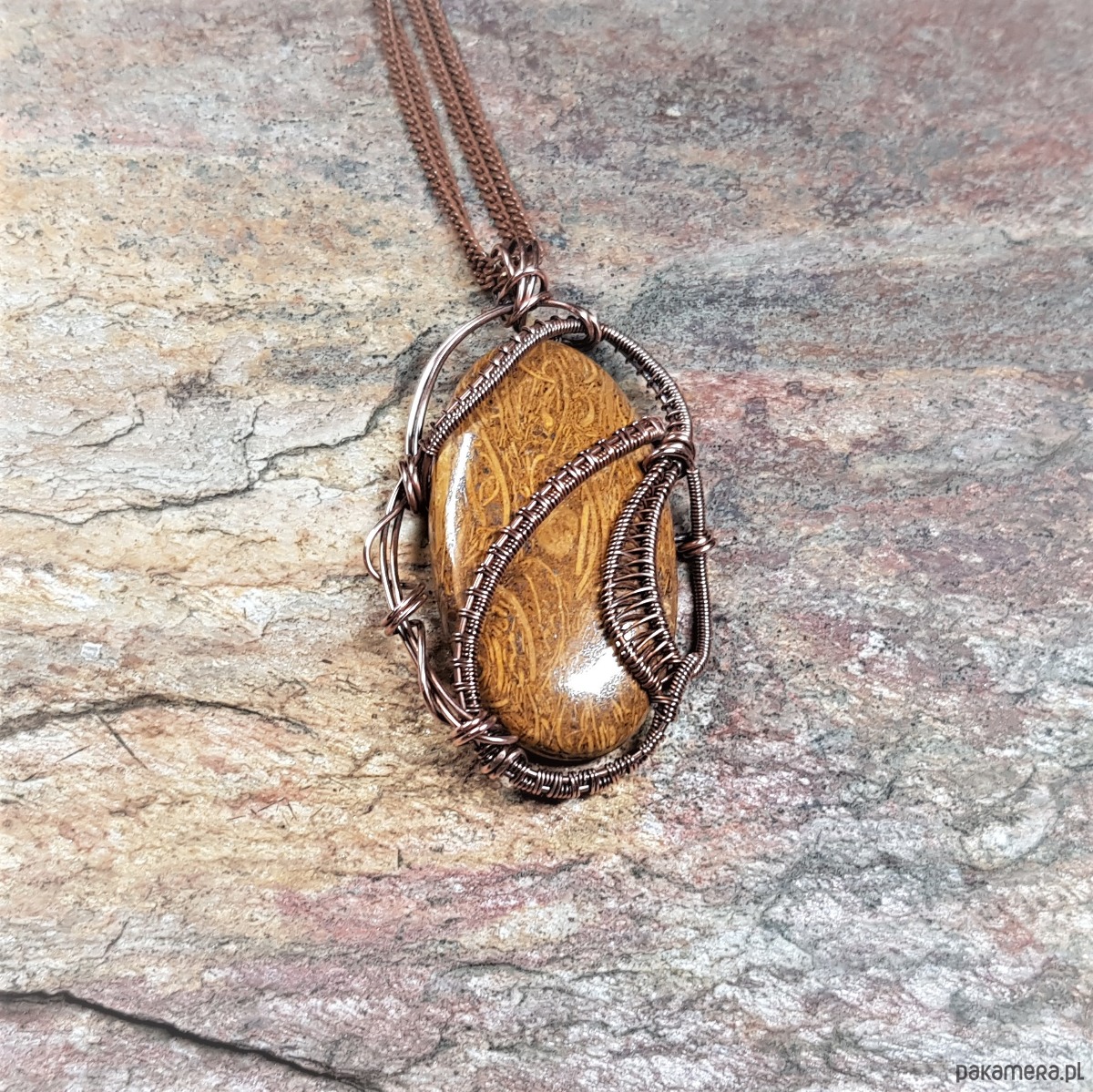 Zawieszka na łańcuszku z naturalnego jaspisu Mariam w kolorze miodowo brązowym. Naszyjnik zrobiony ręcznie z miedzi pracochłonną metodą wire-wrappingu, następnie oksydowany i wypolerowany w celu uzyskania efektu szlachetnego postarzenia. Wymiary naszyjnika 61x36, zawieszony na łańcuszku standardowej długości około 50cm.