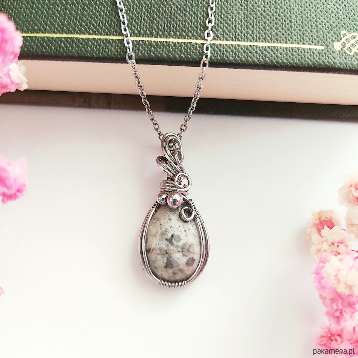 Naszyjnik Jaspis Szary stal chirurgiczna wisiorek handmade wirewrapping