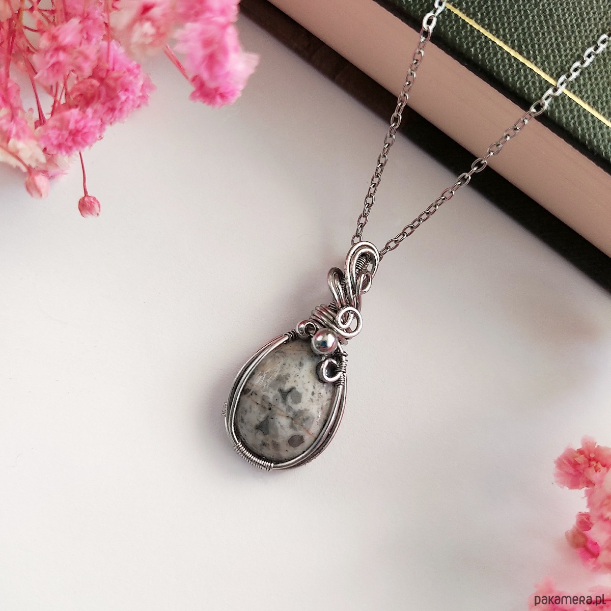 Naszyjnik Jaspis Szary ręcznie wykonany z drutów ze stali chirurgicznej metodą wire wrapping.