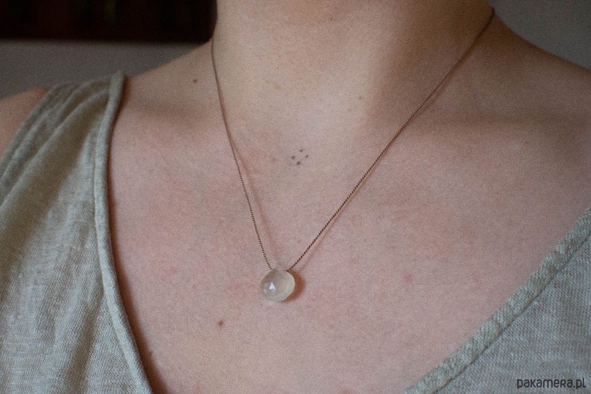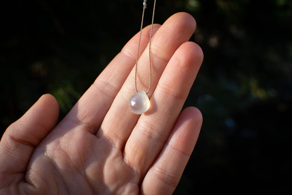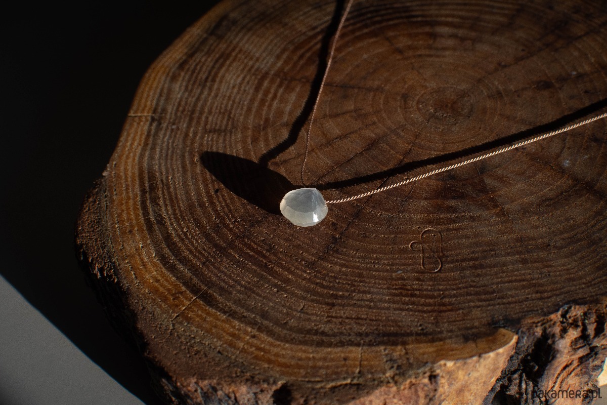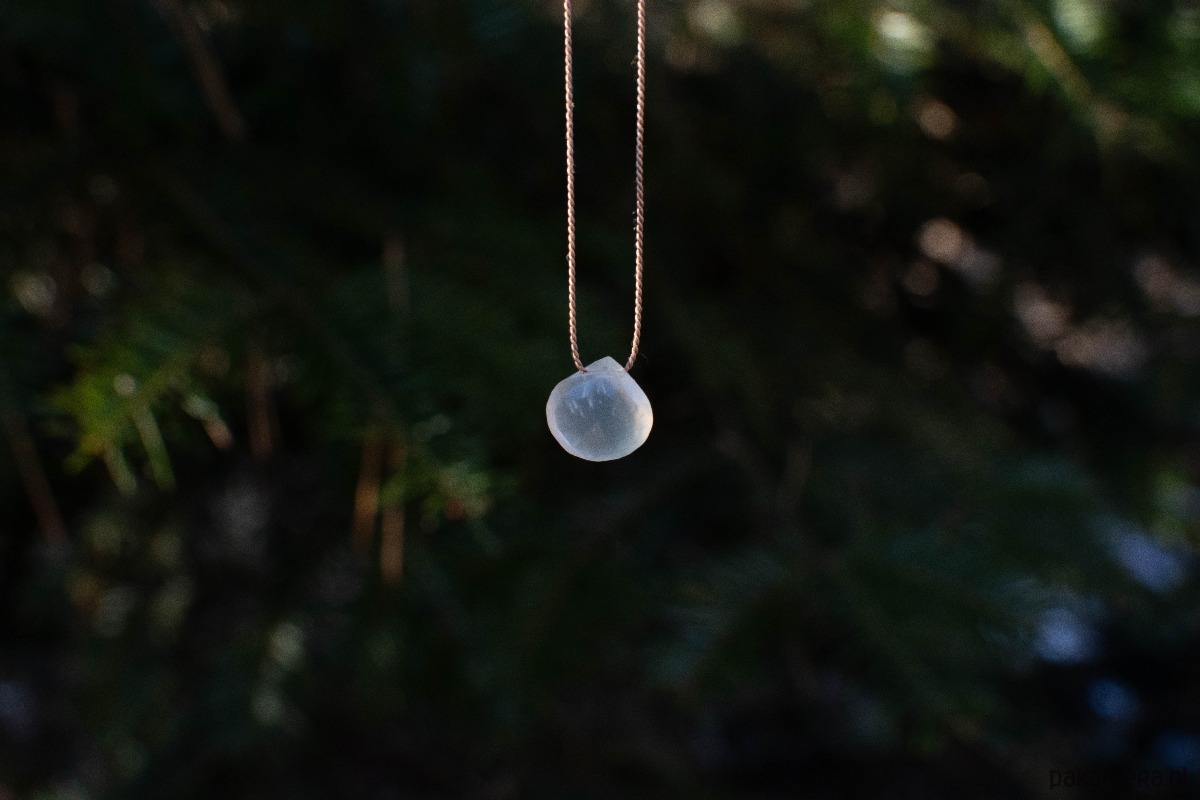 Mleczny kamień księżycowy w kształcie serca, unosi się na jedwabnej nici. Klasyczny, minimalistyczny i subtelny efekt.