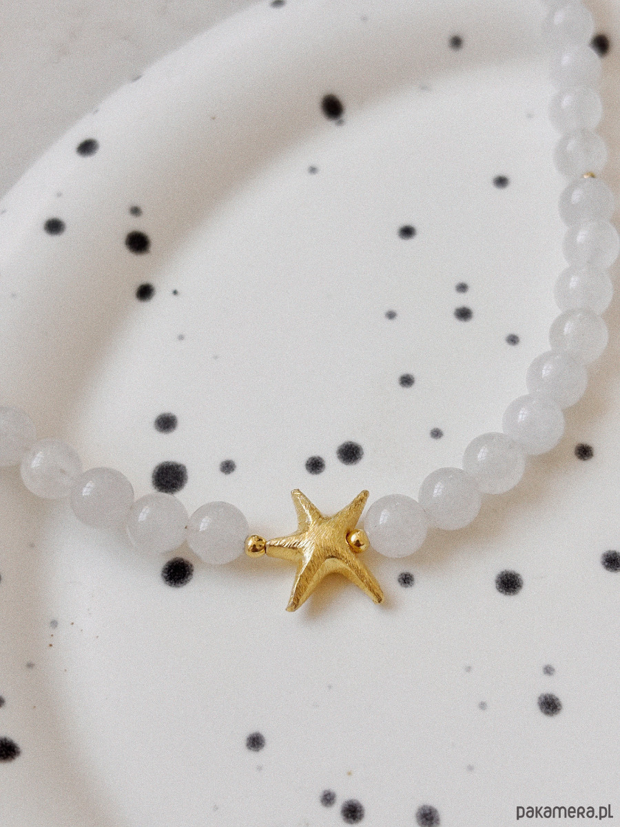 Naszyjnik wykonany jest z kamienia księżycowego z zawieszką pozłacaną 24k złotem w kształcie gwiazdy.