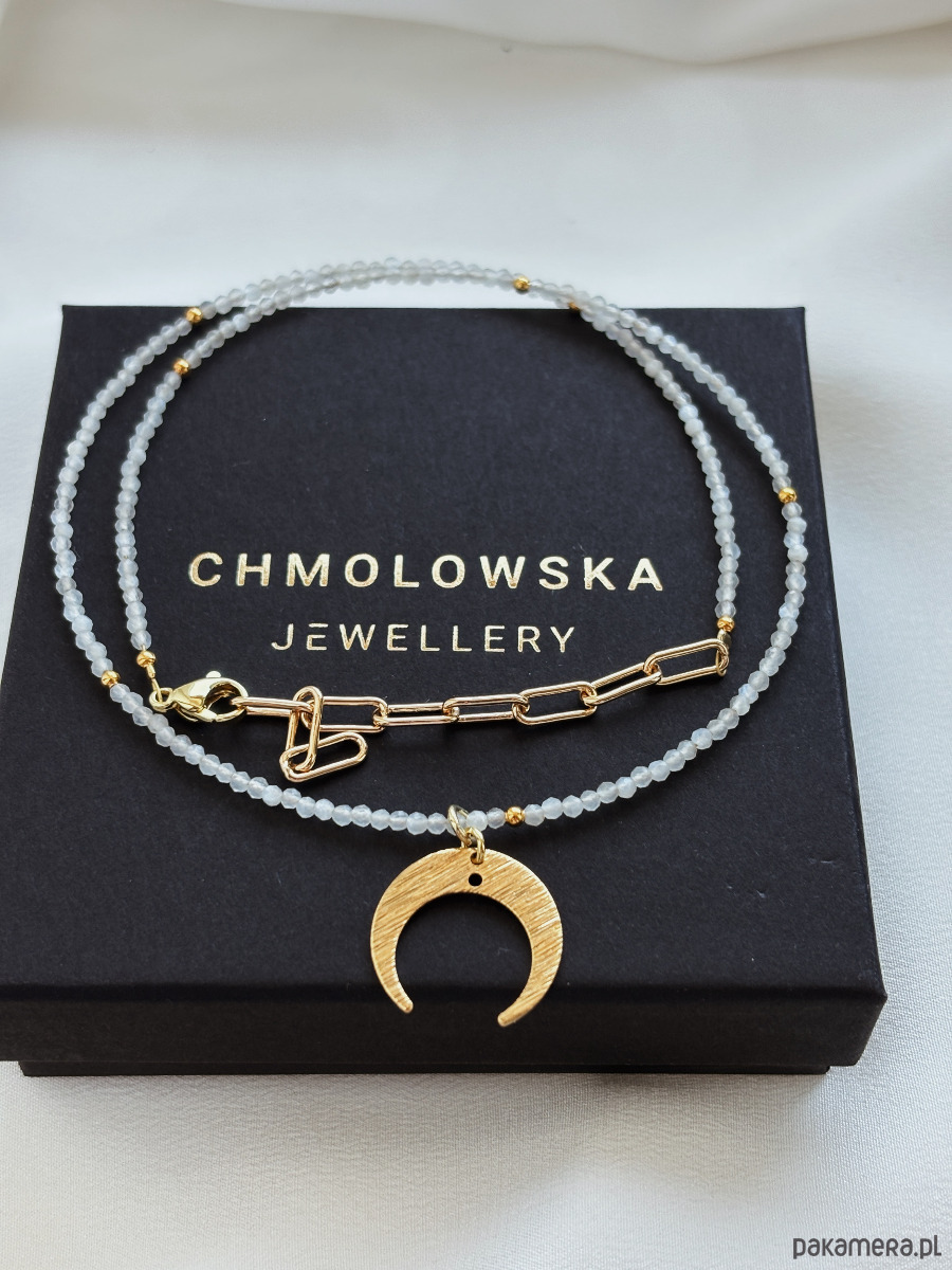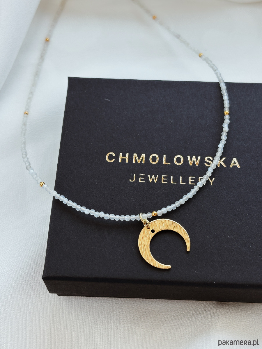 Naszyjnik wykonany jest na lince jubilerskiej z Kamienia Księżycowego ( 2mm fasetowane kulki) przeplatany pozłacanymi kulkami; zawieszki księżyca i zapięcia, łańcuszka rodowanych złotem.