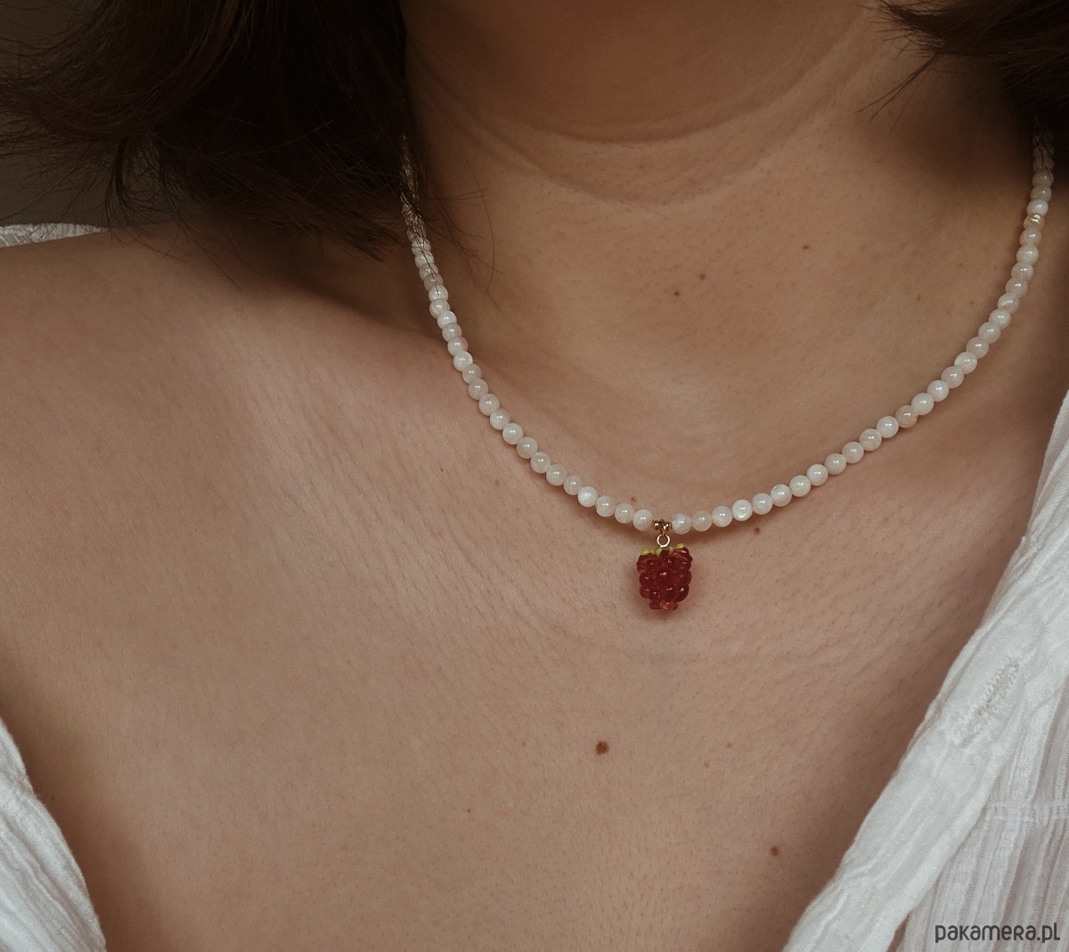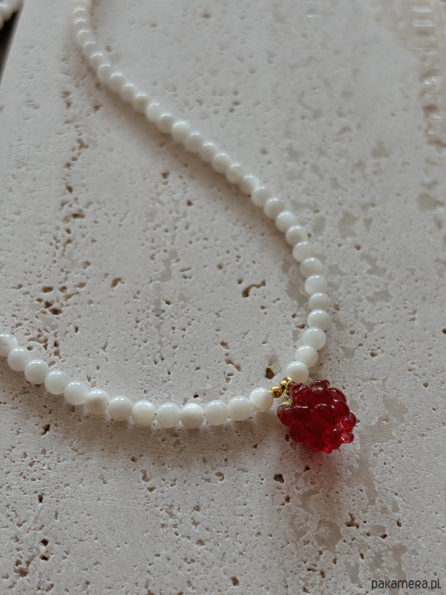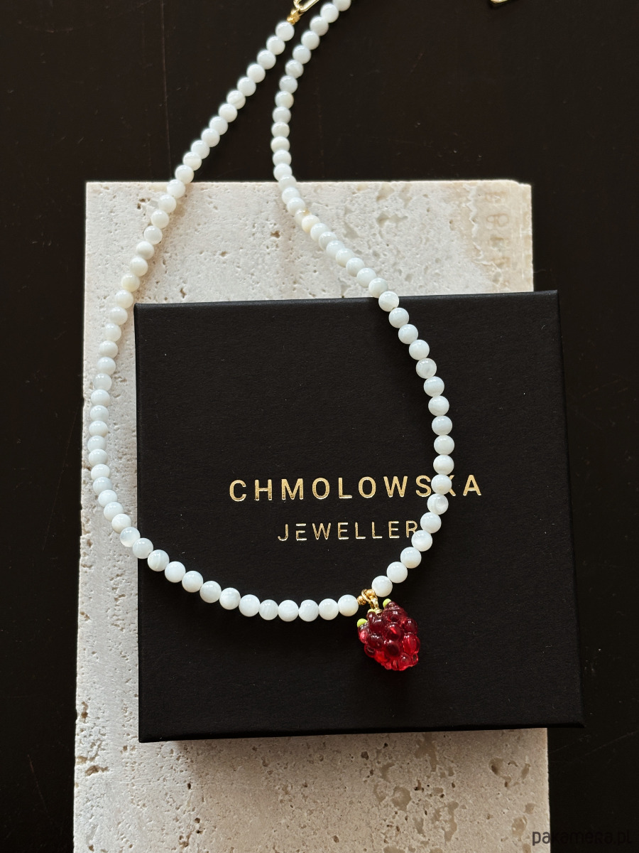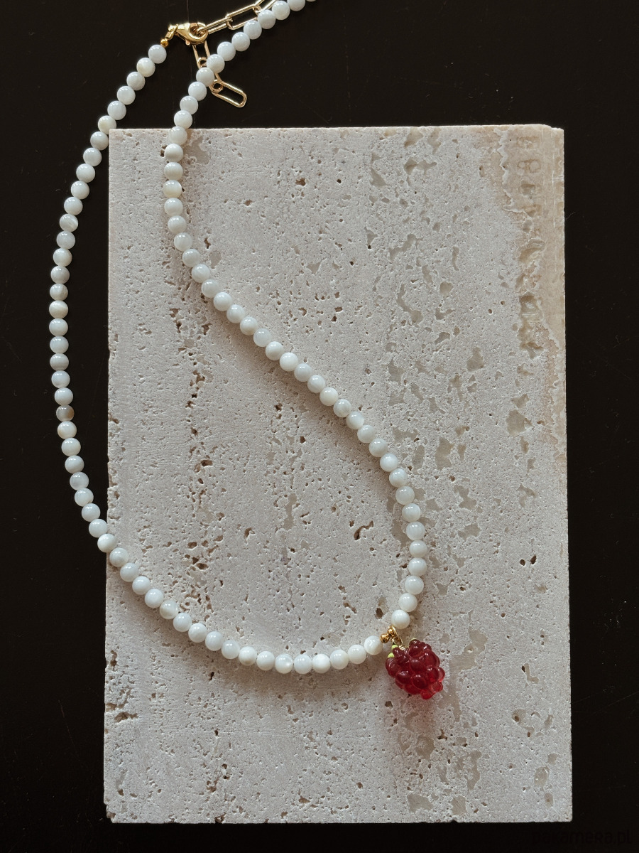 Naszyjnik wykonany jest na lince jubilerskiej z Kamienia Księżycowego, pozłacanego zapięcia i łańcuszka oraz maliny szklanej.
