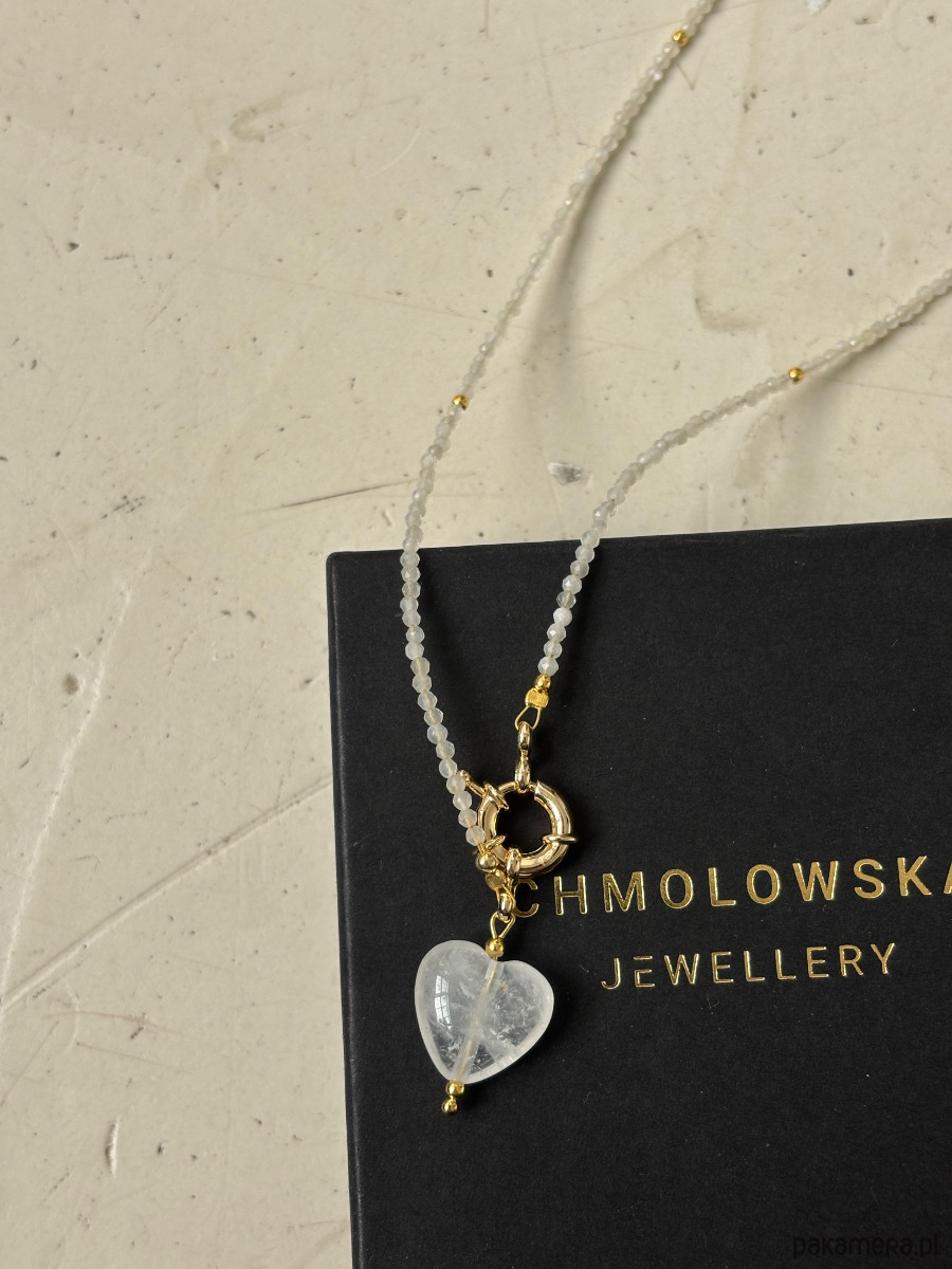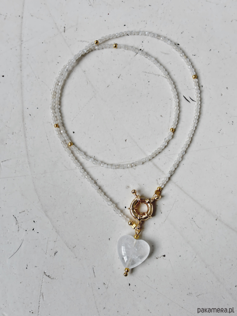 Naszyjnik wykonany jest na lince jubilerskiej z użyciem kamienia księżycowego, zapięcia rodowanego złotem i serca z kryształu górskiego.