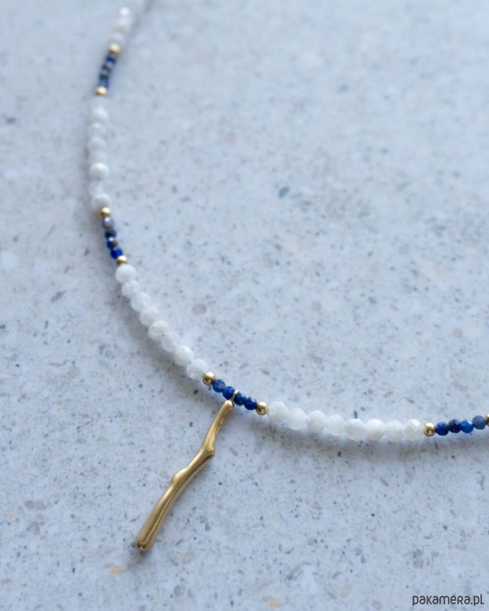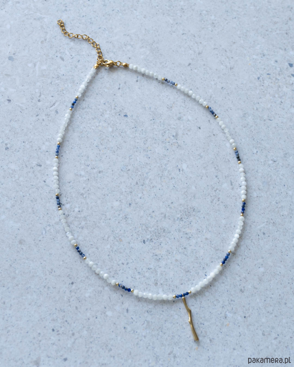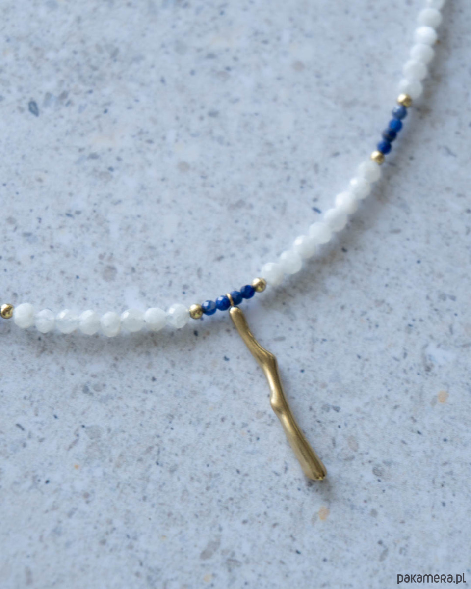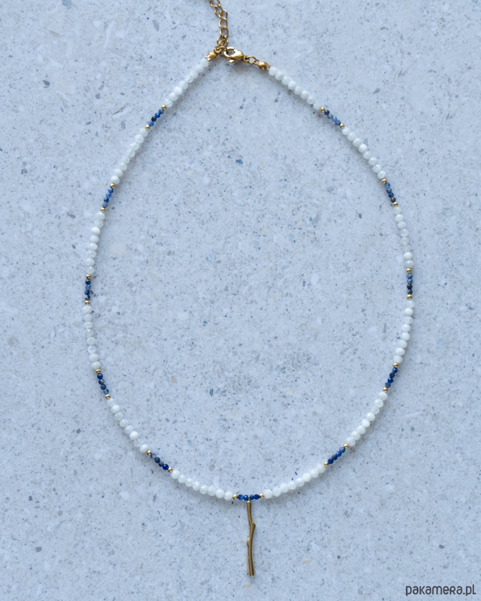 Naszyjnik z kamienia księżycowego i sodalitu. Zapięcia, przekładki i zawieszka w kształcie patyczka koralowego ze stali chirurgicznej w kolorze złotym.