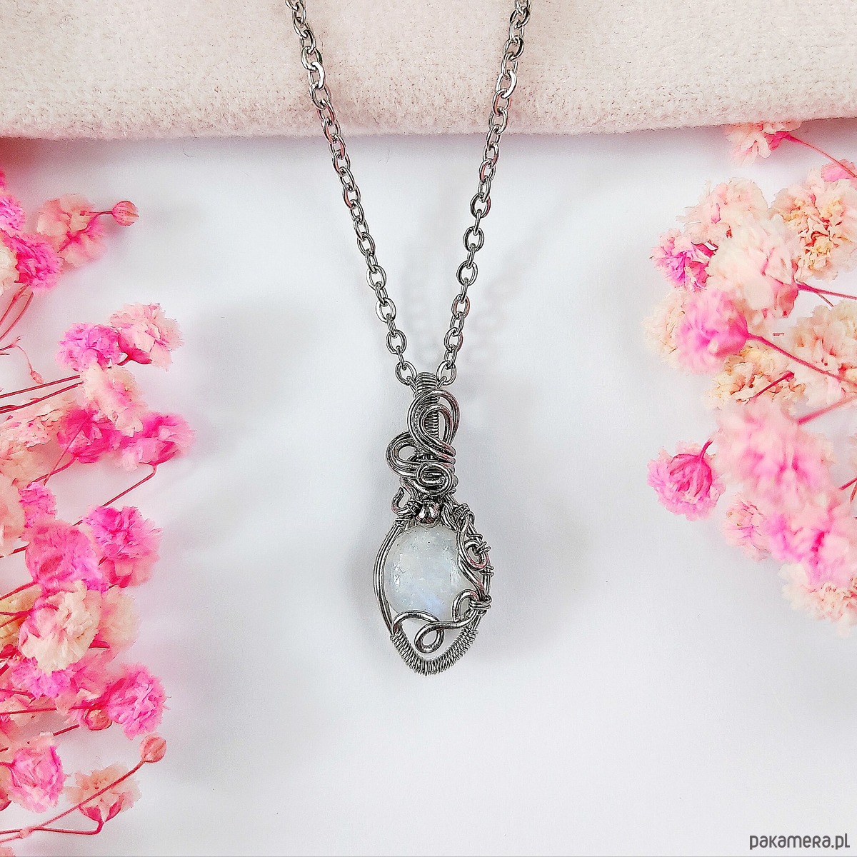 Naszyjnik Kamień Księżycowy ręcznie robiony. Wykonany techniką wire wrapping z drutów ze stali chirurgicznej.